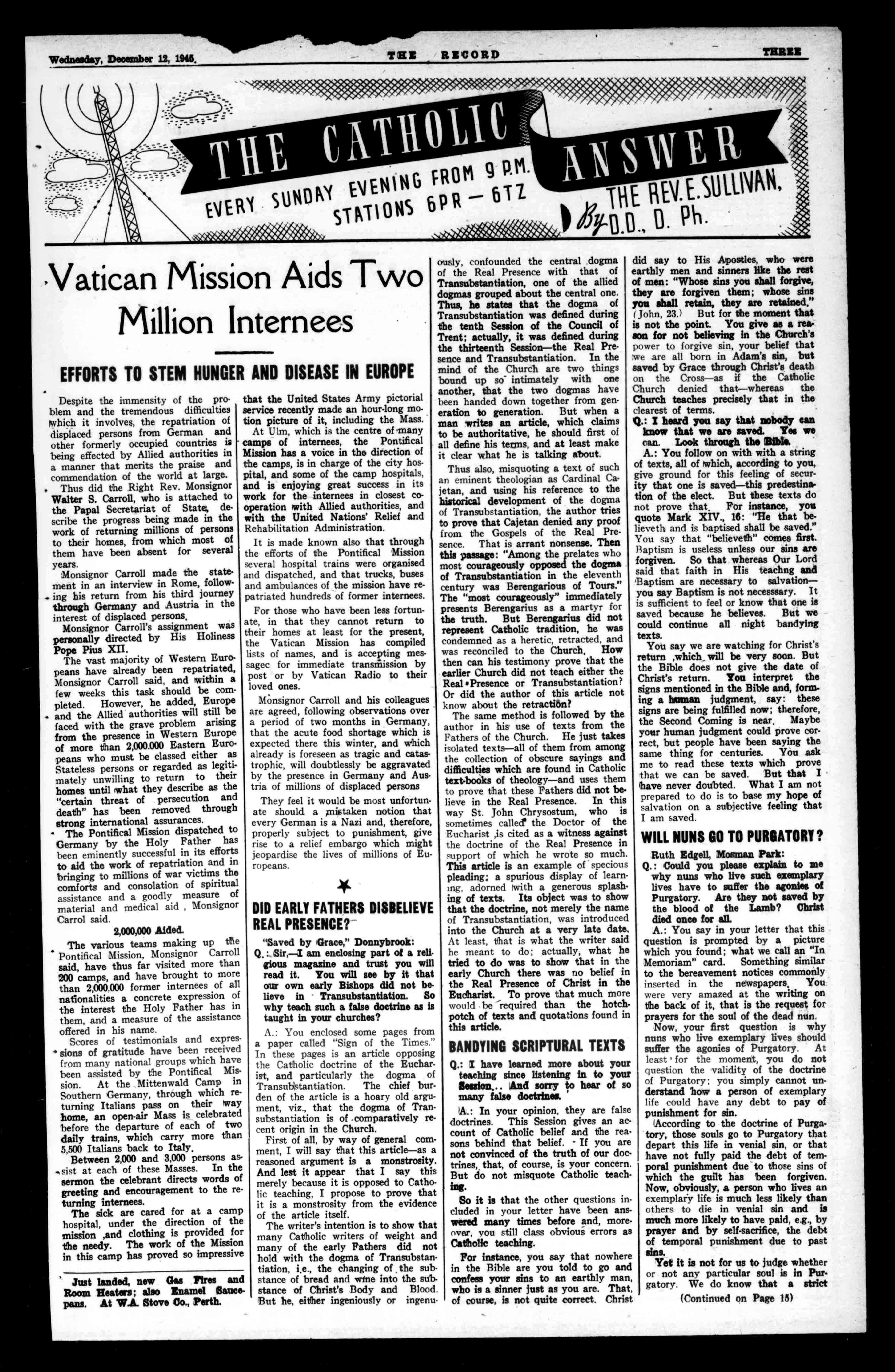 A.:Youenclosedsomepagesfrom apapercalled"SignoftheTimes." Inthesepagesisanarticleopposing theCatholicdoctrineoftheEucharist,andparticularlythedogmaof Transubstantiation.Thechiefburdenofthearticleisahoaryoldargument,viz.,thatthedogmaofTransubstantiationisofcomparativelyrecentoriginintheChurch.
