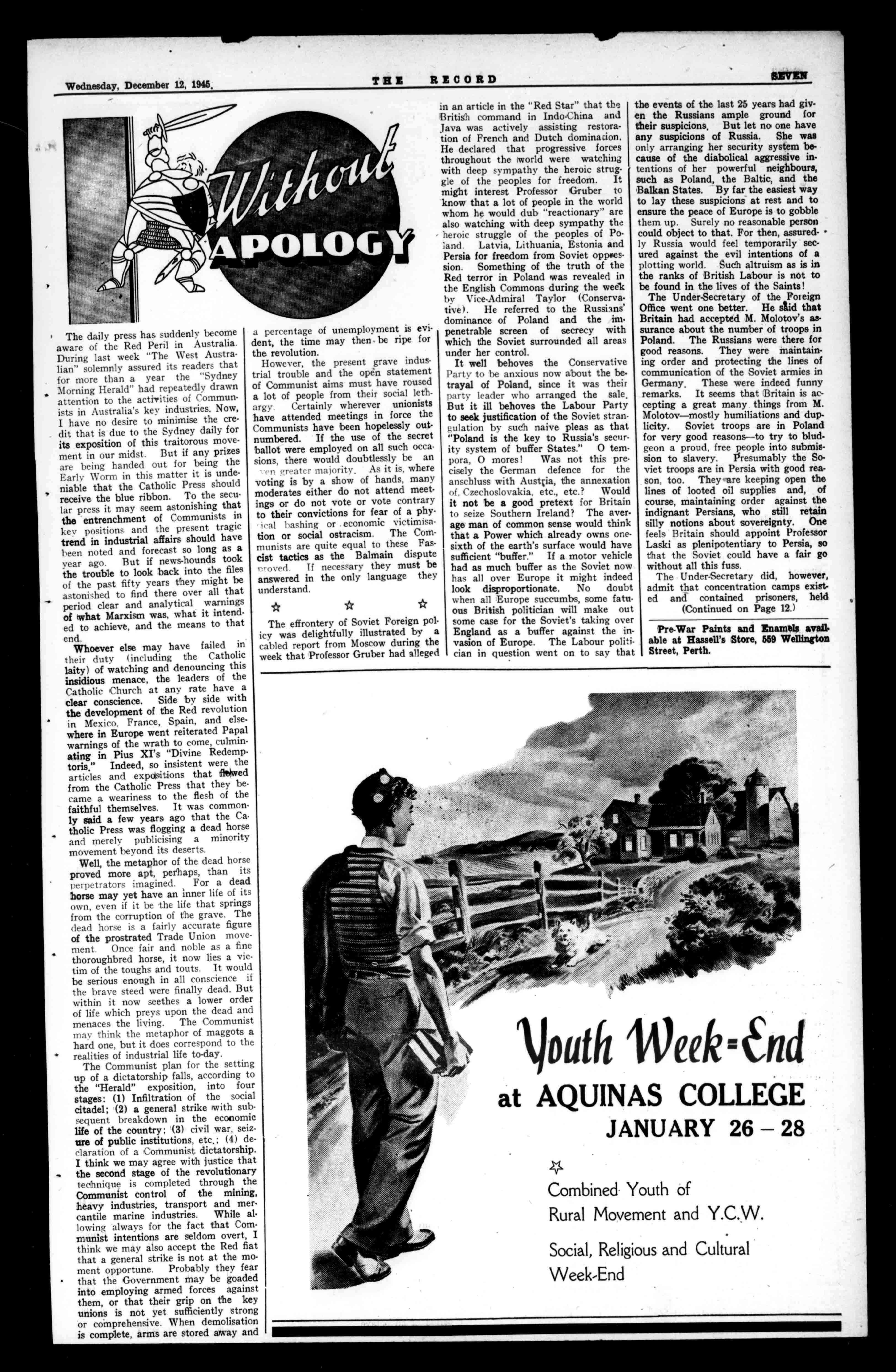 Inviewofthepresentindustrialanarchyinthiscountry,largelyinspiredbyCommunists(evenifithasnowgotbeyondthedirectivecontrolofits organisers),andinviewoftherecentopenavowalsofCommunistsaims,the articlebelowwillbeoftopicalinterest.TheCatholicpresshasnotinfrequentlybeenaccusedinthepast(evenbyitsfriends)ofmakingabogeyof Communism,butthepresentcrisisaffordsamplejustificationofearlierinsistentwarnings.We,therefore,makenoapologyforwhatfollows: