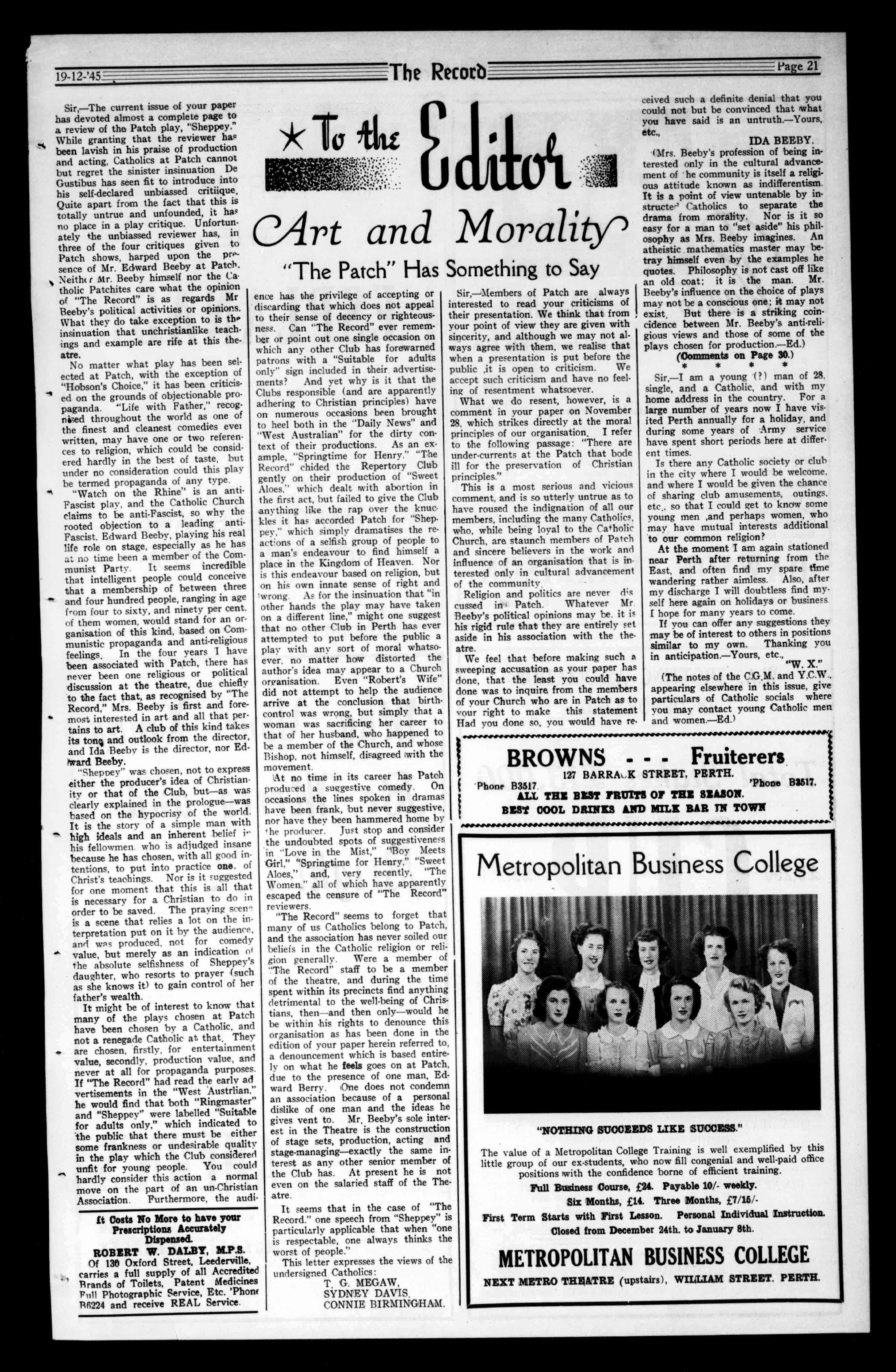 Yourcorrespondents'lettermakesa greatmouthfulofthefactthatmany oftheplayschosenatPatchhave beenchosenbyaCatholic(notarenegade),HadIbeenintheirposition Iwouldhavebeenpromptedtocon' -althisfactoutofloyaltytomy Church,astheplayschosendonotreflectcreditablyuponthereligiousoutlookofthepersonconcerned.Asfor labellingtheplayadvertisements"Suitableforadultsonly,"thePatchisto becommendedonitsgoodintentions, anditishopedthattheydonotpermittheirmembersoftenderageto attendoractinsuchplays.Inany caseonesurelydoesnotseriouslyanticipateaninfluxofchildrentowitnessaplayperformance.Thereis rnotheraspectto,uchwarningsalso: theyactasmagnetstothemorbidminded,andinthissensehavea positivepublicityvalue.Furthermore,itisanewangletomethat thereligiousfaithandmoralsofadults neednoprotection.IfPatchthinks itsnewspaperwarningsacquititofthe moralobligationtochooseitsplays carefully,ithasanotherthinkcoming. WereIreallymakingsinisterinsinuationsIcouldinterpretthe"Suitable foradultsonly"asanattemptonthe