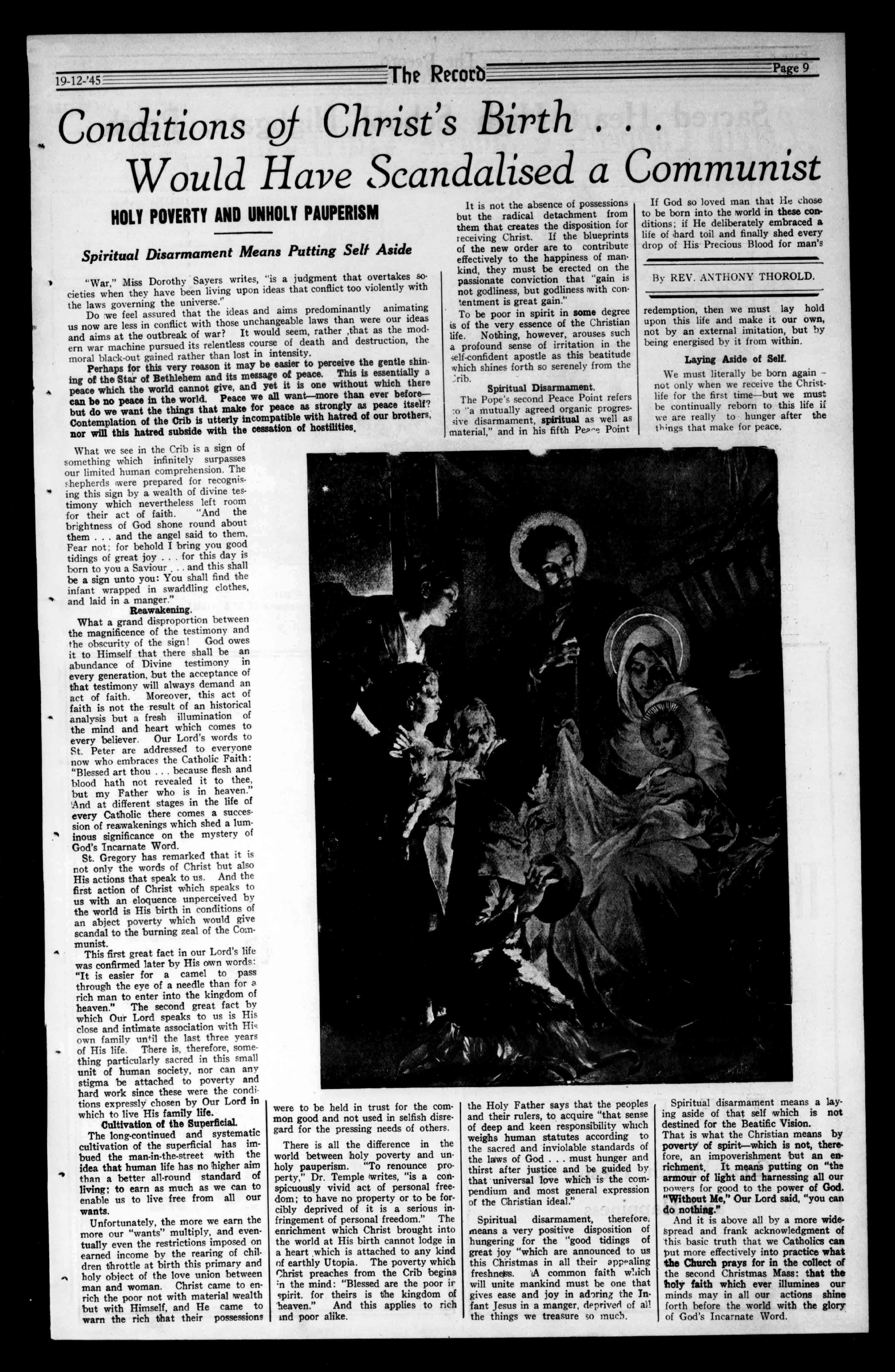 "ThisOhildisset forasignthatshallbecontradicted." time,theplace,thecircumstacesofthe Nativityallseemparticularlydesignedasadownrightcontradictionand denialofthevaluessetuponsuch thingsbytheworldly, Nordoesacontroversynecessarily destroythatpeaceamongmenof goodwillwhichthespiritoftheChristChildaimstoreleaseintheworld.For peace,likealltheothervirtues,has itsfoundationintruth,andcontroversy(intheideal,anyhowrepresentsthestruggleofhumanmindsto attaintruth.Buttruth,totheChristian.isaverydifferentthingfrom (whatthedisciplesofMammoncall realism.FortheChristianisableto gobeyondthenatureofthings-as-theyseemandseethemastheyreallyare