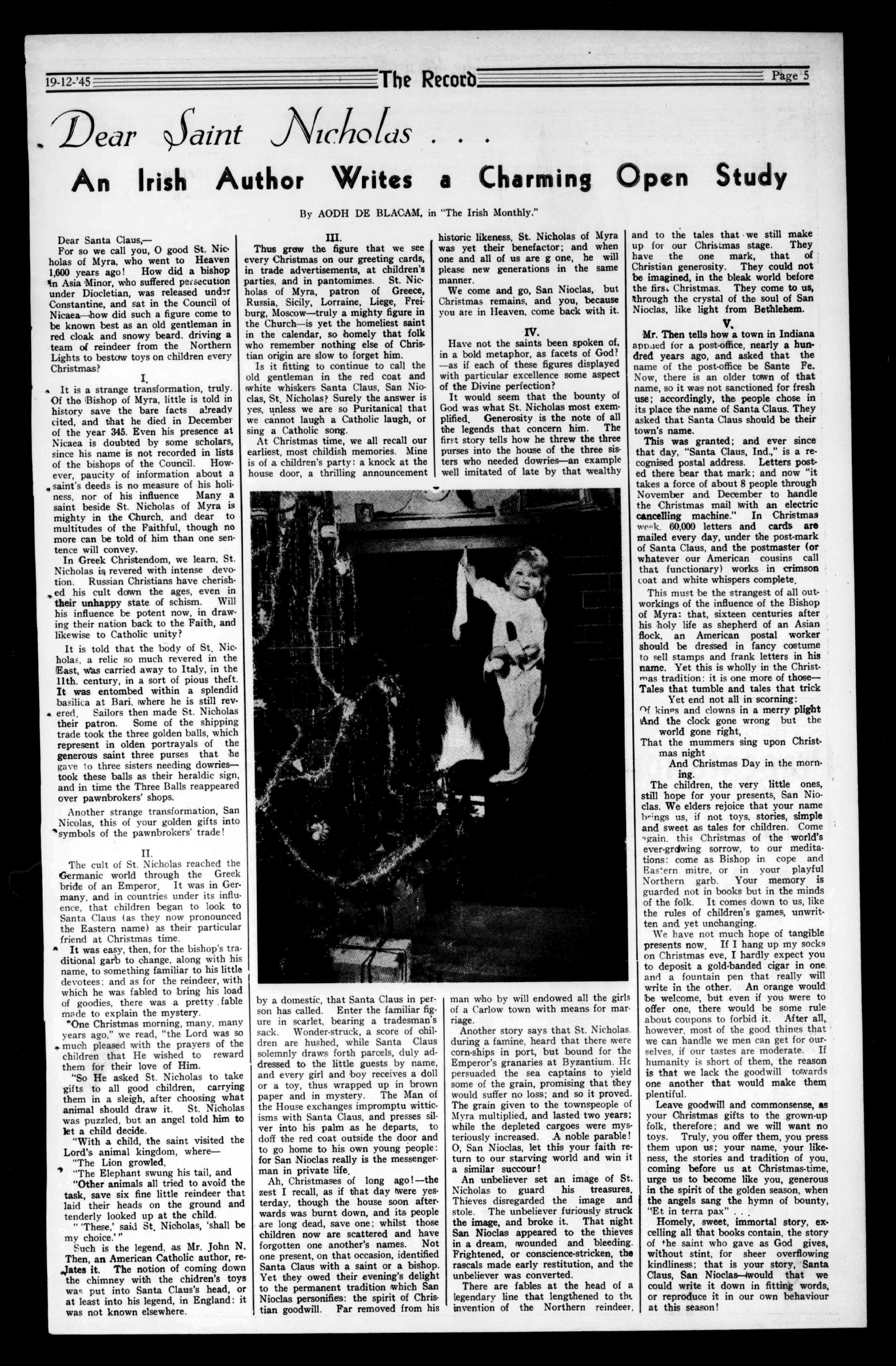 ByAODHDEBLACAM,in"TheIrishMonthly.Thusgrewthefigurethatwesee everyChristmasonourgreetingcards, intradeadvertisements,atchildren's parties,andinpantomimes.St.NicholasofMyra,patronofGreece, Russia,Sicily,Lorraine,Liege,Freiburg,Moscow-trulyamightyfigurein theChurch-isvetthehomeliestsaint inthecalendar,sohomelythatfolk whoremembernothingelseofChristianoriginareslowtoforgethim.