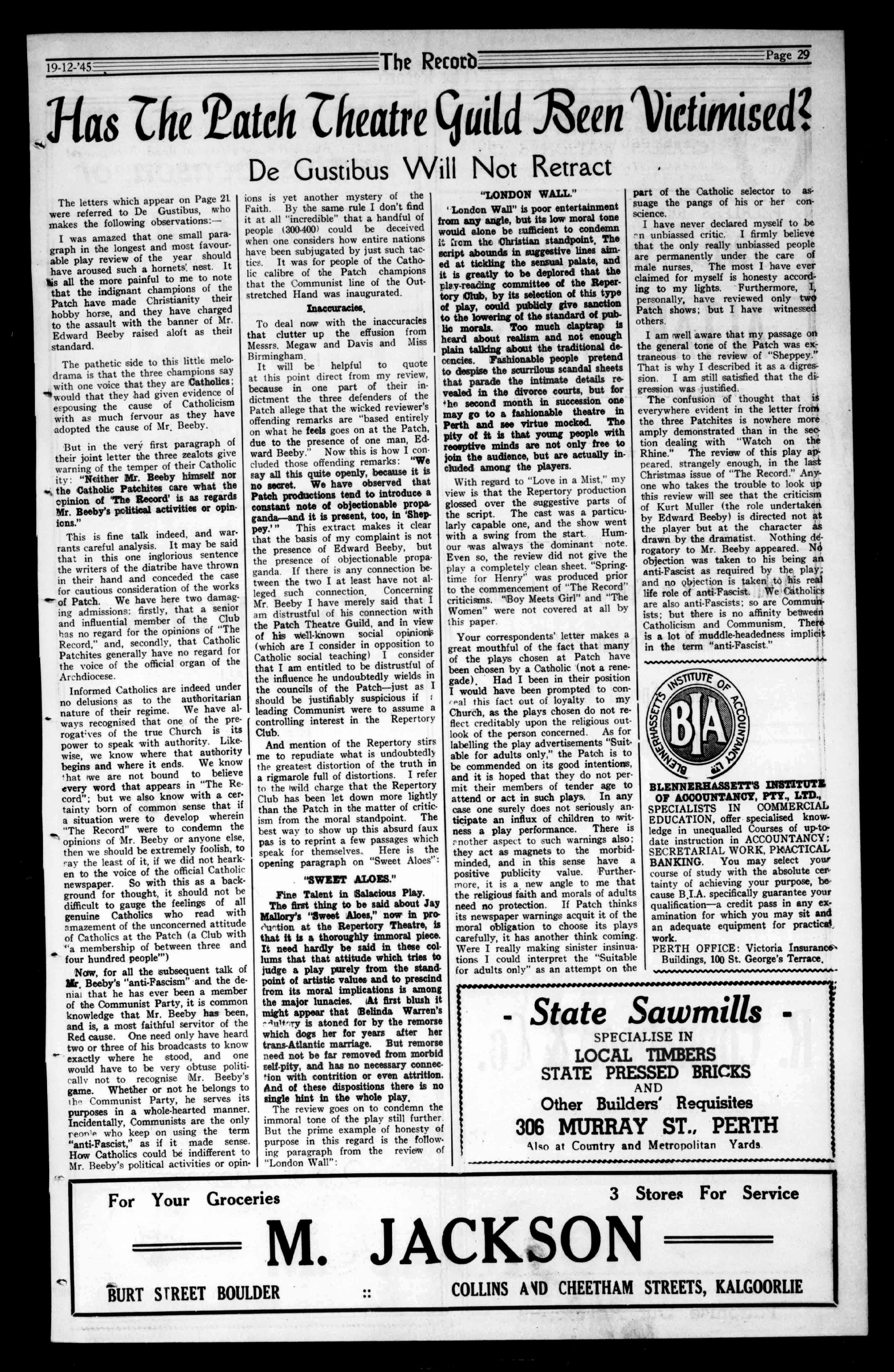Itwillbehelpfultoquote atthispointdirectfrommyreview, becauseinonepartoftheirindictmentthethreedefendersofthe Patchallegethatthewickedreviewer's offendingremarksare"basedentirelyonwhathefeelsgoesonatthePatch, duetothepresenceofoneman,EdwardBeeby."NowthisishowIconcludedthoseoffendingremarks:"We rayallthisquiteopenly,becauseitis nosecret.Wehaveobservedthat Patchproductionstendtointroducea constantnoteofobjectionablepropaganda-anditispresent,too,in'Sheppey.'"Thisextractmakesitclear thatthebasisofmycomplaintisnot thepresenceofEdwardBeehy,but thepresenceofobjectionablepropaganda.IfthereisanyconnectionbetweenthetwoIatleasthavenotallegedsuchconnection.Concerning Mr.BeebyIhavemerelysaidthatI amdistrustfulofhisconnectionwith thePatchTheatreGuild,andinview ofhiswell-knownsocialopinionls (whichareIconsiderinoppositionto Catholicsocialteaching)Iconsider thatIamentitledtobedistrustfulof theinfluenceheundoubtedlywieldsin thecouncilsofthePatch-justasI shouldbejustifiablysuspiciousif leadingCommunistweretoassumea controllinginterestintheRepertory Club.