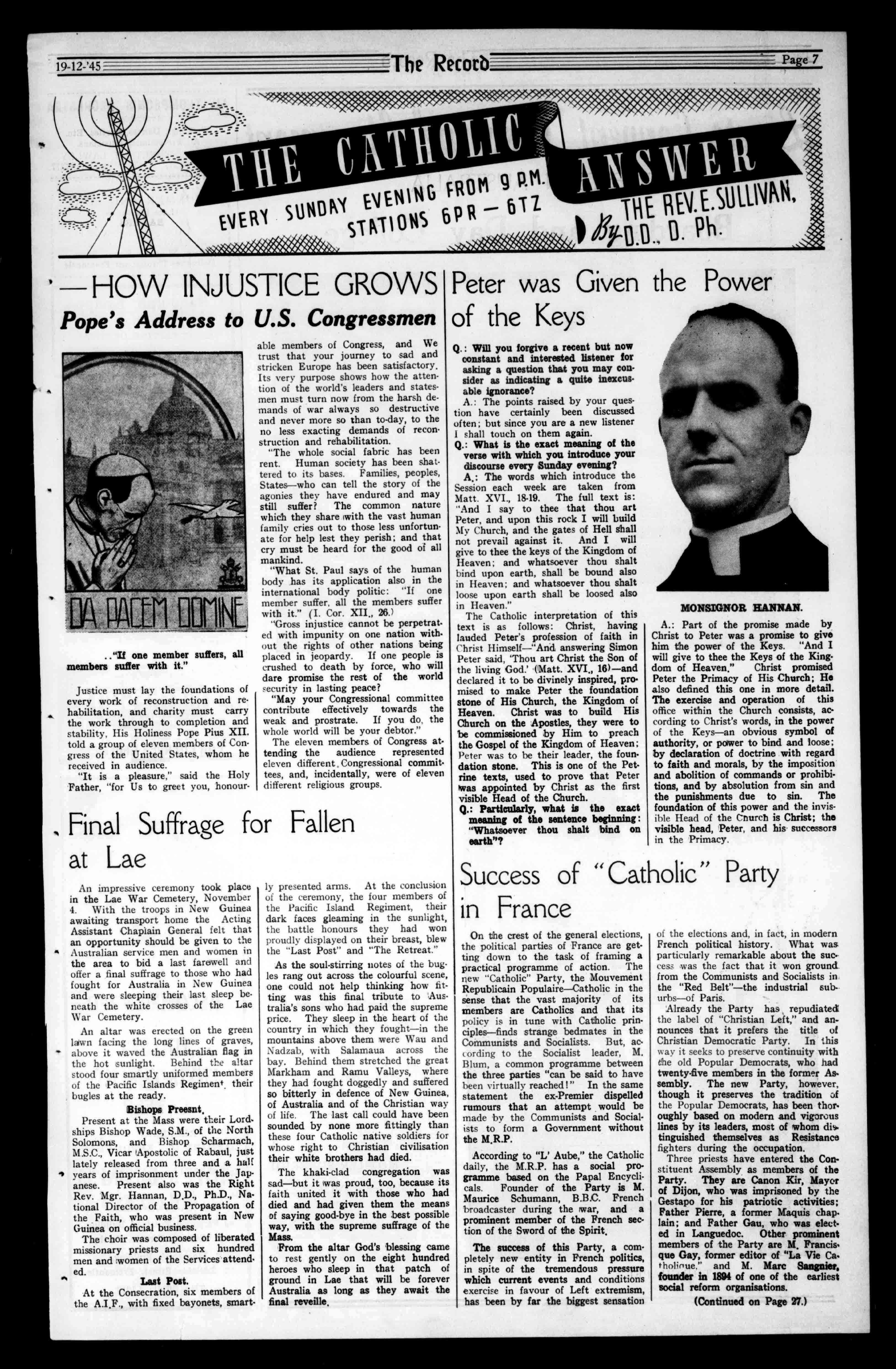 InformedCatholicsareindeed nodelusionsastotheauthoritarian natureoftheirregime.Wehavealwaysrecognisedthatoneoftheprerogat'vesofthetrueChurchisits powertospeakwithauthority.Likewise,weknowwherethatauthority beginsandwhereitends.Weknow 'hatwearenotboundtobelieve everywordthatappearsin"TheRecord";butwealsoknowwithacertaintybornofcommonsensethatif asituationweretodevelopwherein "TheRecord"weretocondemnthe opinionsofMr.Beehyoranyoneelse, thenweshouldbeextremelyfoolish,to -aytheleastofit,ifwedidnothearkentothevoiceoftheofficialCatholic newspaper.Sowiththisasabackgroundforthought,itshouldnotbe difficulttogaugethefeelingsofall genuineCatholicswhoreadwith amazementoftheunconcernedattitude ofCatholicsatthePatch(aClubwith membershipofbetweenthreeand fourhundredpeople"')