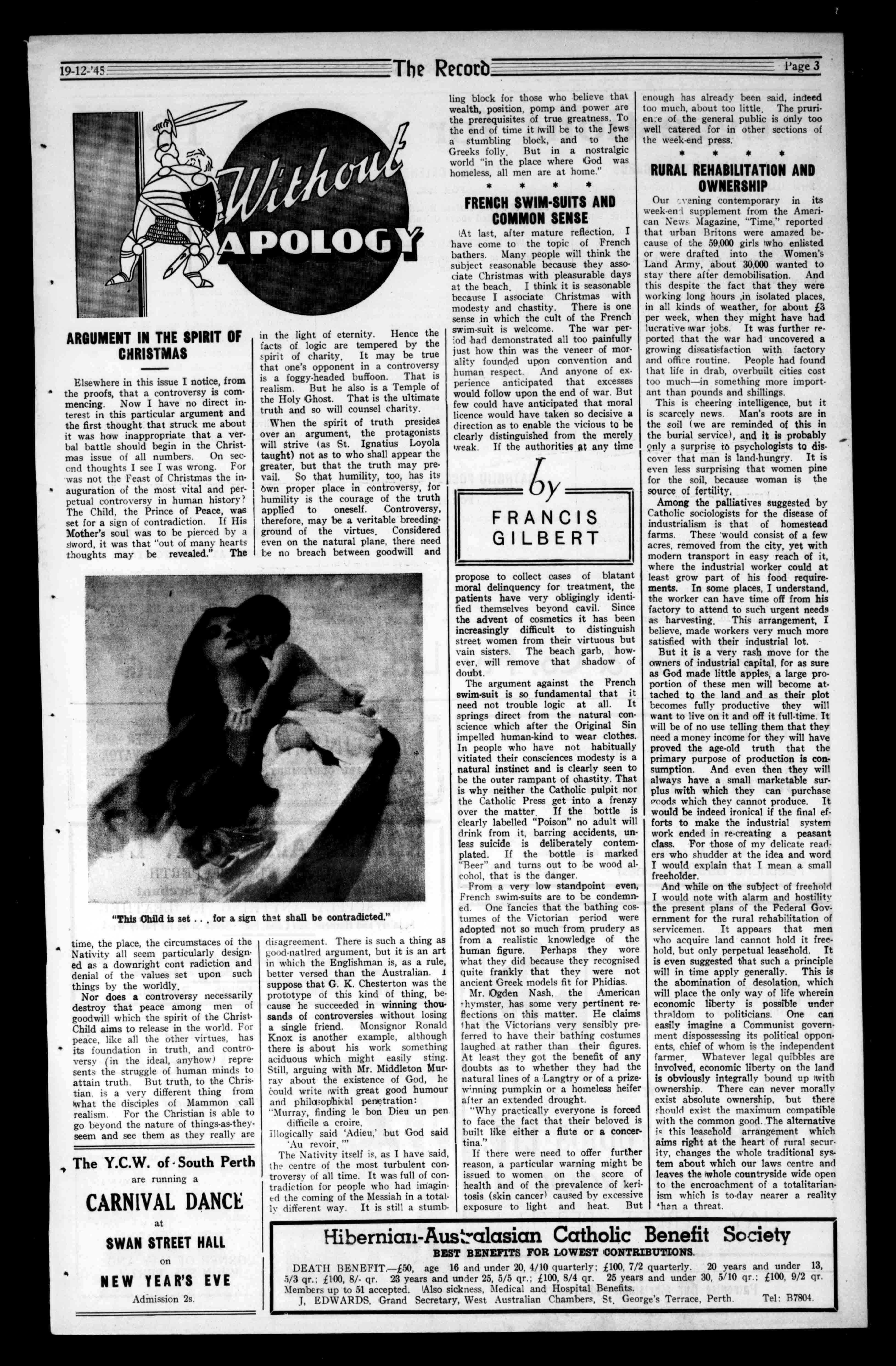 ,Atlast,aftermaturereflection,I havecometothetopicofFrench bathers.Manypeoplewillthinkthe subjectseasonablebecausetheyassociateChristmaswithpleasurabledays atthebeach. Ithinkitisseasonable becauseIassociateChristmaswith modestyandchastity.Thereisone senseinwhichthecultoftheFrench swimsuitiswelcome.Thewarperiodhaddemonstratedalltoopainfully justhowthinwastheveneerofmoralityfoundeduponconventionand humanrespect.Andanyoneofexperienceanticipatedthatexcesses wouldfollowupontheendofwar.But fewcouldhaveanticipatedthatmoral licencewouldhavetakensodecisivea directionastoenablethevicioustobe clearlydistinguishedfromthemerely tweak.Iftheauthoritiesatanytime