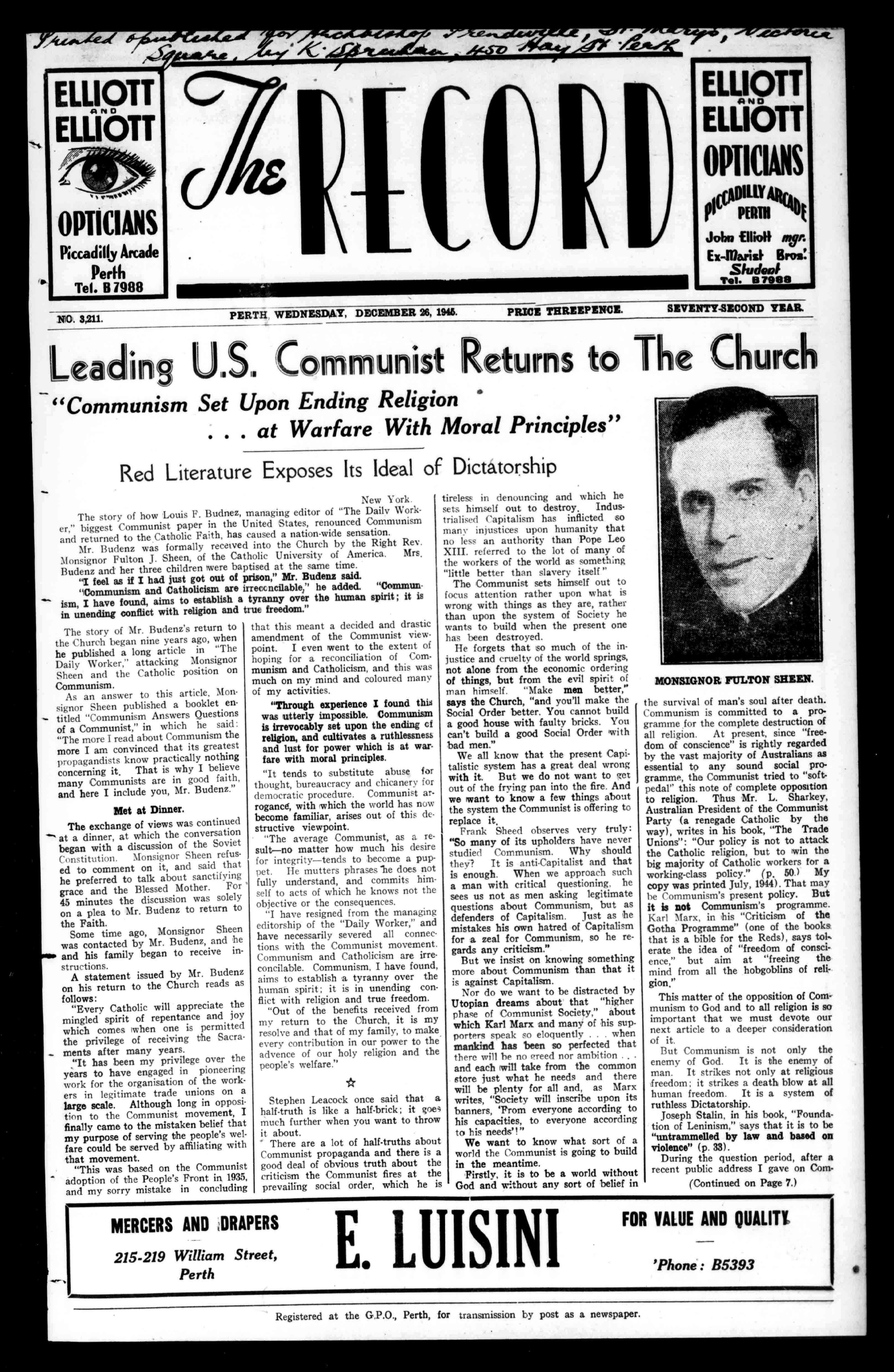 Theexchangeofviewswascontinued atadinner,atwhichtheconversation beganwithadiscussionoftheSoviet Constitution.MonsignorSheenrefusedtocommentonit,andsaidthat hepreferredtotalkaboutsanctifying graceandtheBlessedMother.For 45minutesthediscussionwassolely onapleatoMr.Budenztoreturnto theFaith.