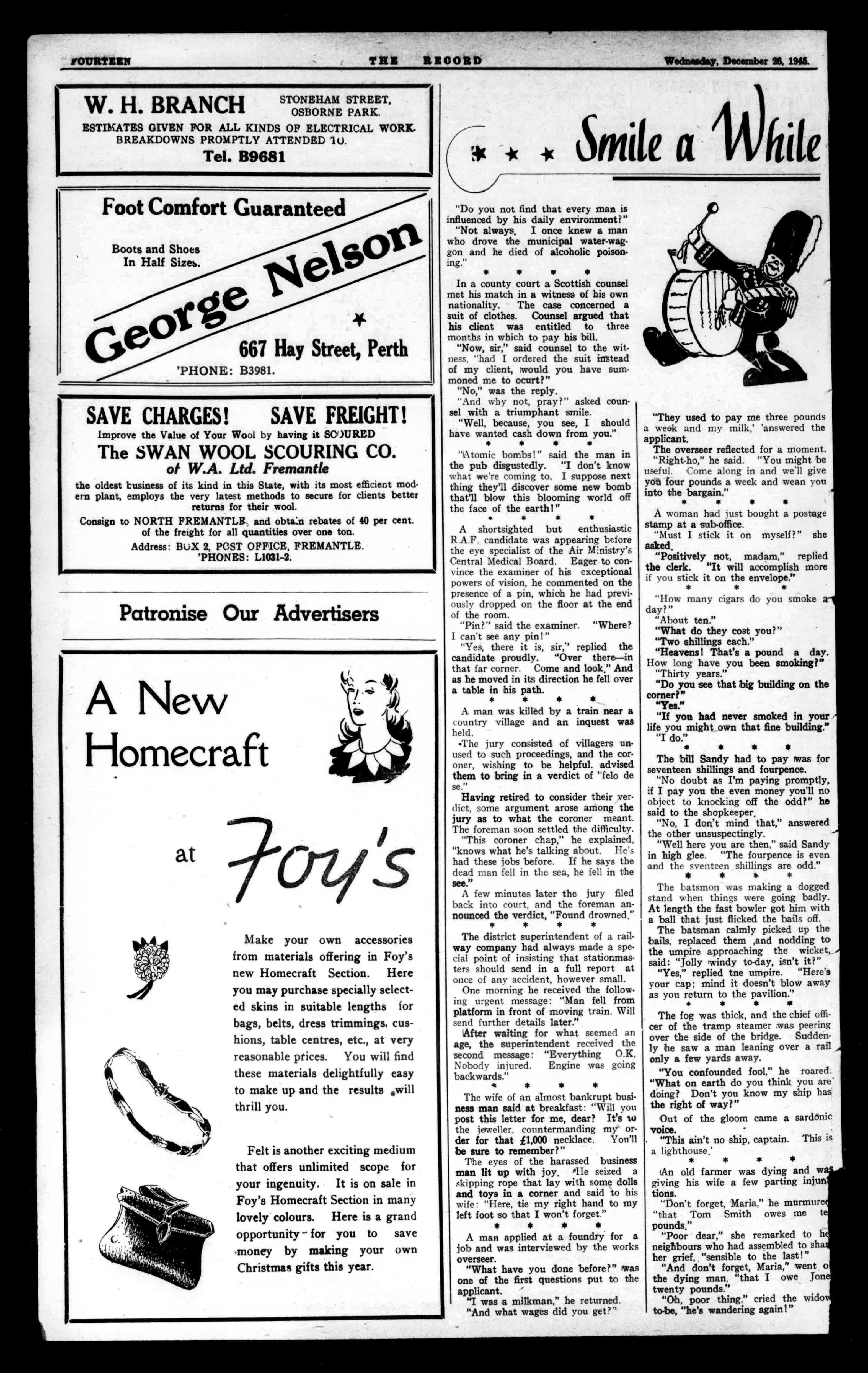 FOURTEEN TH RECORD Wednesday,December26,1968. W.H.BRANCH STONEHAMSTREET, OSBORNEPARK. ESTIMATESGIVENFORALLKINDSOFELECTRICALWORK. BREAKDOWNSPROMPTLYATTENDED10 Tel.B9681 FootComfortGuaranteed