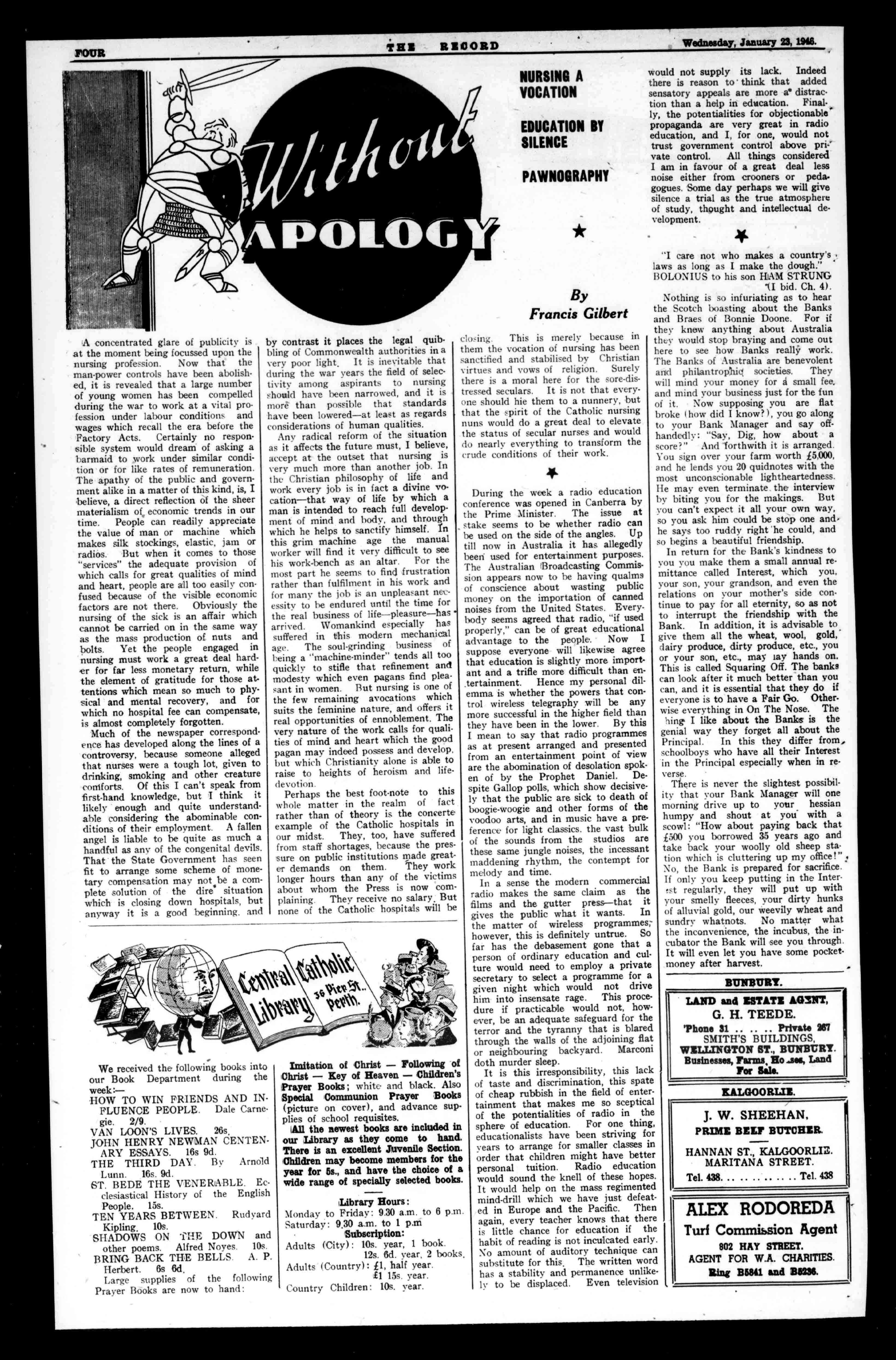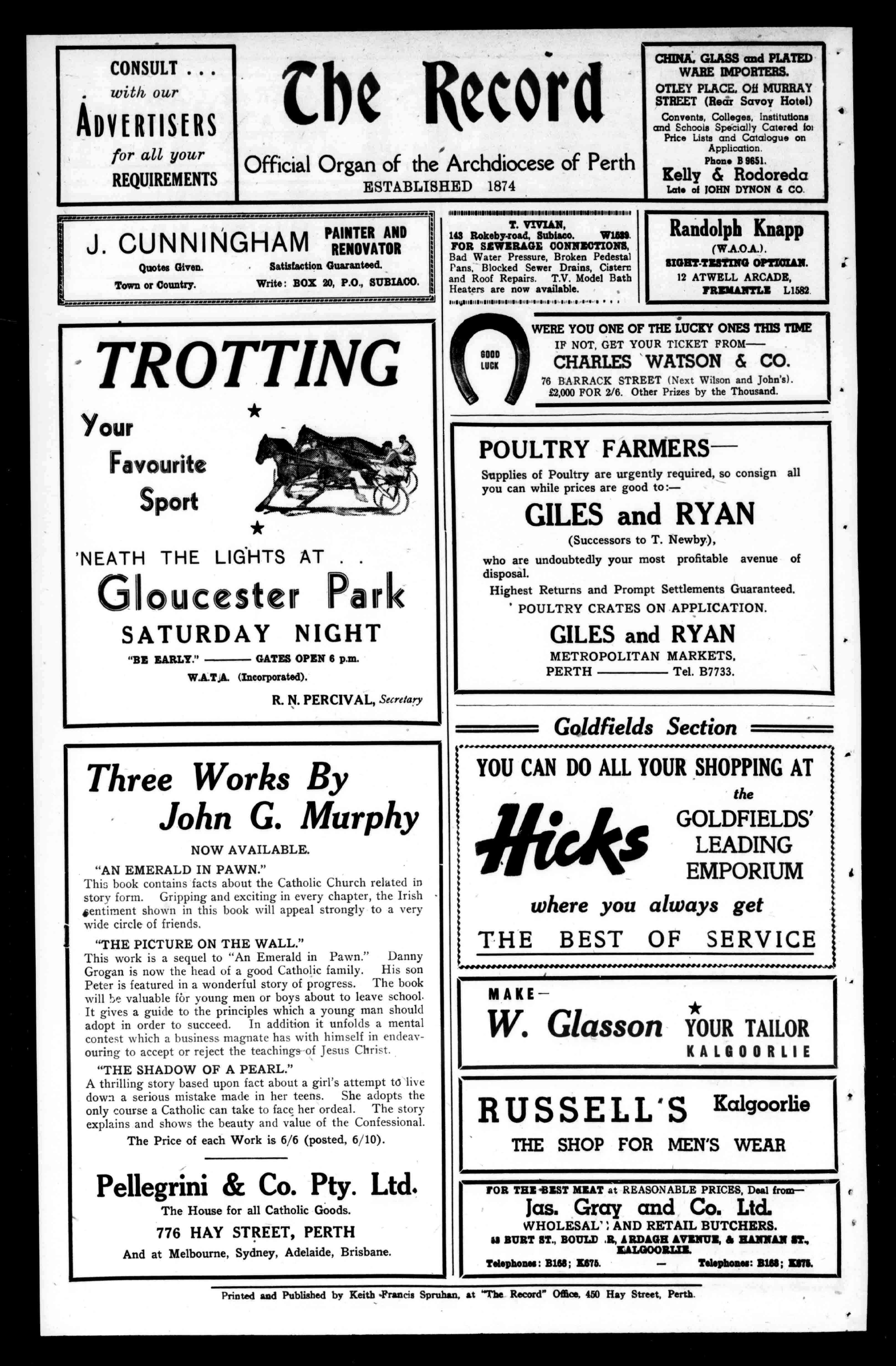 TIME IFNOT,GETYOURTICKETFROMCHARLESWATSON&CO. 76BARRACKSTREET(NextWilsonandJohn's). £2,000FOR2/6.OtherPrizesbytheThousand. POULTRYFARMERS SuppliesofPoultryareurgentlyrequired,soconsignall youcanwhilepricesaregoodto:GILESandRYAN (SuccessorstoT.Newby), whoareundoubtedlyyourmostprofitableavenueof disposal. HighestReturnsandPromptSettlementsGuaranteed. POULTRYCRATESONAPPLICATION. GILESandRYAN METROPOLITANMARKETS, PERTH Tel.B7733. GoldfieldsSection YOUCANDOALLYOURSHOPPINGAT the GOLDFIELDS' LEADING EMPORIUM whereyoualwaysget THE 4 BESTOFSERVICE MAKEW.GlassonYOURTAILOR KALGOORLIE RUSSELL'SKalgoorlie THESHOPFORMEN'SWEAR JOETHE'BESTMEATatREASONABLEPRICES,DealfromJas.GrayandCo.Ltd. WHOLESAL'ANDRETAILBUTCHERS. UBURTST.,BOULD.R,ARDAGHAVENUE,&HANNANIT, XALGOORLIX Telephones:B168;X676. Telephones:WU;UM. PrintedandPublishedbyKeith-FrancisSpruhan,at"TbeRecord"Office.450HayStreet,Perth