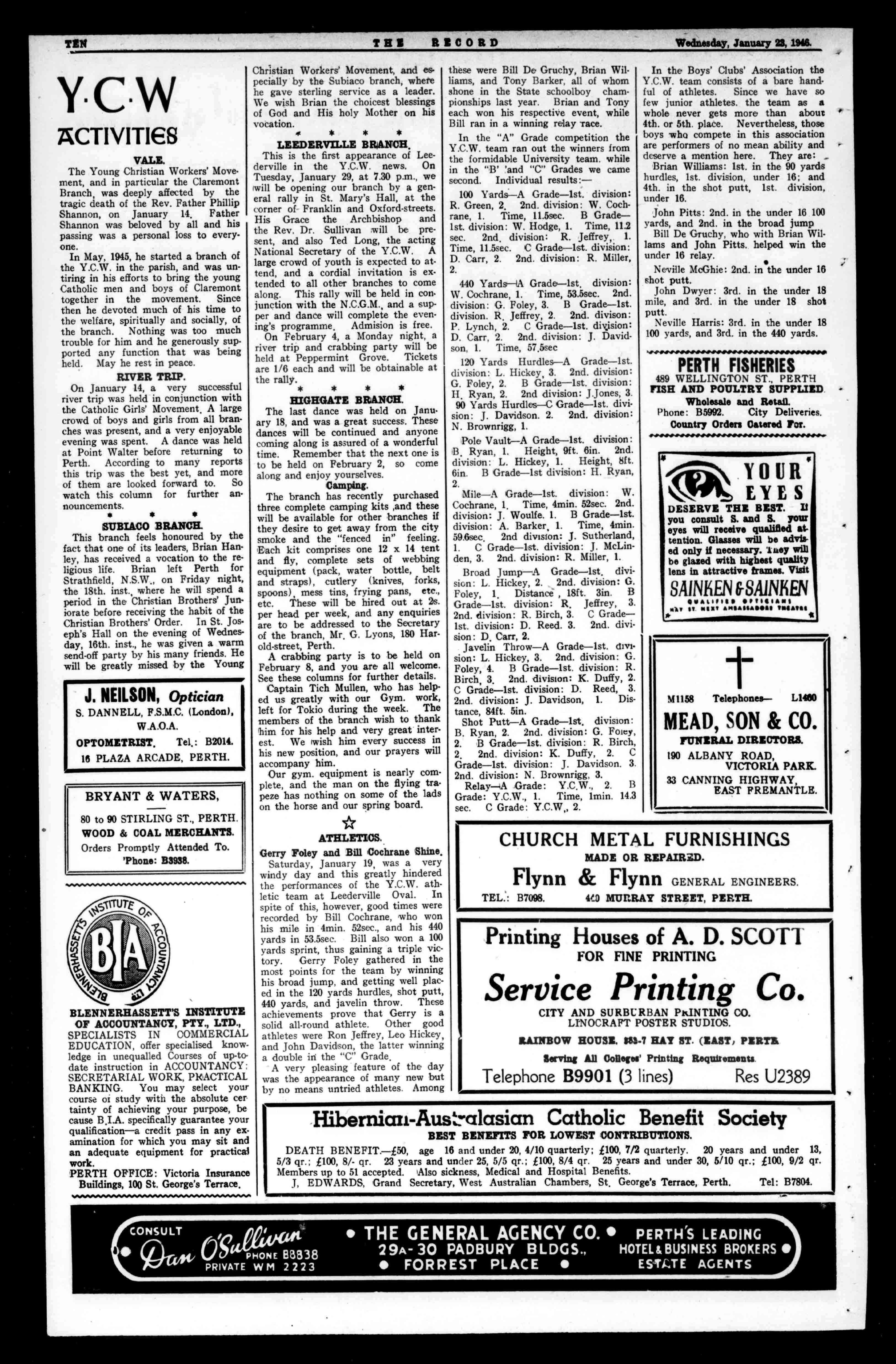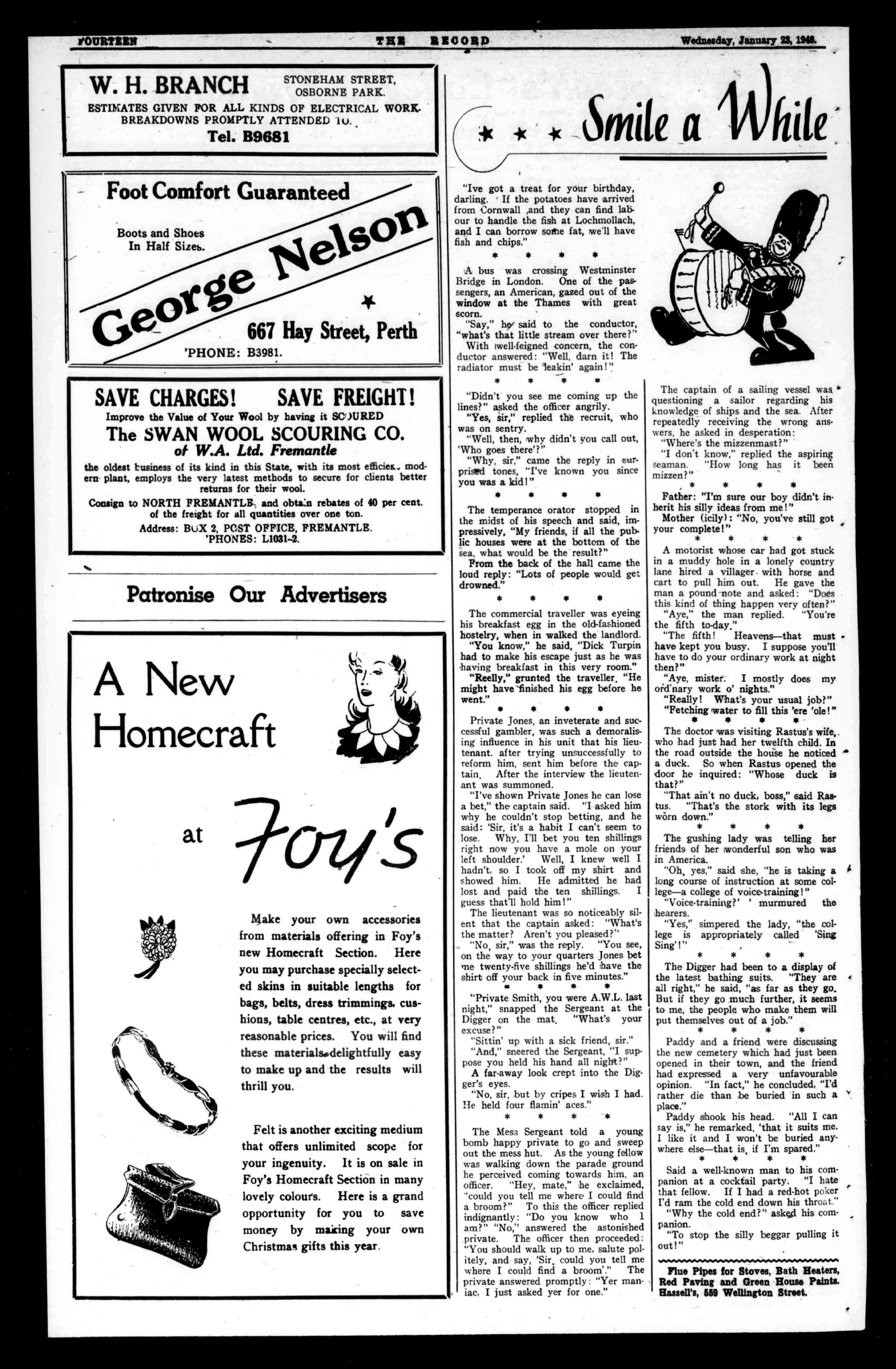YOURIMIN TENRIOORD Wednesday,January23,1946. W.H.BRANCH STONEHAMSTREET, OSBORNEPARK. ESTIMATESGIVENFORALLKINDSOFELECTRICALWORK. BREAKDOWNSPROMPTLYATTENDEDlu. Tel.B9681 FootComfortGuaranteed BootsandShoes InHalfSizes. GeV 667HayStreet,Perth 'PHONE:B3981. SAVECHARGES! SAVEFREIGHT! ImprovetheValueofYourWoolbyhavingitSC)URED TheSWANWOOLSCOURINGCO. ofW.A.Ltd.Fremantle theoldestbusinessofitskindinthisState,withitsmostefficier.,modernplant,employstheverylatestmethodstosecureforclientsbetter returnsfortheirwool. ConsigntoNORTHFREMANTLE.andobtainrebatesof40percent. ofthefreightforallquantitiesoveroneton. Address:BuX2,POSTOFFICE,FREMANTLE. 'PHONES:L1031-2.