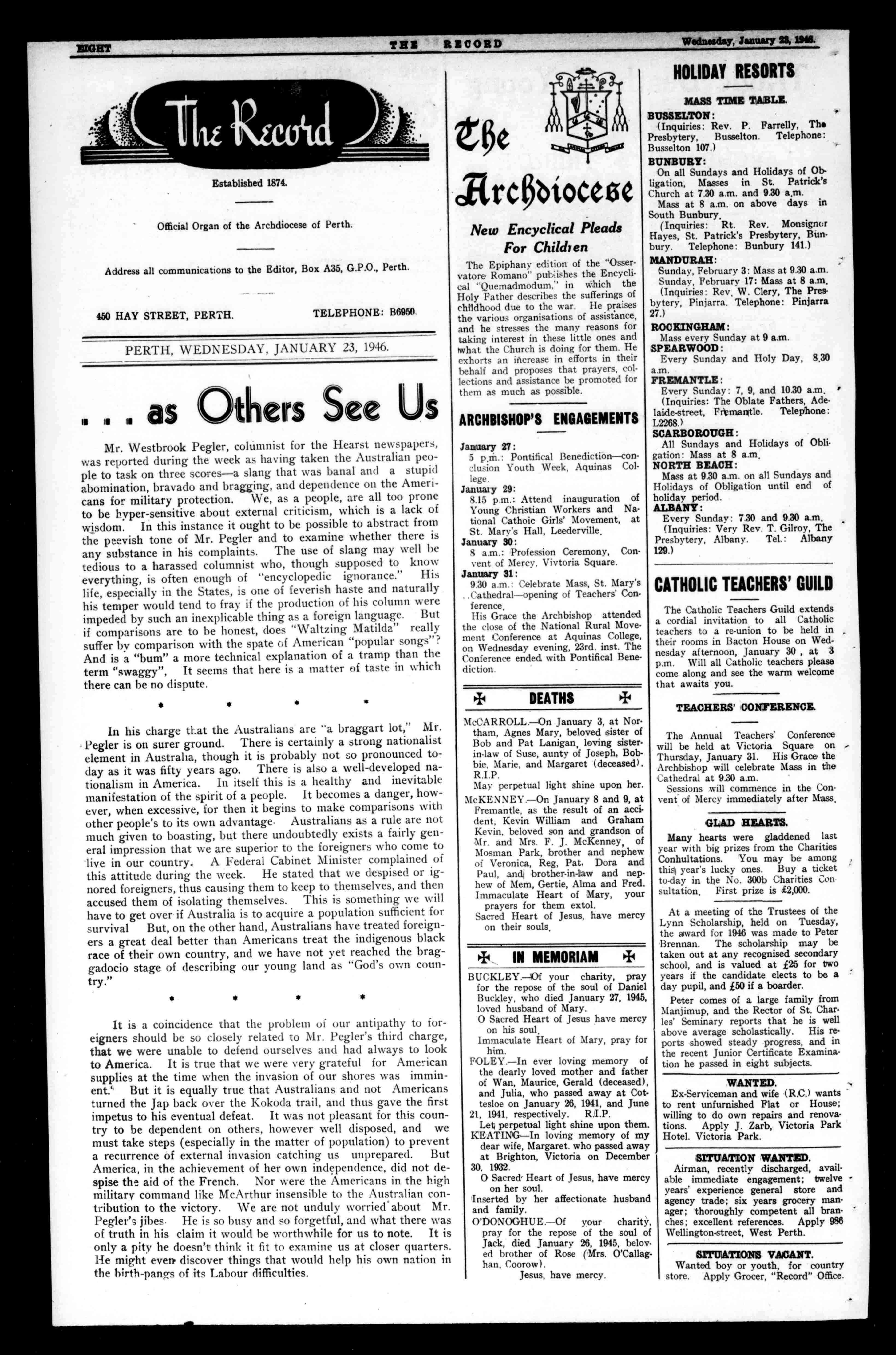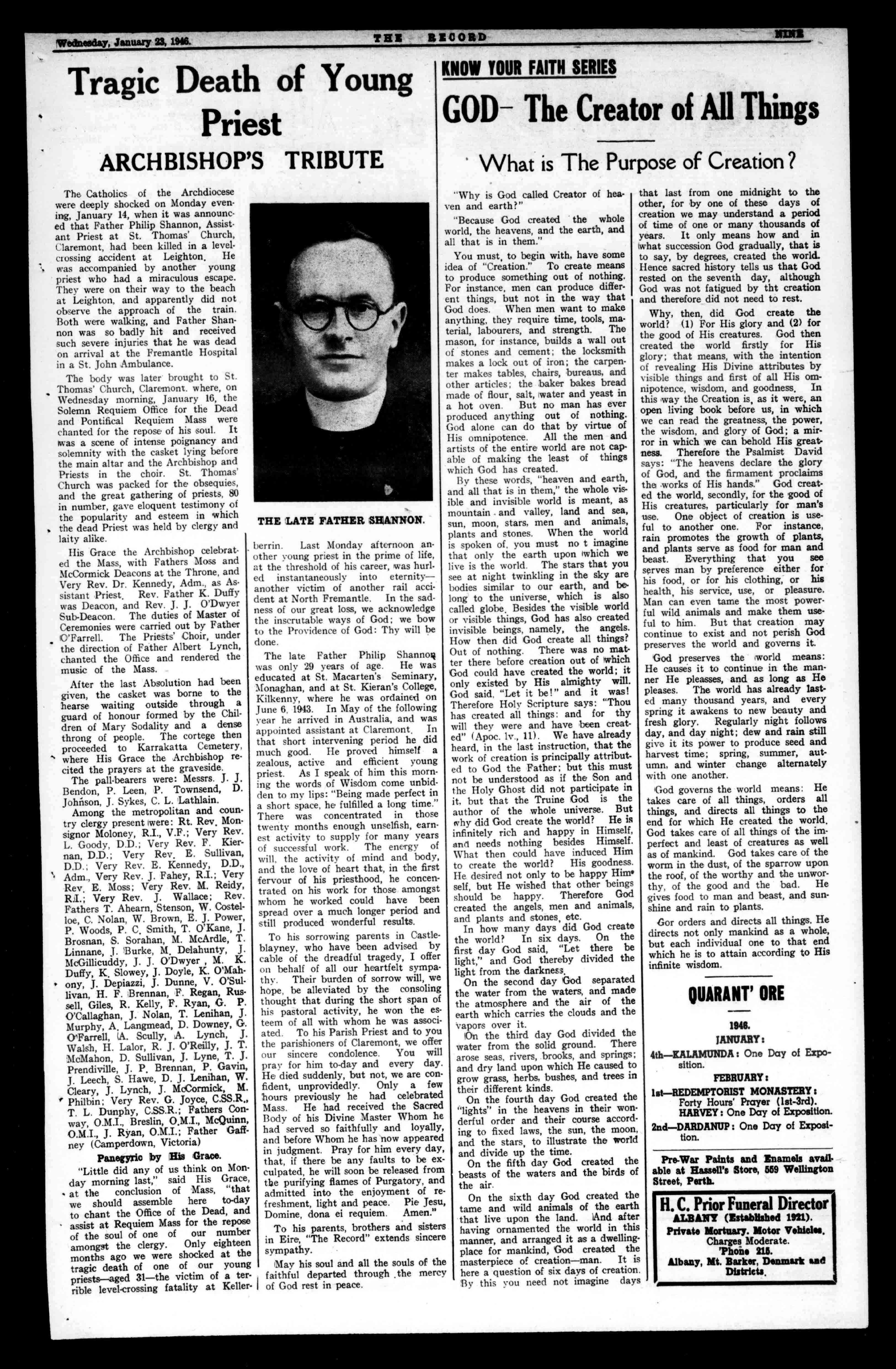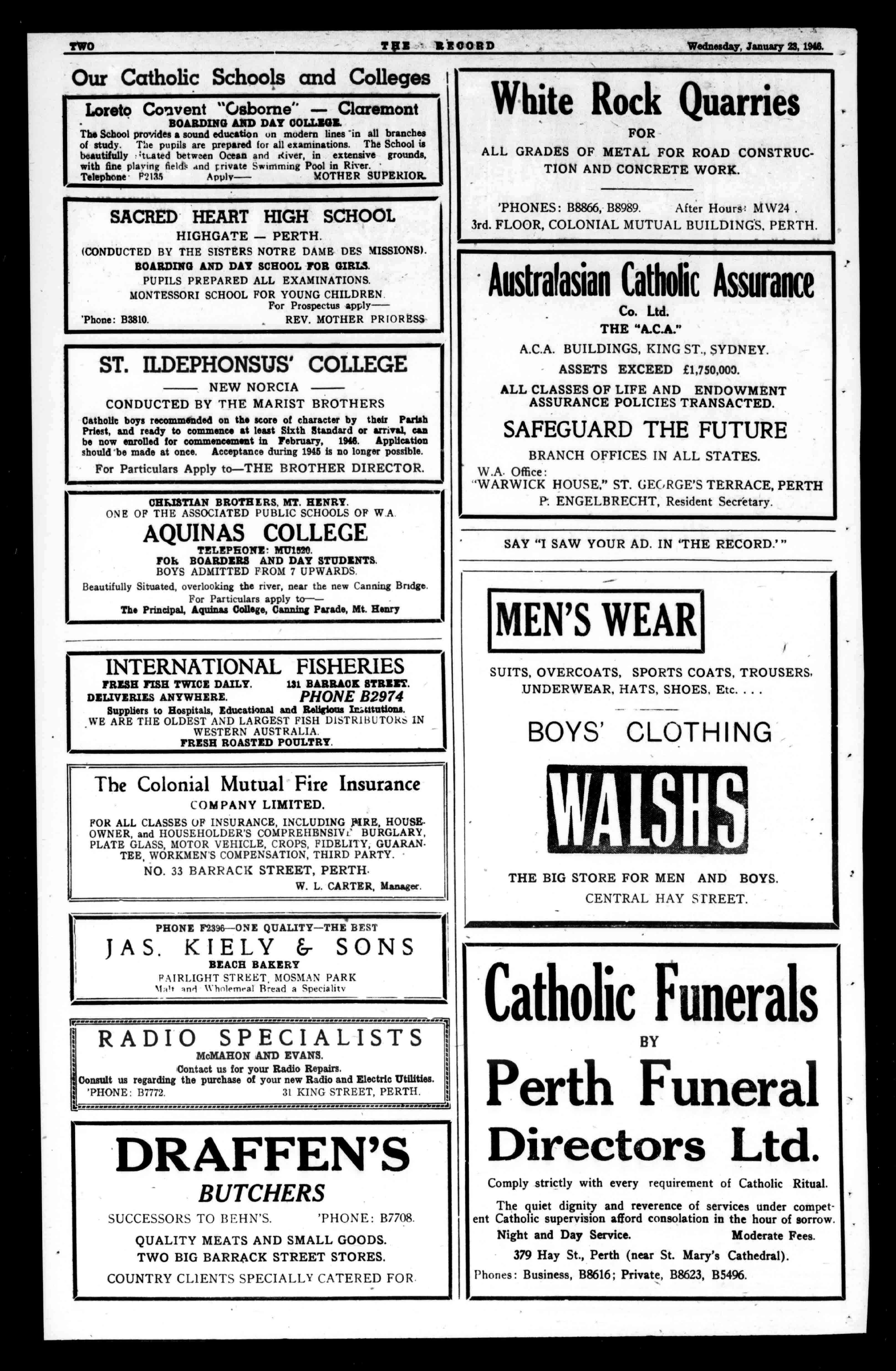 CLOTHING THEBIGSTOREFORMENANDBOYS. CENTRALHAYSTREET. CatholicFunerals BY PerthFuneral DirectorsLtd. ComplystrictlywitheveryrequirementofCatholicRitual. ThequietdignityandreverenceofservicesundercompetentCatholicsupervisionaffordconsolationinthehourofsorrow. NightandDayService. ModerateFees. 379HaySt.,Perth(nearSt.Mary'sCathedral). Phones:Business,B8616;Private,B8623,B5496.