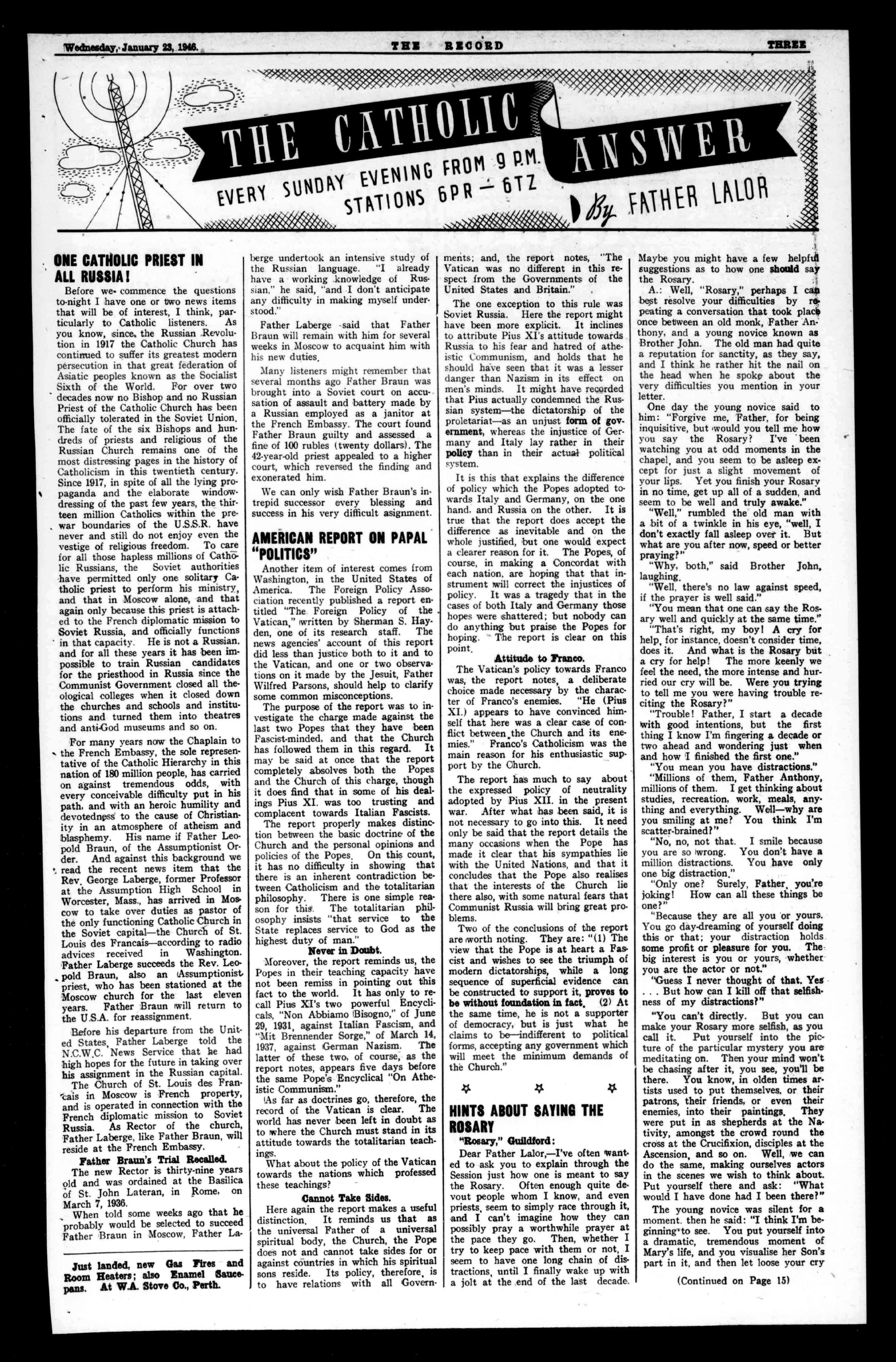 Beforewe-commencethequestions to-nightIhaveoneortwonewsitems thatwillbeofinterest,Ithink,particularlytoCatholiclisteners. As youknow,since,theRussianRevolutionin1917theCatholicChurchhas continuedtosufferitsgreatestmodern persecutioninthatgreatfederationof AsiaticpeoplesknownastheSocialist SixthoftheWorld.Forovertwo decadesnownoBishopandnoRussian PriestoftheCatholicChurchhasbeen officiallytoleratedintheSovietUnion. ThefateofthesixBishopsandhundredsofpriestsandreligiousofthe RussianChurchremainsoneofthe mostdistressingpagesinthehistoryof Catholicisminthistwentiethcentury. Since1917,inspiteofallthelyingpros pagandaandtheelaboratewindowdressingofthepastfewyears,thethirteenmillionCatholicswithintheprewarboundariesoftheU.S.S.R.have neverandstilldonotenjoyeventhe vestigeofreligiousfreedom.Tocare forallthosehaplessmillionsofCatholicRussians,theSovietauthorities havepermittedonlyonesolitaryCatholicpriesttoperformhisministry, andthatinMoscowalone,andthat againonlybecausethispriestisattachedtotheFrenchdiplomaticmissionto SovietRussia,andofficiallyfunctions inthatcapacity.HeisnotaRussian. andforalltheseyearsithasbeenimpossibletotrainRussiancandidates forthepriesthoodinRussiasincethe CommunistGovernmentclosedalltheologicalcollegeswhenitcloseddown thechurchesandschoolsandinstitutionsandturnedthemintotheatres andanti-Godmuseumsandsoon.