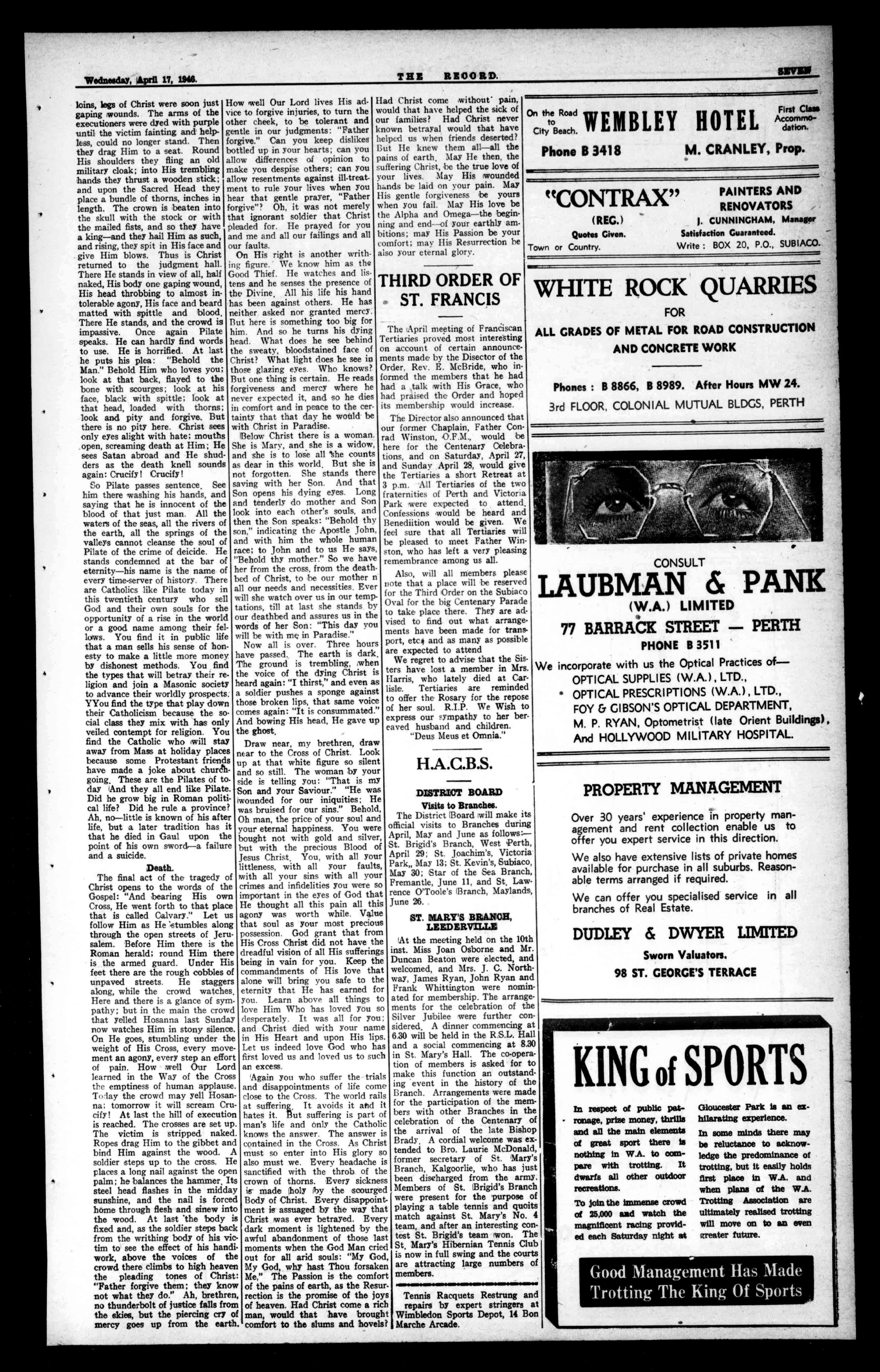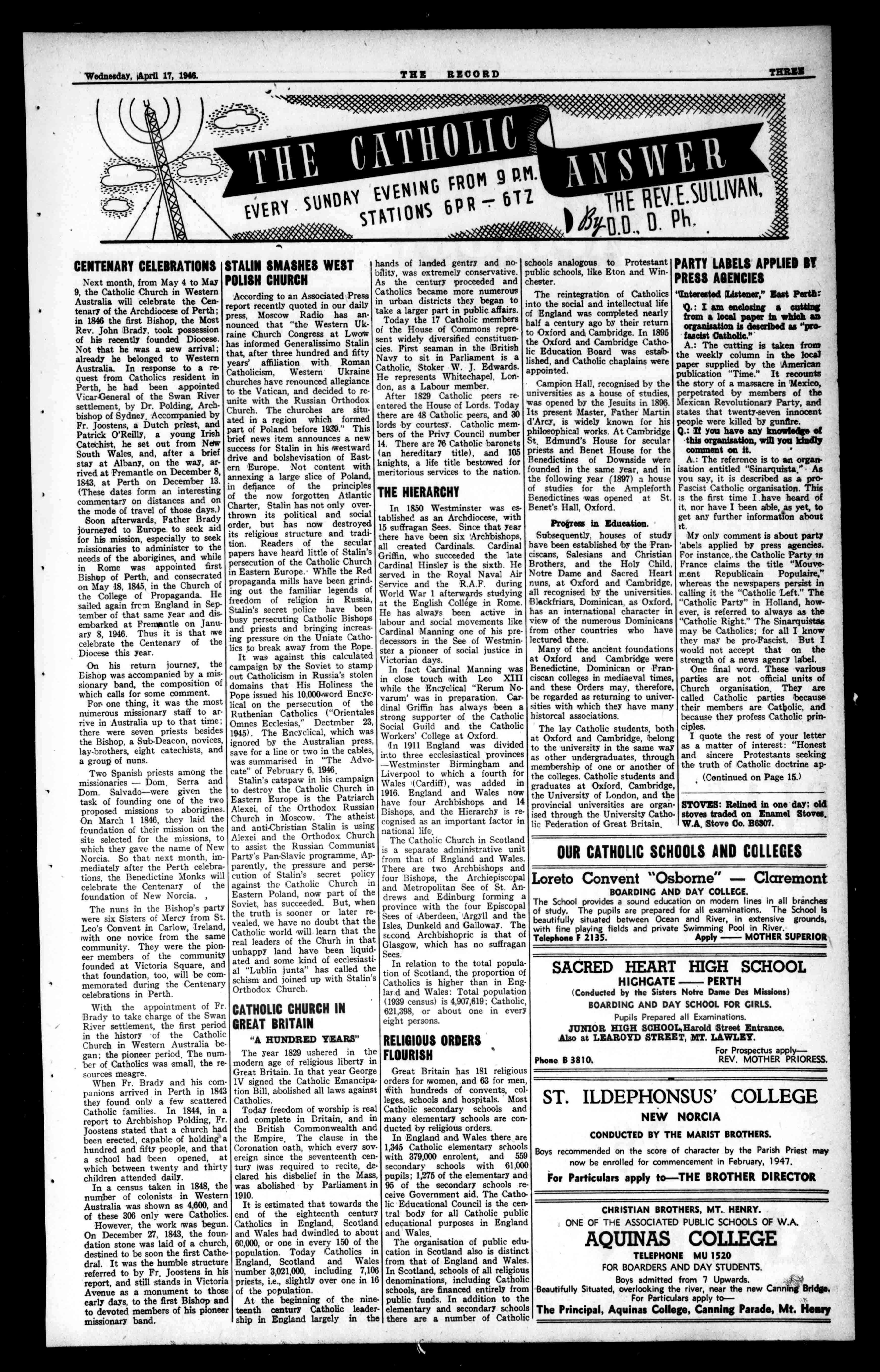 17ir.or Als Te"se,/s'air4.41," irs-Clat-esait 111[1tr '-.4 t A a ---11t14-14-4-ktaii30133"OINIMMEile EsL-WS()mew.ORGANOFTHEARCHDIOCESEOF PERTH. ESTABLISHED1874.'PHONEB6950 RegisteredattheG.P.O.,Perth,fortransmissionbypostasanewspaper. 450HayStreet,Perth.BoxA35,G.P.O.,Perth. No.2,227. PERTH, WEDNESDAY,APRIL17,1946. PRICETHREEPENCE SEVENTY-THIRDYEAZ