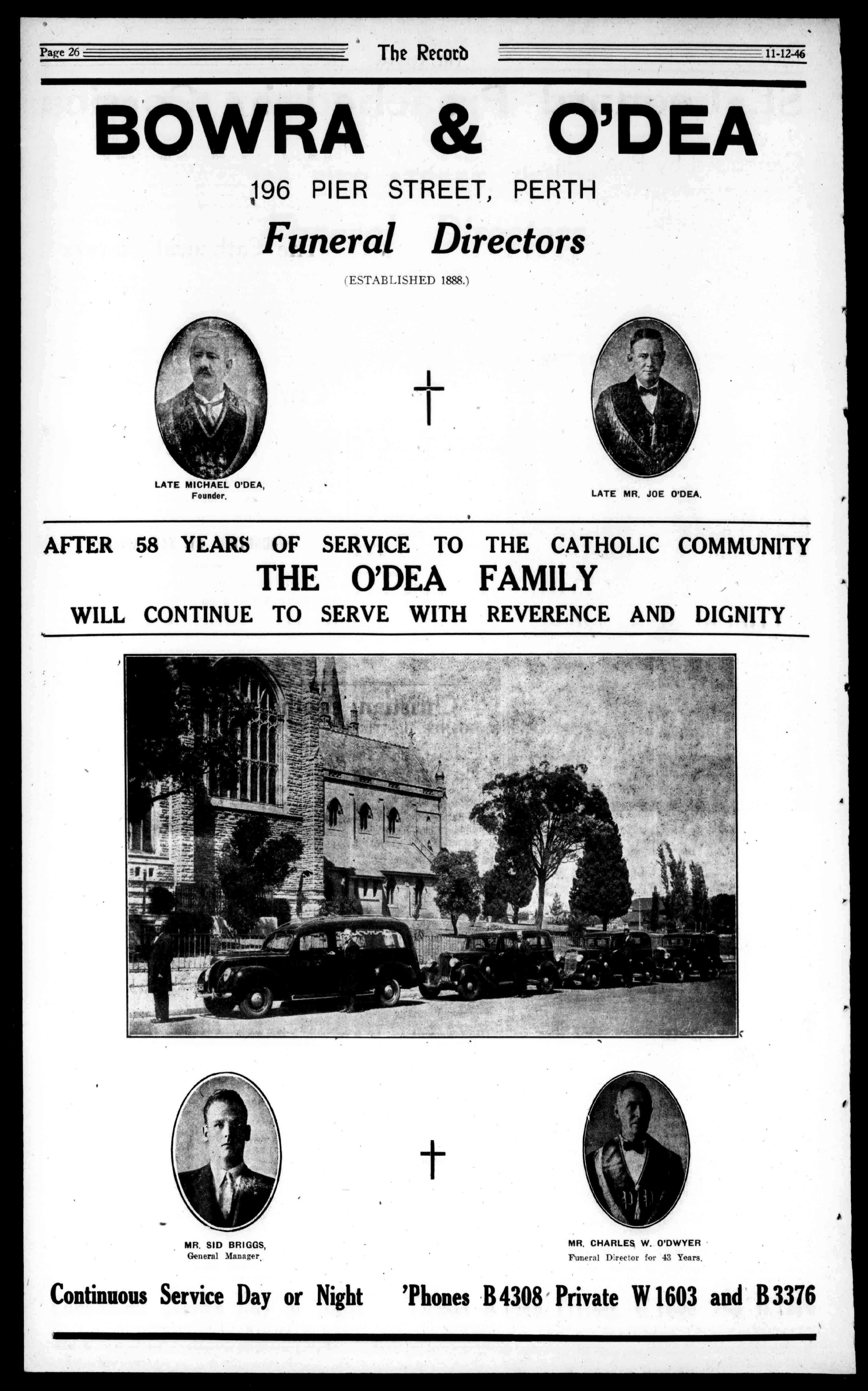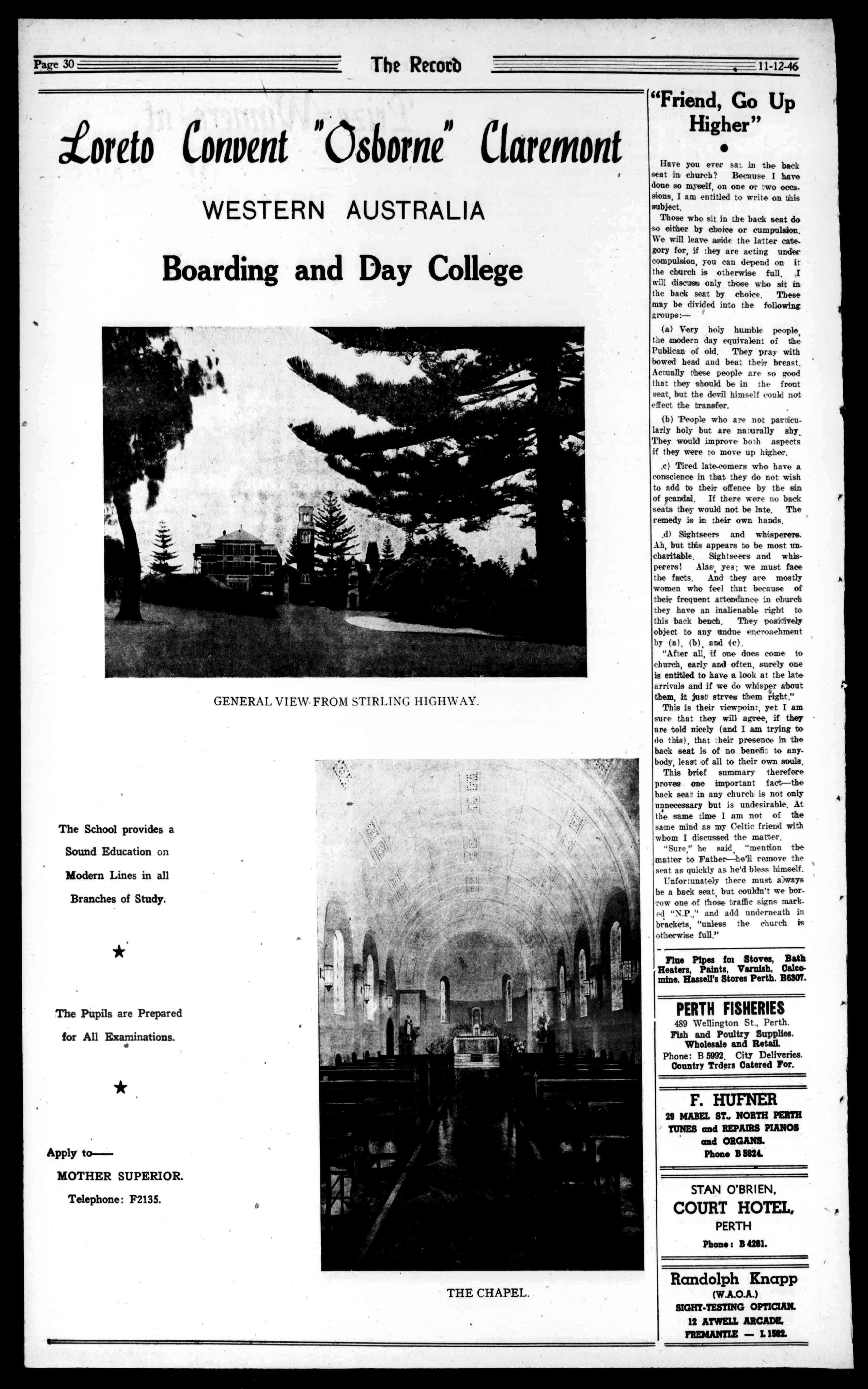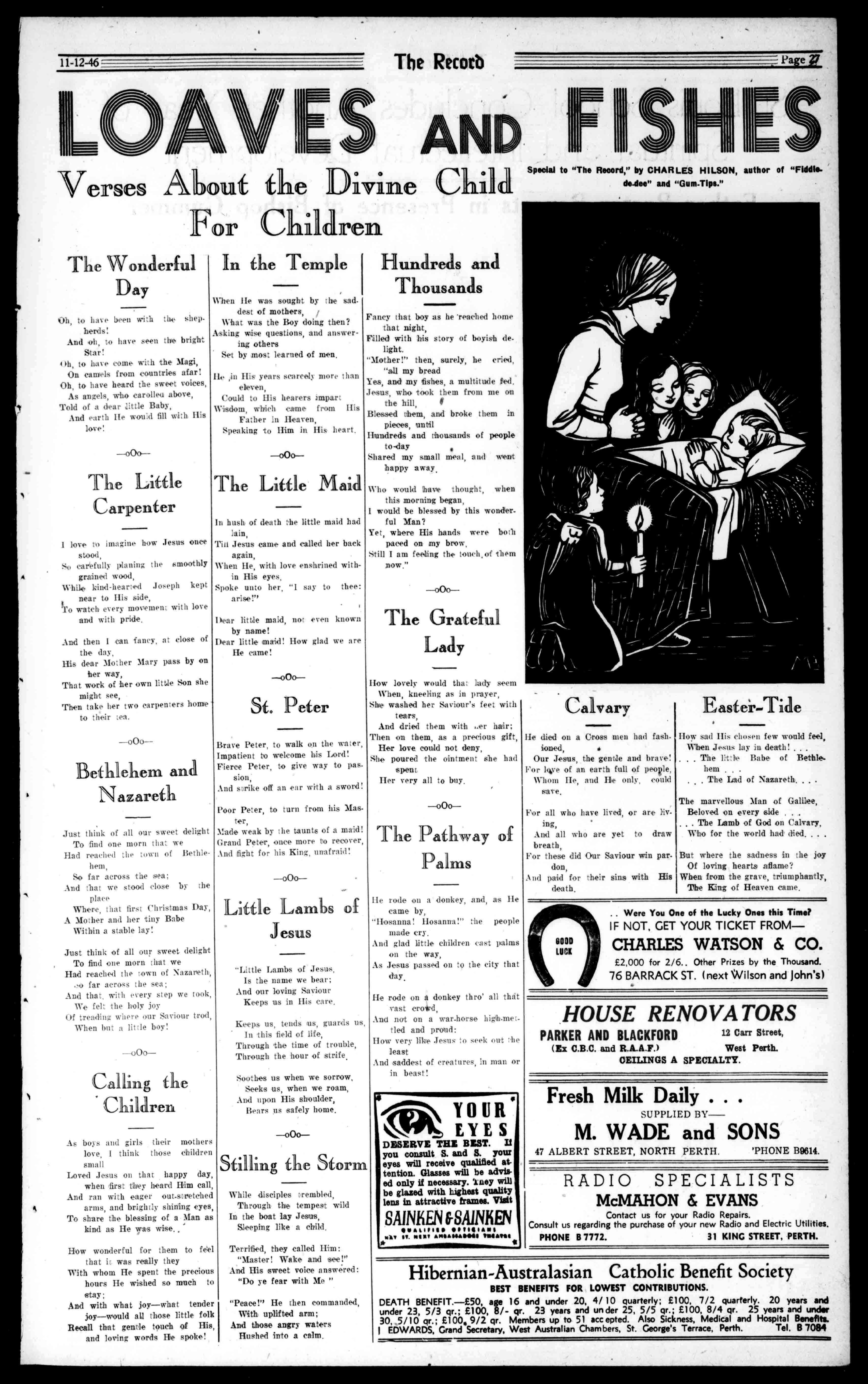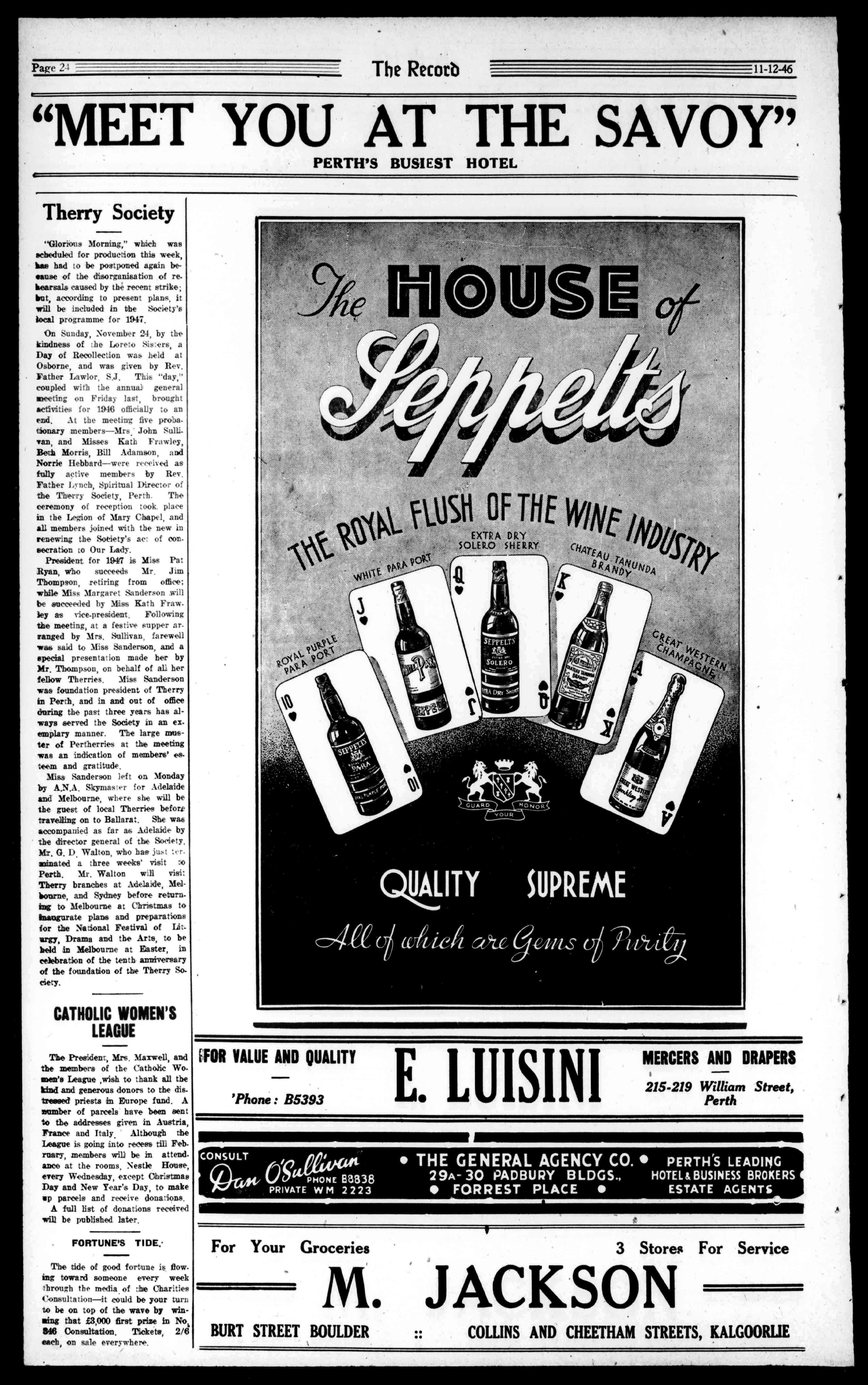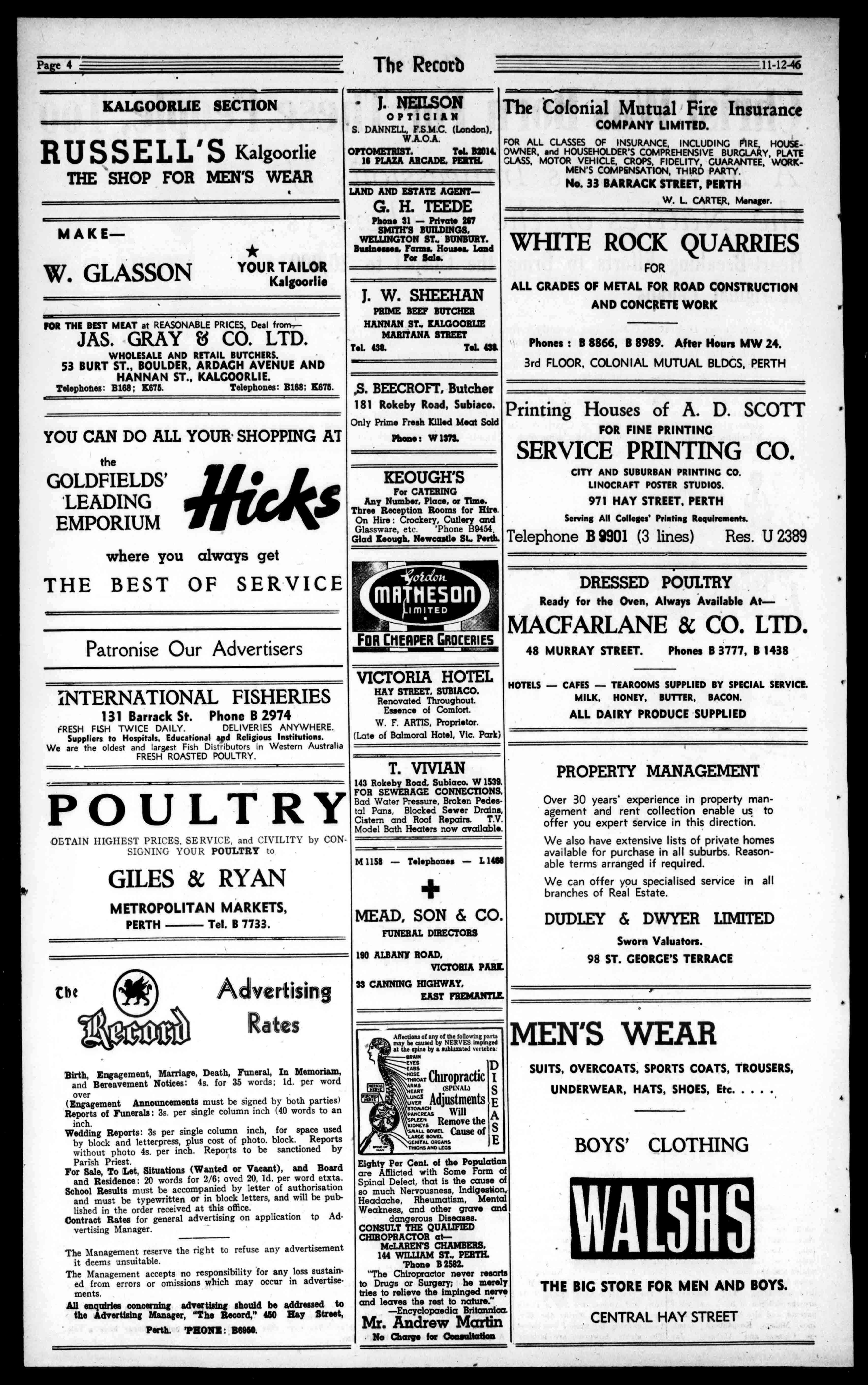 J.NEILSON OPTICIAN S.DANNELL,F.S.M.C.(London), W.A.O.A. OPTOMETRIST. T.I.112014, 16PLAZAARCADE.PUTH. LANDANDESTATEAGENTG.H.TEEDE Phone31-Private267 SMITH'SBUILDINGS, WELLINGTONST..BUNBURT. Businesses,Farms,Houses,Land ForSale. J.W.SHEEHAN PRIMEBEEFBUTCHER HANNANST.,KALGOORLIE MARITANASTREET TeL438. TeL43$. ,S.BEECROFT,Butcher 181RokebyRoad,Subiaco. OnlyPrimeFreshKilledMeatSold Phone:W1373. KEOUGH'S ForCATERING AnyNumber,Place,orTime. ThreeReceptionRoomsforHire. OnHireCrockery,Cutleryand Glassware,etc. 'PhoneB9454. GladKeough.NewcastleSL,Perth. FORCHEAPERGROCERIES VICTORIAHOTEL HAYSTREET,SUBIACO. RenovatedThroughout. EssenceofComfort. W.F.ARTIS,Proprietor. (LateofBalmoralHotel,Vic.Park) T.VIVIAN 143RokebyRoad,Subiaco.W1539. FORSEWERAGECONNECTIONS. BadWaterPressure,BrokenPedestalPans,BlockedSewerDrains, CisternandRoofRepairs.T.V. ModelBathHeatersnowavailable. M1158-Telephones-L1468 MEAD,SON&CO. FUNERALDIRECTORS 190ALBANYROAD, VICTORIAPARL 33CANNINGHIGHWAY, EASTFREMANTLE Af'Tm:dt"f7Vt11`ms;euse NERVES atthespinebyaeubhuatedtebrs SRAM EYES EARS ChiropracticARMS (SPINAL) !ART Adjustments PANCREAS Will P`""Removethe KIDNEYS SMALLsown.Causeof LARGEBOWEL EtUTALORGANS THIGHSANDLEOS D I E A S E EightyPerCent.ofthePopulation areAfflictedwithSomeFormof SpinalDefect,thatisthecauseof somuchNervousness,Indigestion, Headache,Rheumatism,Mental Weakness,andothergraveand dangerousDiseases. CONSULTTHEQUALIFIED CHIROPRACTORatMcLAREN'SCHAMBERS. 144WILLIAMST.,PERTH. 'PhoneB2582. "TheChiropractorneverresorts toDrugsorSurgery;hemerely triestorelievetheimpingednerve andleavestheresttonature." -EncyclopaediaBritannica. Mr.AndrewMartin NoChargeforConauliadon TheColonialMutualFireInsurance COMPANYLIMITED. FORALLCLASSESOFINSURANCE,INCLUDINGFIRE,HOUSEOWNER,andHOUSEHOLDER'SCOMPREHENSIVEBURGLARY,PLATE ;;LASS,MOTORVEHICLE,CROPS,FIDELITY,GUARANTEE,WORKMEN'SCOMPENSATION,THIRDPARTY. No.33BARRACKSTREET,PERTH W.LCARTER,Manager. WHITEROCKQUARRIES FOR ALLGRADESOFMETALFORROADCONSTRUCTION ANDCONCRETEWORK Phones:B8866,B8989.AfterHoursMW24. 3rdFLOOR,COLONIALMUTUALBLDCS,PERTH PrintingHousesofA.D.SCOTT FORFINEPRINTING SERVICEPRINTINGCO. CITYANDSUBURBANPRINTINGCO. LINOCRAFTPOSTERSTUDIOS. 971HAYSTREET,PERTH ServingAllColleges'PrintingRequirements. TelephoneB9901(3lines) Res.U2389 DRESSEDPOULTRY ReadyfortheOven,AlwaysAvailableAtMACFARLANE&CO.LTD. 48MURRAYSTREET. PhonesB3777,B1438 HOTELS-CAFES-TEAROOMSSUPPLIEDBYSPECIALSERVICE. MILK,HONEY,BUTTER,BACON. ALLDAIRYPRODUCESUPPLIED PROPERTYMANAGEMENT Over30years'experienceinpropertymanagementandrentcollectionenableus.to offeryouexpertserviceinthisdirection. Wealsohaveextensivelistsofprivatehomes availableforpurchaseinallsuburbs.Reasonabletermsarrangedifrequired. Wecanofferyouspecialisedserviceinall branchesofRealEstate. DUDLEY&DWYERLIMITED SwornValuators. 98ST.GEORGE'STERRACE MEN'SWEAR SUITS,OVERCOATS,SPORTSCOATS,TROUSERS, UNDERWEAR,HATS,SHOES,Etc BOYS'CLOTHING WALSH THEBIGSTOREFORMENANDBOYS. CENTRALHAYSTREET