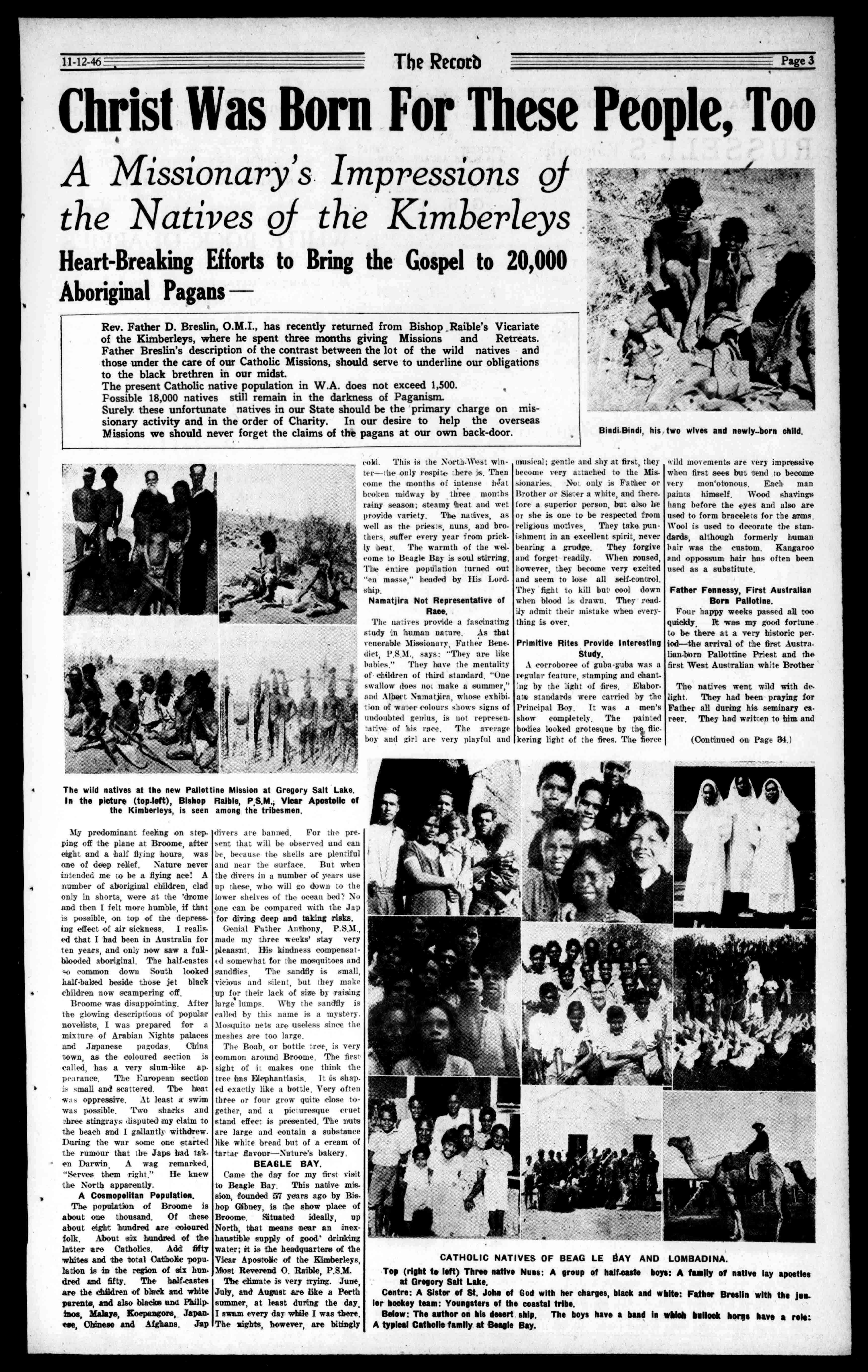 Inthepicture(top-left),BishopRaible,P.S,M.,VicarApostolicof theKimberleys,isseenamongthetribesmen, MypredominantfeelingonsteppingofftheplaneatBroome,after eightandahalfflyinghours,was oneofdeeprelief.Naturenever intendedmetobeaflyingace!A numberofaboriginalchildren,clad onlyinshorts,wereatthe'theme andthenIfeltmorehumble,ifthat ispossible,ontopofthedepress. ingeffectofairsickness.IrealisedthatIhadbeeninAustraliafor tenyears,andonlynowsawafullbloodedaboriginal.Thehalf-castes socommondownSouthlooked half-bakedbesidethosejetblack childrennowscamperingoff.