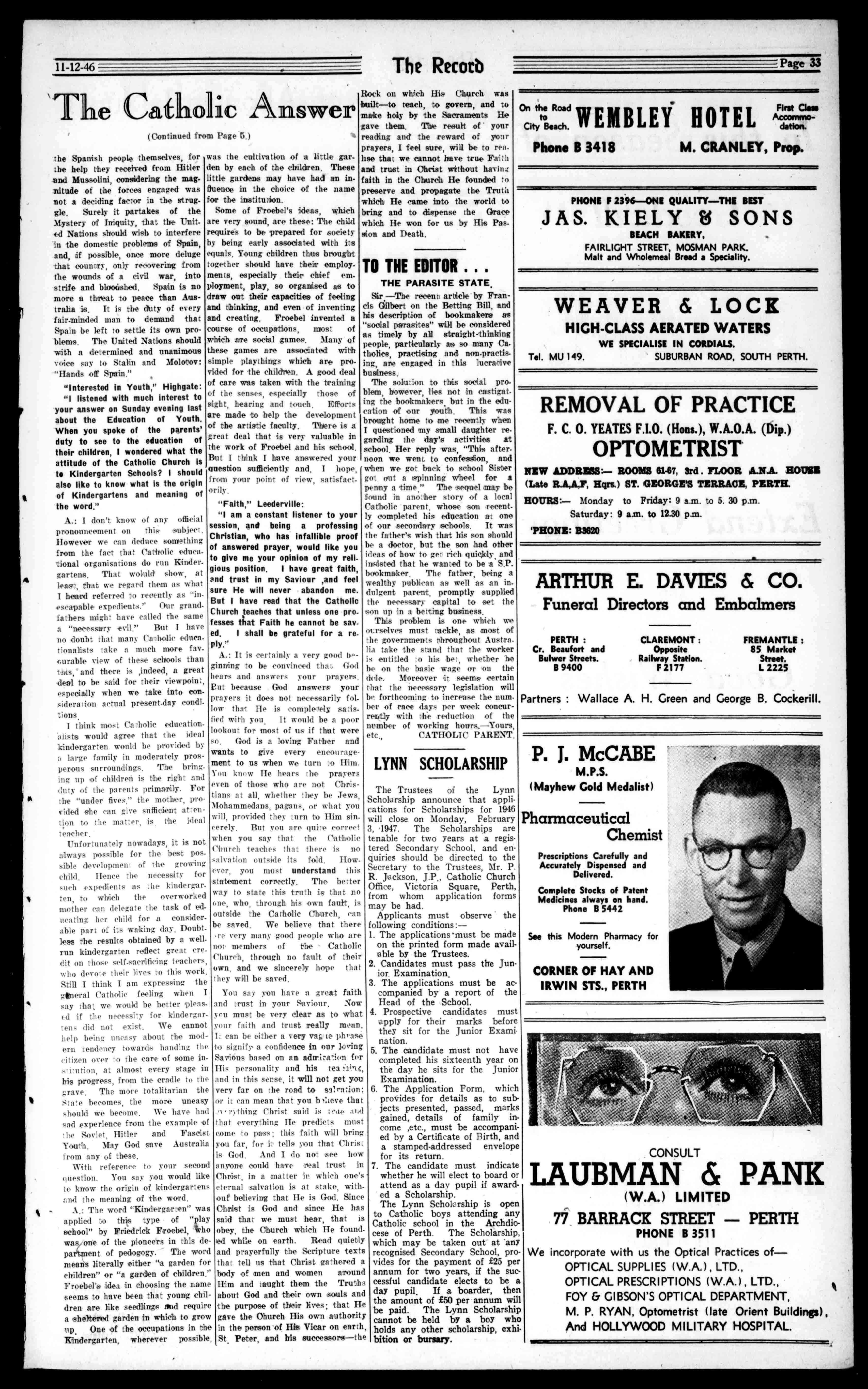 TheTrusteesoftheLynn ScholarshipannouncethatapplicationsforScholarshipsfor1946 willcloseonMonday,February 3,.1947.TheScholarshipsare tenablefortwoyearsataregisteredSecondarySchool,andenquiriesshouldbedirectedtothe SecretarytotheTrustees,Mr.P. R.Jackson,J.P.,CatholicChurch Office,VictoriaSquare,Perth, fromwhomapplicationforms maybehad. Applicantsmustobservethe followingconditions:-