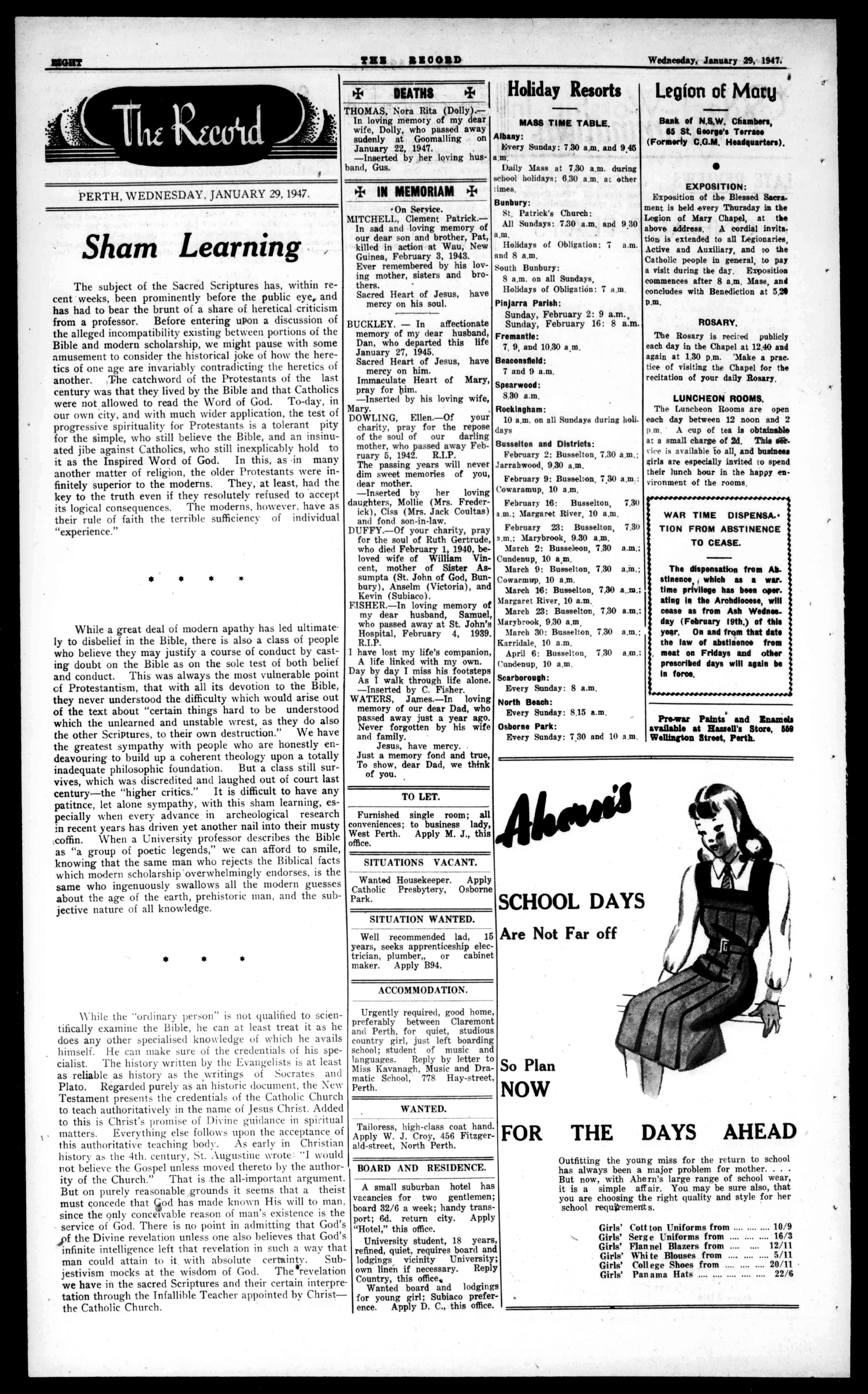 FISHTWICEDAILY. DELIVERIESANYWHERE. SupplierstoHospitals,EducationalandReligiousInstitutions. WearetheoldestandlargestFishDistributorsinWesternAustralia FRESHROASTEDPOULTRY. POULTRY OBTAINHIGHESTPRICES.SERVICE,andCIVILITYbyOONSIGNINGYOURPOULTRYto GILES&RYAN METROPOLITANMARKETS, PERTH Tel.B7733. the /-\dvertising Rates Birth,Engagement,Marriage,Death,Funeral,InMemoriam, andBereavementNotices:4s.for35words;Id.perword over (EngagementAnnouncementsmustbesignedbybothparties) ReportsofFunerals:3s.persinglecolumninch(40wordstoan inch. WeddingReports:3spersinglecolumninch,forspaceused byblockandletterpress,pluscostofphoto.block.Reports withoutphoto4s.perinch.Reportstobesanctionedby ParishPriest. ForSale,ToLet,Situations(WantedorVacant),andBoard andResidence:20wordsfor2/6;owed2U,Id.perwordetxts. SchoolResultsmustbeaccompaniedbyletterofauthorisation andmustbetypewrittenorinblockletters,andwillbepublishedintheorderreceivedatthisoffice. ContractRatesforgeneraladvertisingonapplicationtoAdvertising!tanager. TheManagementreservetherighttorefuseanyadvertisement itdeemsunsuitable. TheManagementacceptsnoresponsibilityforanylosssustainedfromerrorsoromissionswhichmayoccurinadvertisements. Allenquiriesconcerning