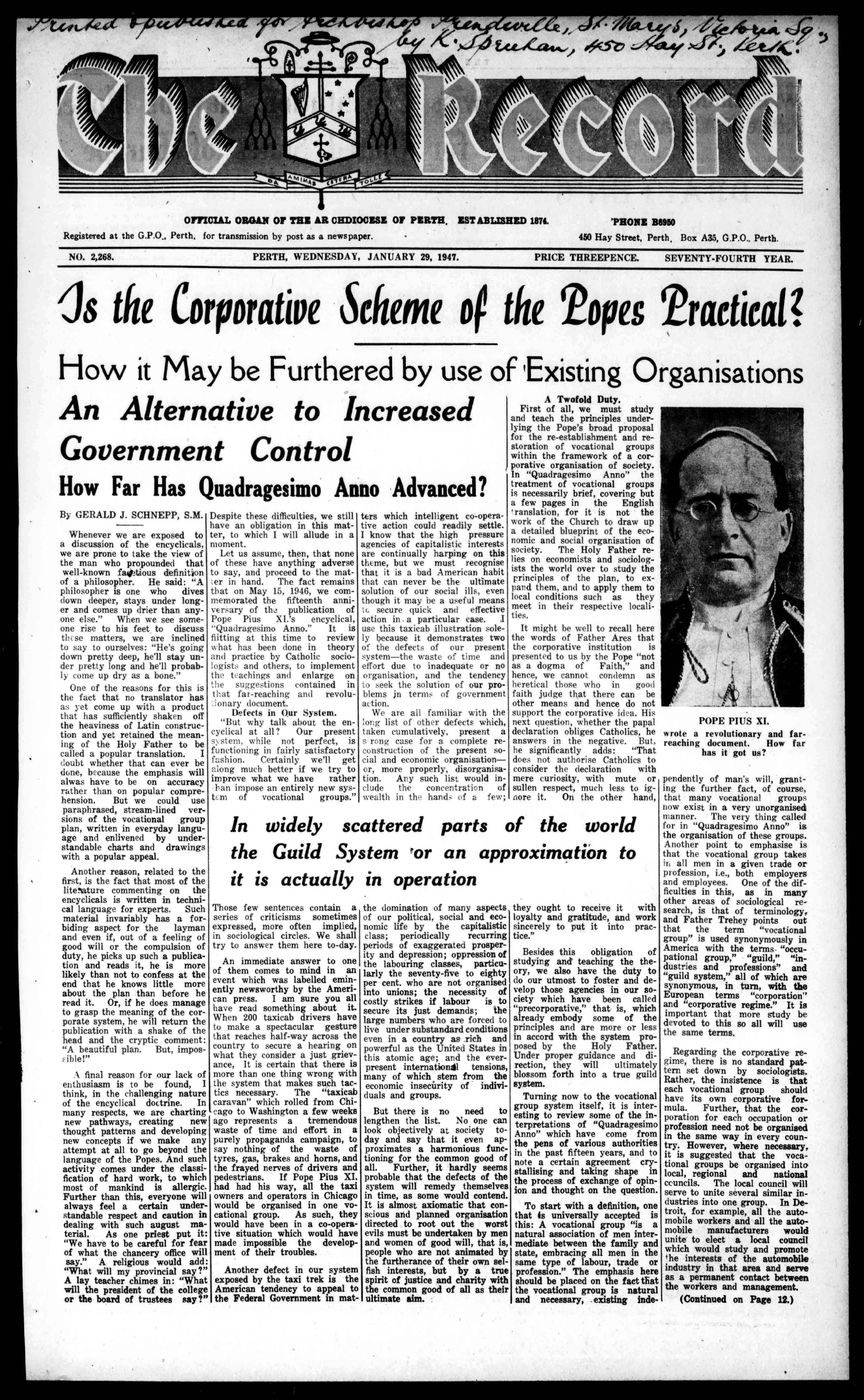 Despitethesedifficulties,westill haveanobligationinthismatter,towhichIwillalludeina moment. Letusassume,then,thatnone ofthesehaveanythingadverse tosay,andproceedtothematerinhand.Thefactremains thatonMay15,1946,wecommemoratedthefifteenthanniversaryofthepublicationof PopePiusXI.'sencyclical, "QuadragesimoAnno."Itis flittingatthistimetoreview whathasbeendoneintheory andpracticebyCatholicsociologistsandothers,toimplement theteachingsandenlargeon thesuggestionscontainedin thatfar-reachingandrevolutionarydocument. DefectsinOurSystem. "Butwhytalkabouttheencyclicalatall?Ourpresent stem,whilenotperfect,is functioninginfairlysatisfactory fashion.Certainlywe'llget alongmuchbetterifwetryto improvewhatwehaverather banimposeanentirelynewsystemofvocationalgroups."