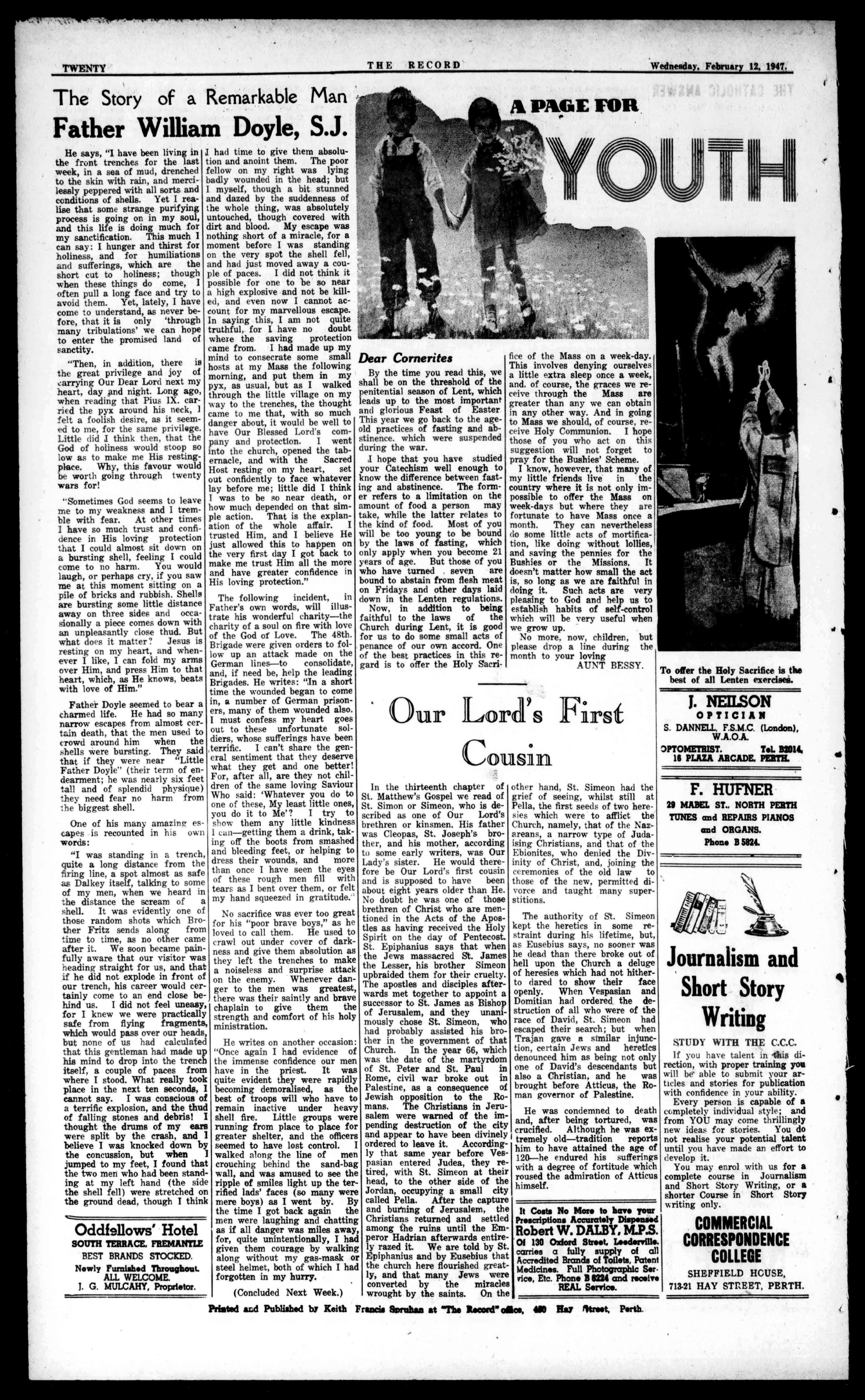 ItCostsNoMoretohaveyour PrescriptionsAccuratelyDispensed RobertW.DALBY,M.P.S. Of130OxfordStreet.LoidervMo. carriesafullysupplyofall AccreditedBrandsofToilets,Patent Medicines.FullPhotographicService,Etc.PhoneBMandreceive REALService. TooffertheHolySacrificeisthe bestofallLentenexercises. J.NEILSON OPTICIAN S.DANNELL,F.S.M.0(London), W.A.O.A. OPTOMETRIST. TeL82014, 16PLAZAARCADE,PERTH. F.HUFNER 28MABELST.,NORTHPERTH TUNESandREPAIRSPIANOS andORGANS. PhoneB5024. Journalismand ShortStory Writing STUDYWITHTHEC.C.C. Ifyouhavetalentin'thisdirection,withpropertrainingyou willbeabletosubmityourarticlesandstoriesforpublication withconfidenceinyourability. Everypersoniscapableofa completelyindividualstyle;and fromYOUmaycomethrillingly newideasforstories.Youdo notrealiseyourpotentialtalent untilyouhavemadeaneffortto developit. Youmayenrolwithusfora completecourseinJournalism andShortStoryWriting,ora shorterCourseinShortStory writingonly. COMMERCIAL CORRESPONDENCE COLLEGE SHEFFIELDHCUSE, 713-21HAYSTIZEET,PERTH. a el PrintedandPublishedbyKeithFriuxis%rub=at'TheItseeed"olles,410HasAttest,Perth.