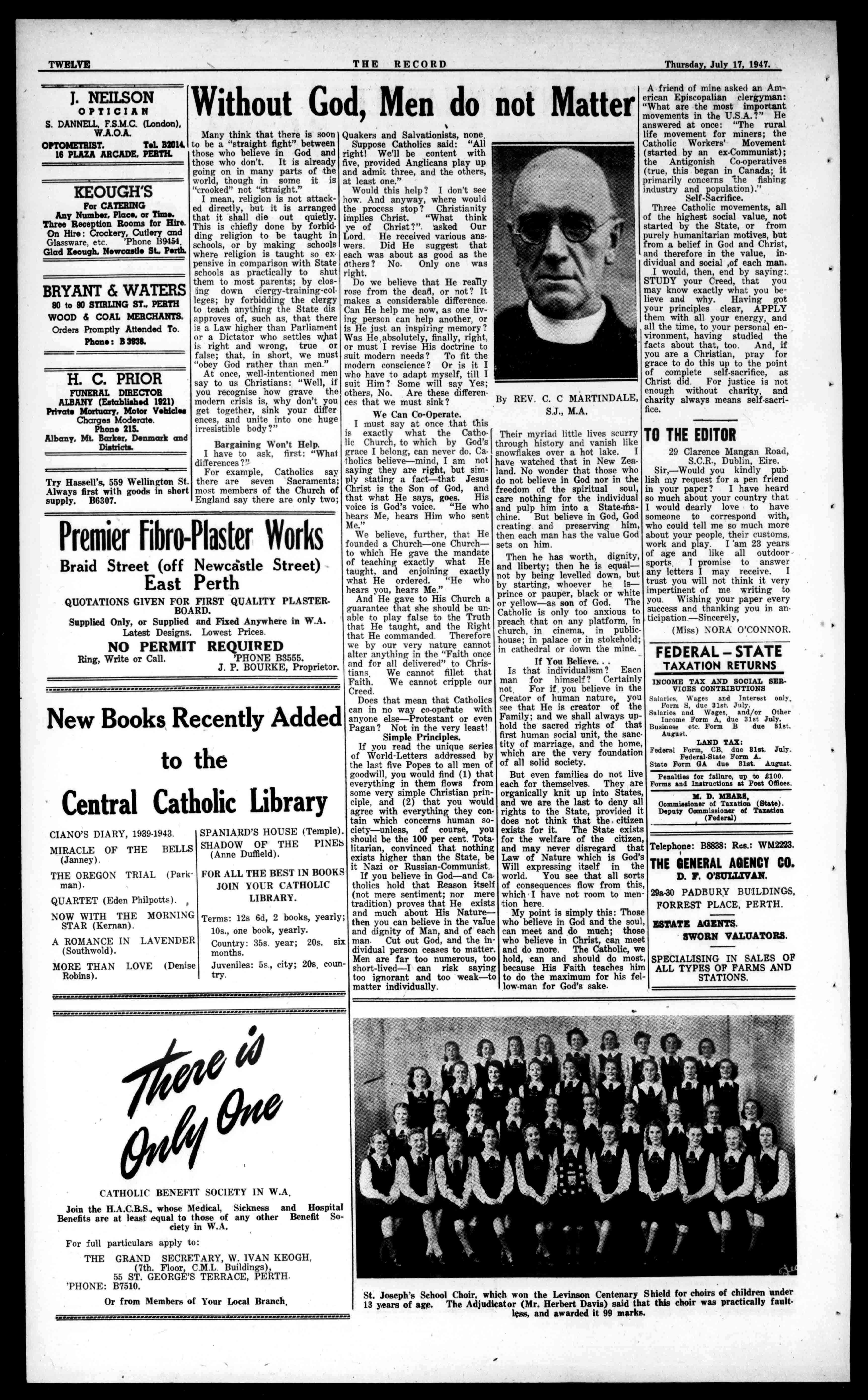 TWO THERECORD Thursday,July17,1947. PatroniseOurAdvertisers LAFAYETTE-DEASESTUDIOS WA's.LeadingandLargestPhotographers 81BARRACKSTREET,PERTH PHONES:B3606-B4514 Private:MU1706 INTERNATIONALFISHERIES 131BarrackSt.PhoneB2974 FRESHFISHTWICEDAILY. DELIVERIESANYWHERE. SupplierstoHospitals,EducationalandReligiousInstitutions. WearetheoldestandlargestFishDistributorsinWesternAustralia. FRESHROASTEDPOULTRY. WereYouOneoftheLuckyOnesthisTime? IFNOT,GETYOURTICKETFROMCHARLESWATSON&CO. £2,000for2/6..OtherPrizesbytheThousand. 76BARRACKST.(nextWilsonandJohn's) SpecialAnnouncement! Wehavepleasureinadvisingthat AnAustralianEditionof TheNewTestament NewlyTranslatedbyRT.REV.MGR.,RONALDA.KNOX,M.A. willbeavailableendofJuneanuordersforadvancecopiesare nowbeingreceived. Thisnewtraslationhasreceivedtheofficialrecognitionofthe HierarchyofEnglandandWales. Thereisanengagingfreshnessaboutthenarrativewhichcaptivatesthereader,andaclarityofexpressionwhichremoves theobscurityofnotafewpassagesinformertranslations. APELLEGRINIPUBLICATION.