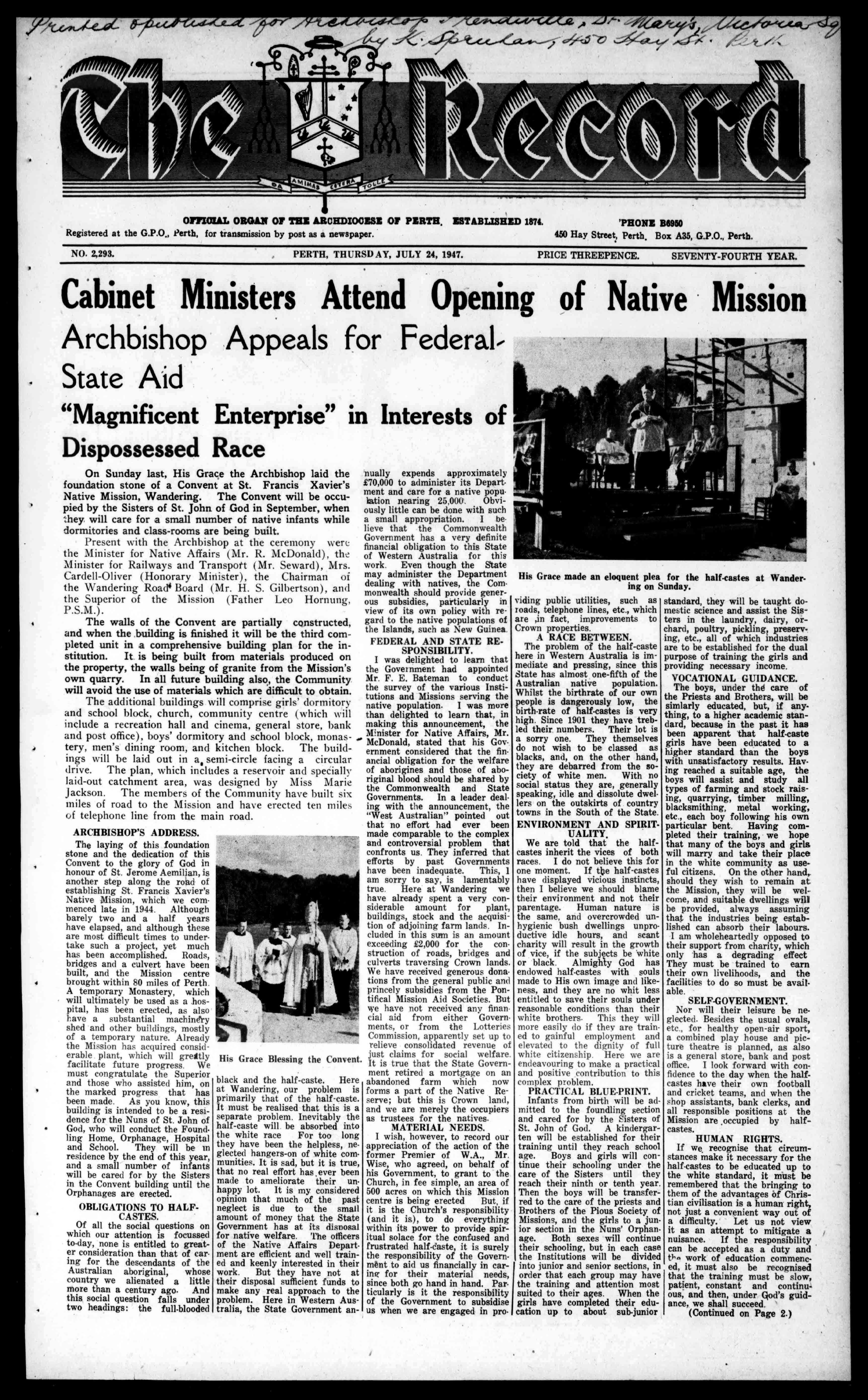 HisGraceBlessingtheConvent blackandthehalf-caste.Here atWandering,ourproblemis primarilythatofthehalf-caste. Itmustberealisedthatthisisa separateproblem.Inevitablythe half-castewillbeabsorbedinto thewhiteraceFortoolong theyhavebeenthehelpless,neglectedhangers-onofwhitecommunities.Itissad,butitistrue, thatnorealefforthaseverbeen madetoamelioratetheirunhappylot.Itismyconsidered opinionthatmuchofthepast neglectisduetothesmall amountofmoneythattheState Governmenthasatitsdisnosal fornativewelfare.Theofficers oftheNativeAffairsDepartmentareefficientandwelltrainedandkeenlyinterestedintheir work.Buttheyhavenotat theirdisposalsufficientfundsto makeanyrealapproachtothe problem.HereinWesternAustralia,theStateGovernmentan-