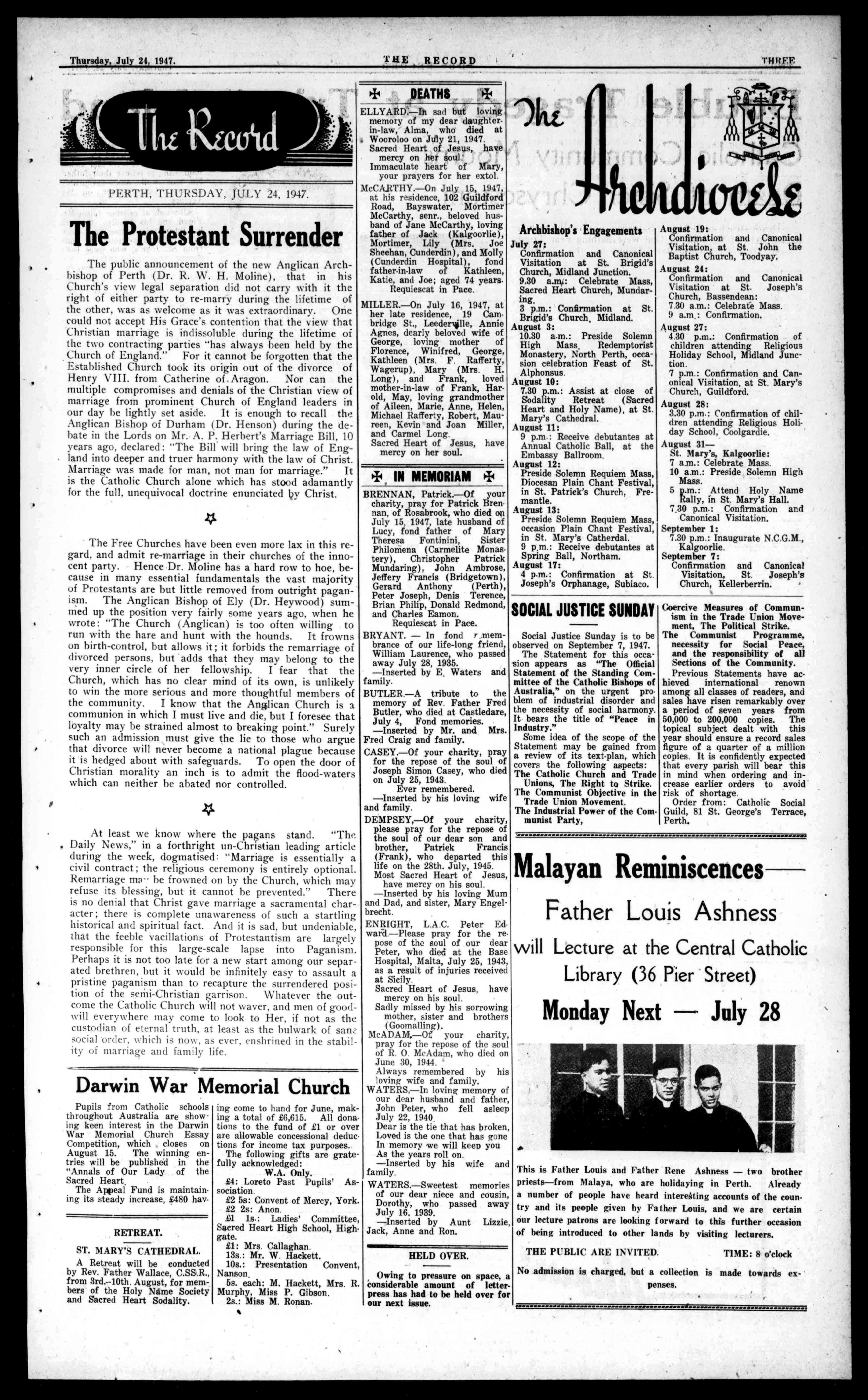 ThepublicannouncementofthenewAnglicanArchbishopofPerth(Dr.R.W.H.Moline),thatinhis Church'sviewlegalseparationdidnotcarrywithitthe rightofeitherpartytore-marryduringthelifetimeof theother,wasaswelcomeasitwasextraordinary.One couldnotacceptHisGrace'scontentionthattheviewthat Christianmarriageisindissolubleduringthelifetimeof thetwocontractingparties"hasalwaysbeenheldbythe ChurchofEngland."Foritcannotheforgottenthatthe EstablishedChurchtookitsoriginoutofthedivorceof HenryVIII.fromCatherineof.Aragon.Norcanthe multiplecompromisesanddenialsoftheChristianviewof marriagefromprominentChurchofEnglandleadersin ourdaybelightlysetaside.Itisenoughtorecallthe AnglicanBishopofDurham(Dr.Henson)duringthedebateintheLordsonMr.A.P.Herbert'sMarriageBill,10 yearsago,declared:"TheBillwillbringthelawofEnglandintodeeperandtruerharmonywiththelawofChrist. Marriagewasmadeforman,notmanformarriage."It istheCatholicChurchalonewhichhasstoodadamantly forthefull,unequivocaldoctrineenunciatedleyChrist.