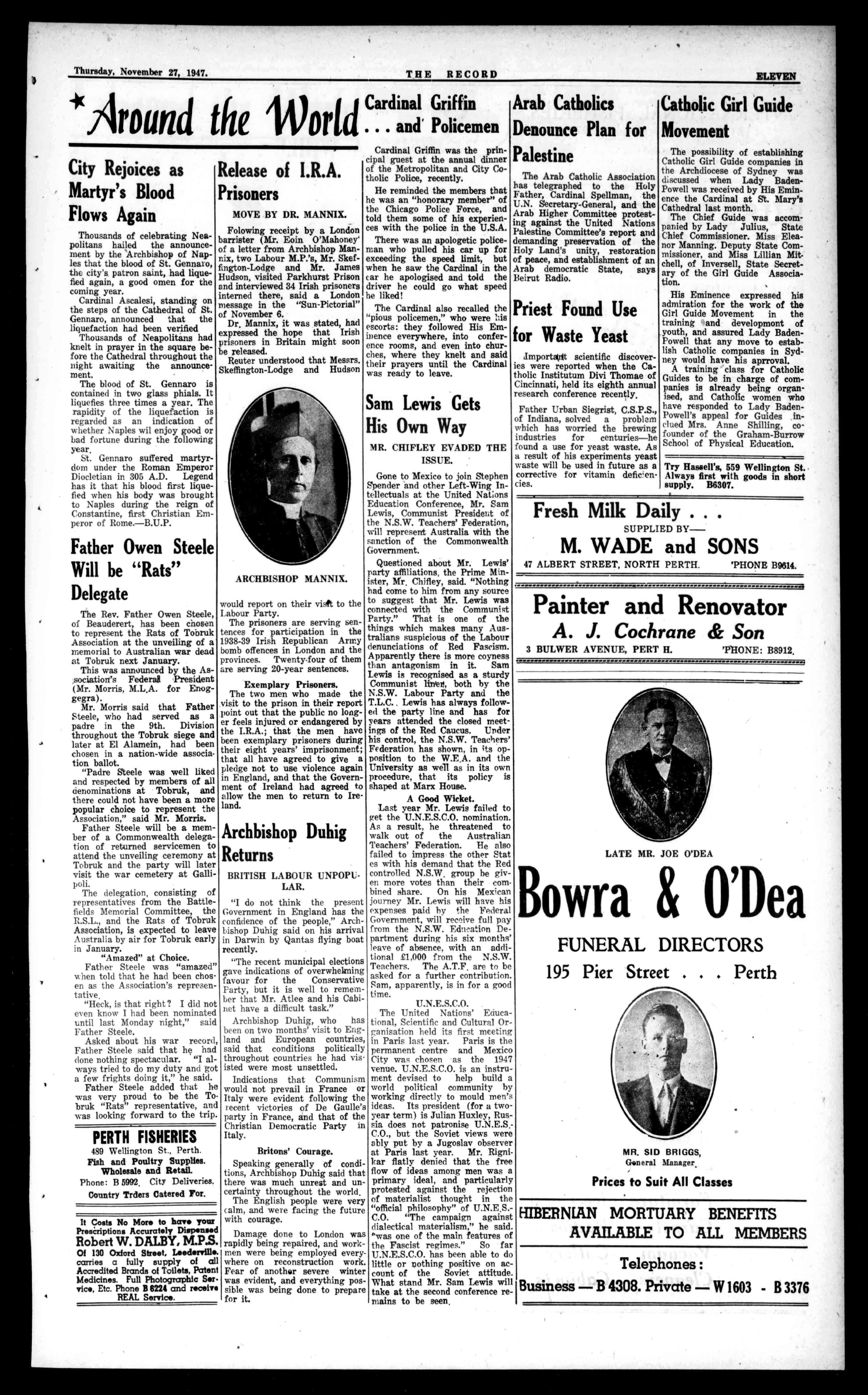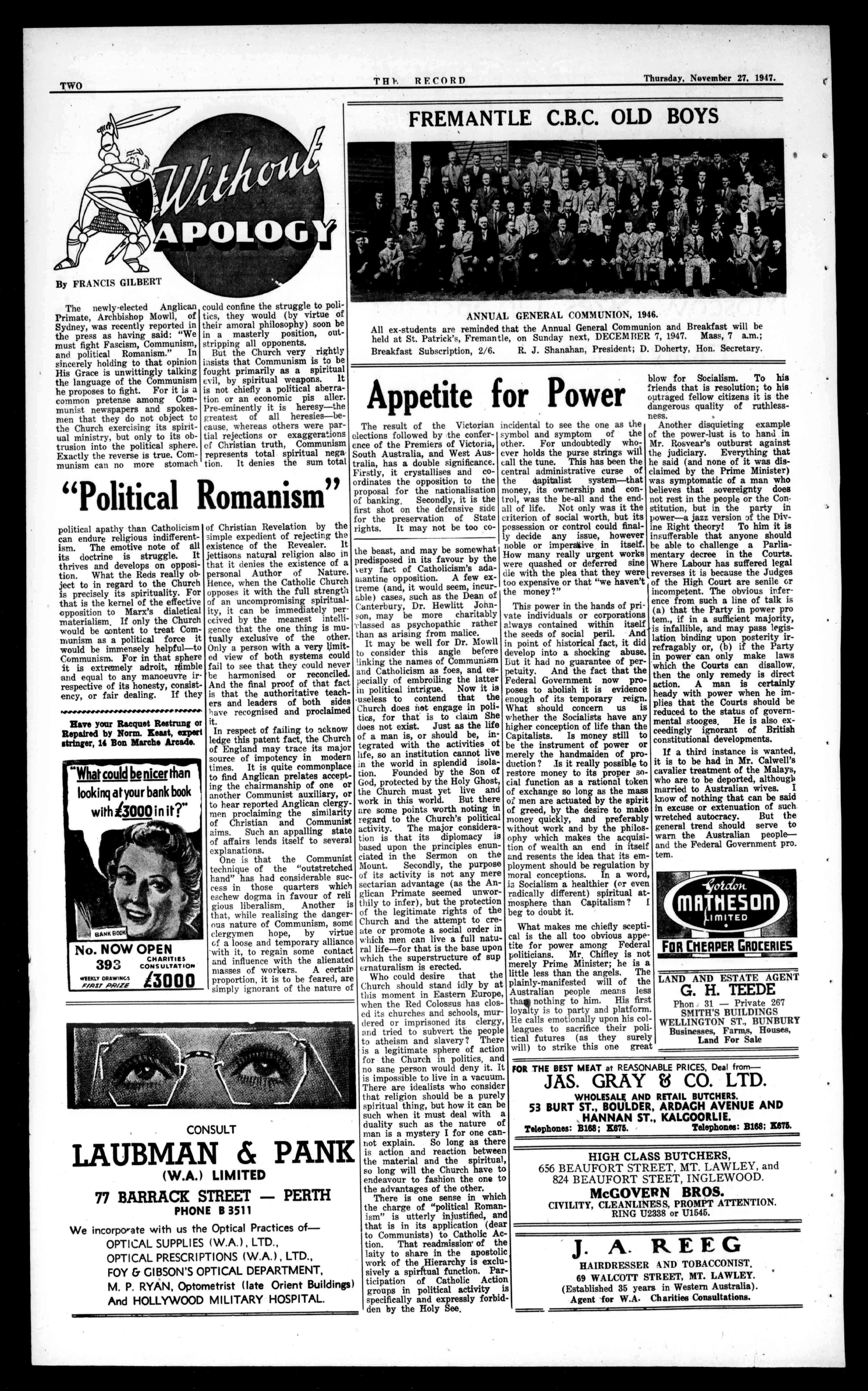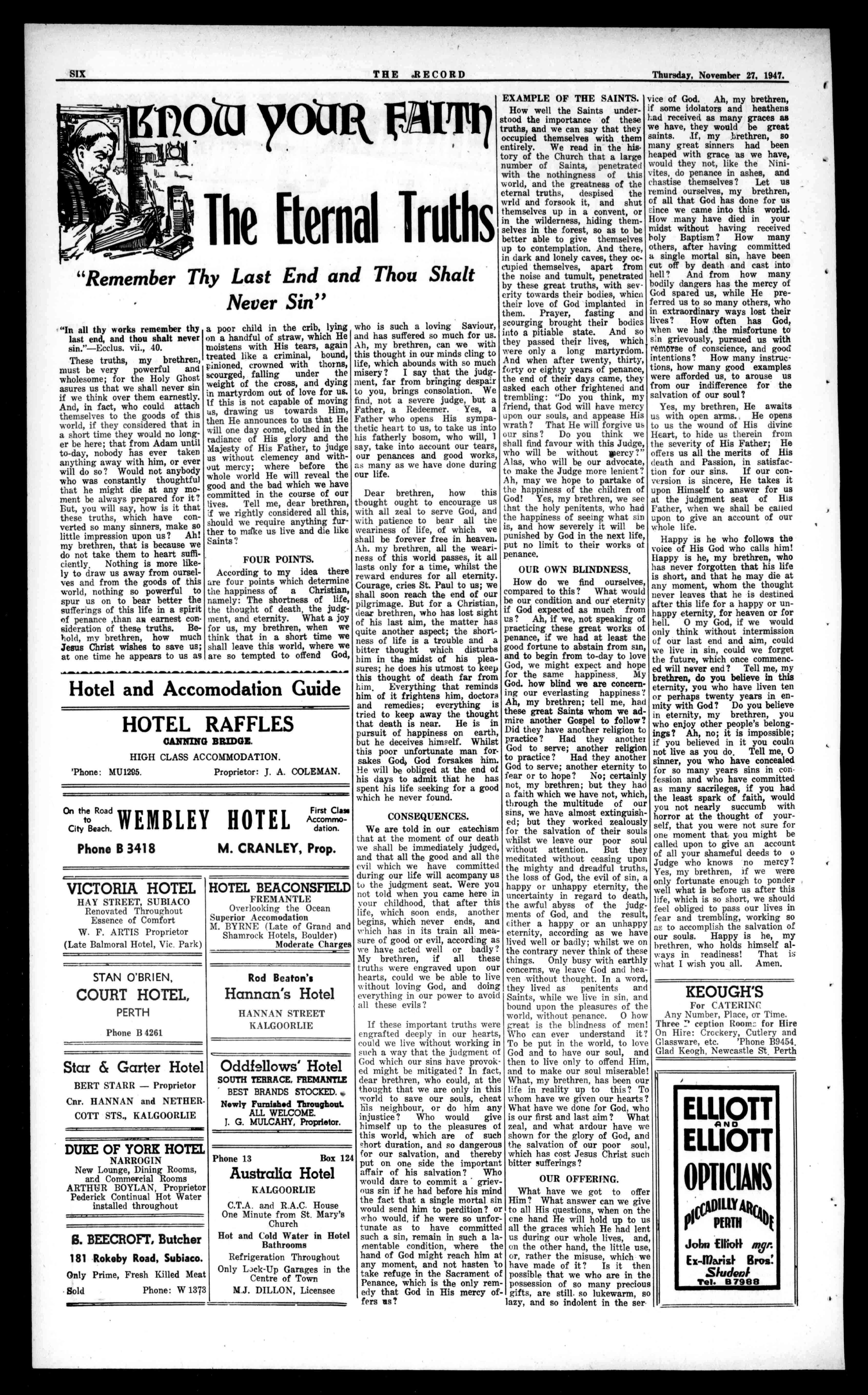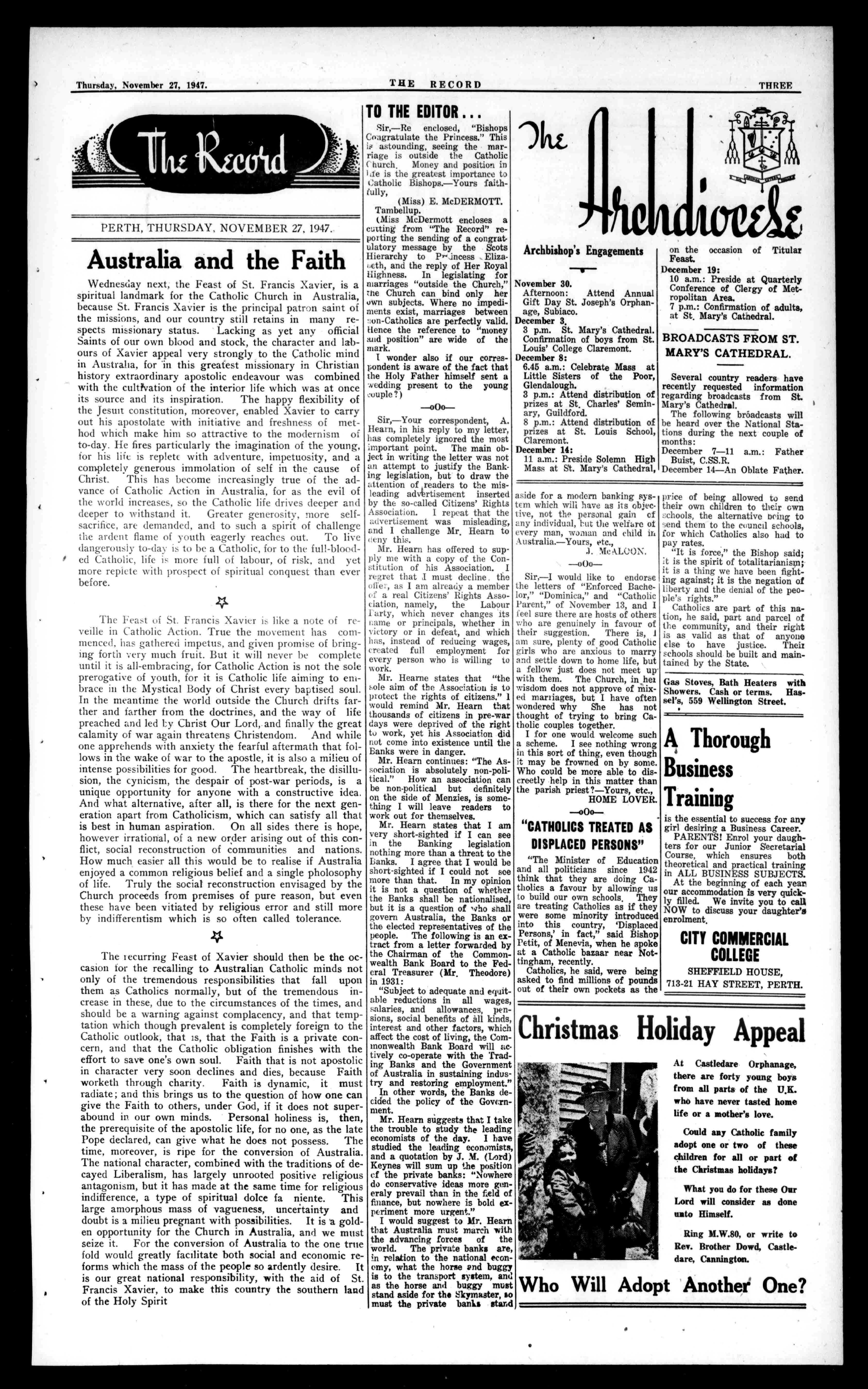 OFFICIALORGANOFTHEARCHDIOCESEOFPERTH,ESTABLISHED1874 RegisteredattheG.P.O.,Perthfortransmissionbypostasanewspaper. 'PHONEB6950 450HayStreet,Perth.BoxA35,G.P.OPerth NO.2,311. PERTH,THURSDAY,NOVEMBER27,1947. PRICETHREEPENCE. SEVENTY-FOURTHYEAR,.