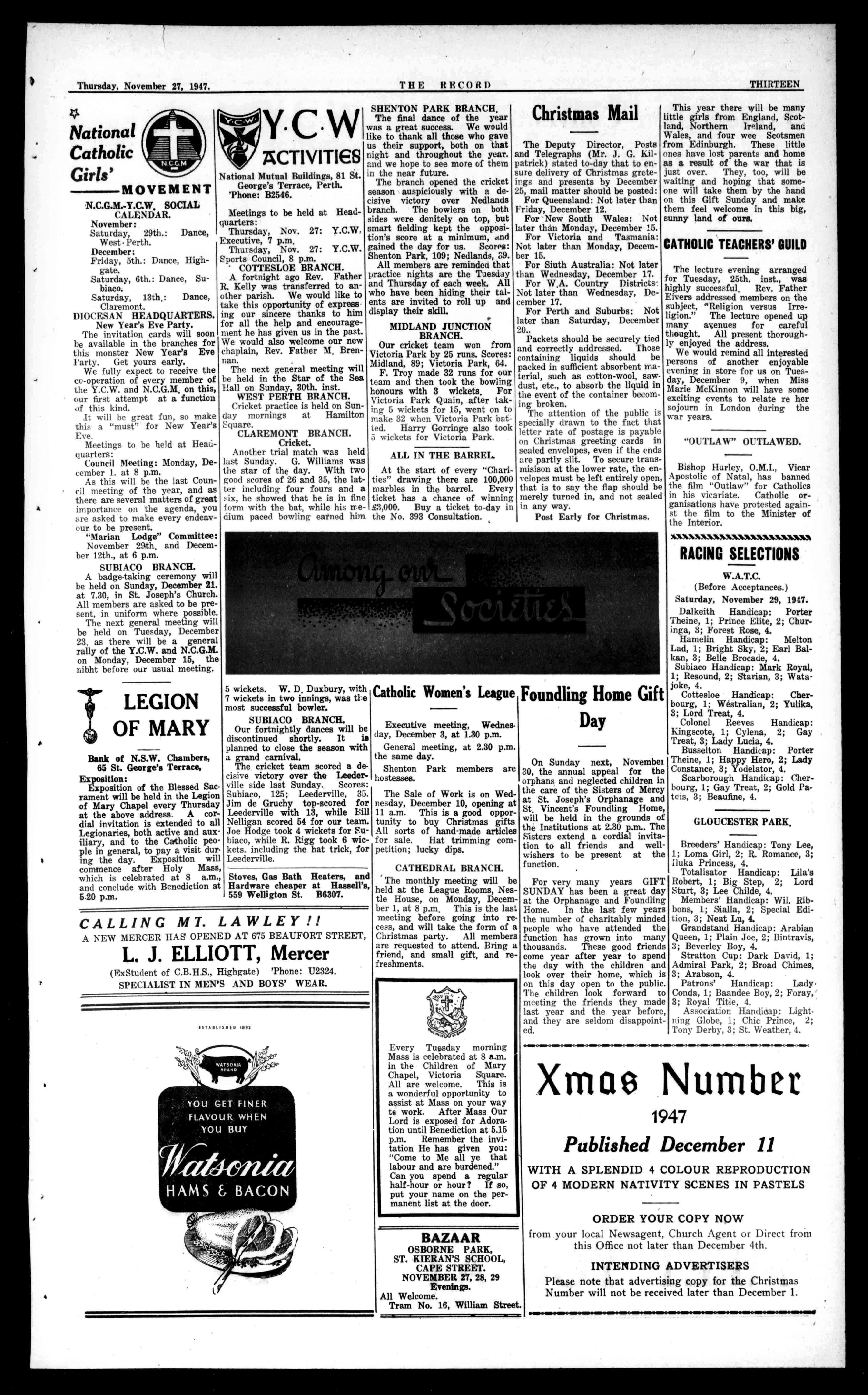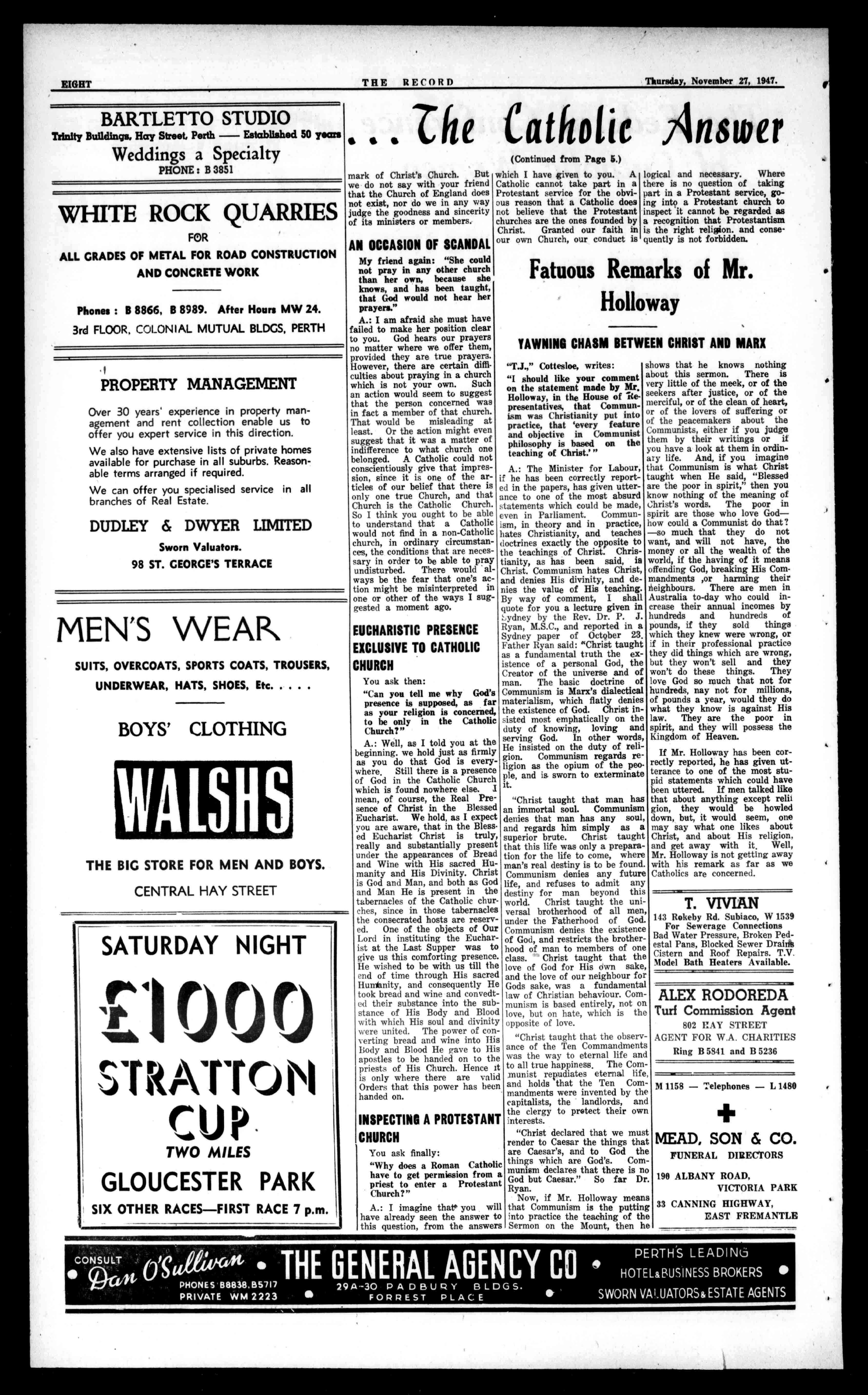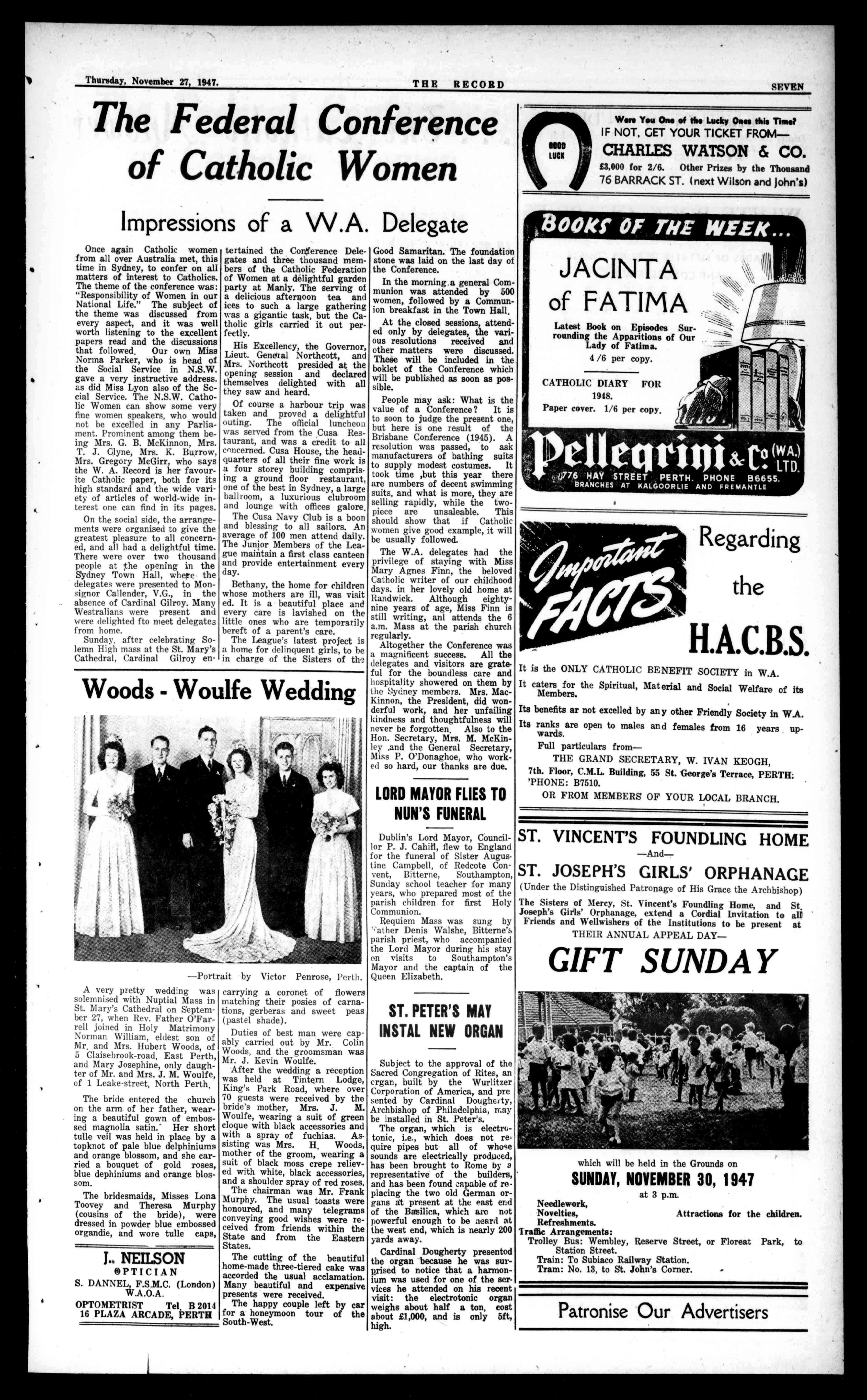 OFFICIALORGANOFTHEARCHDIOCESEOFPERTH,ESTABLISHED1874 RegisteredattheG.P.O.,Perthfortransmissionbypostasanewspaper. 'PHONEB6950 450HayStreet,Perth.BoxA35,G.P.OPerth NO.2,311. PERTH,THURSDAY,NOVEMBER27,1947. PRICETHREEPENCE. SEVENTY-FOURTHYEAR,.