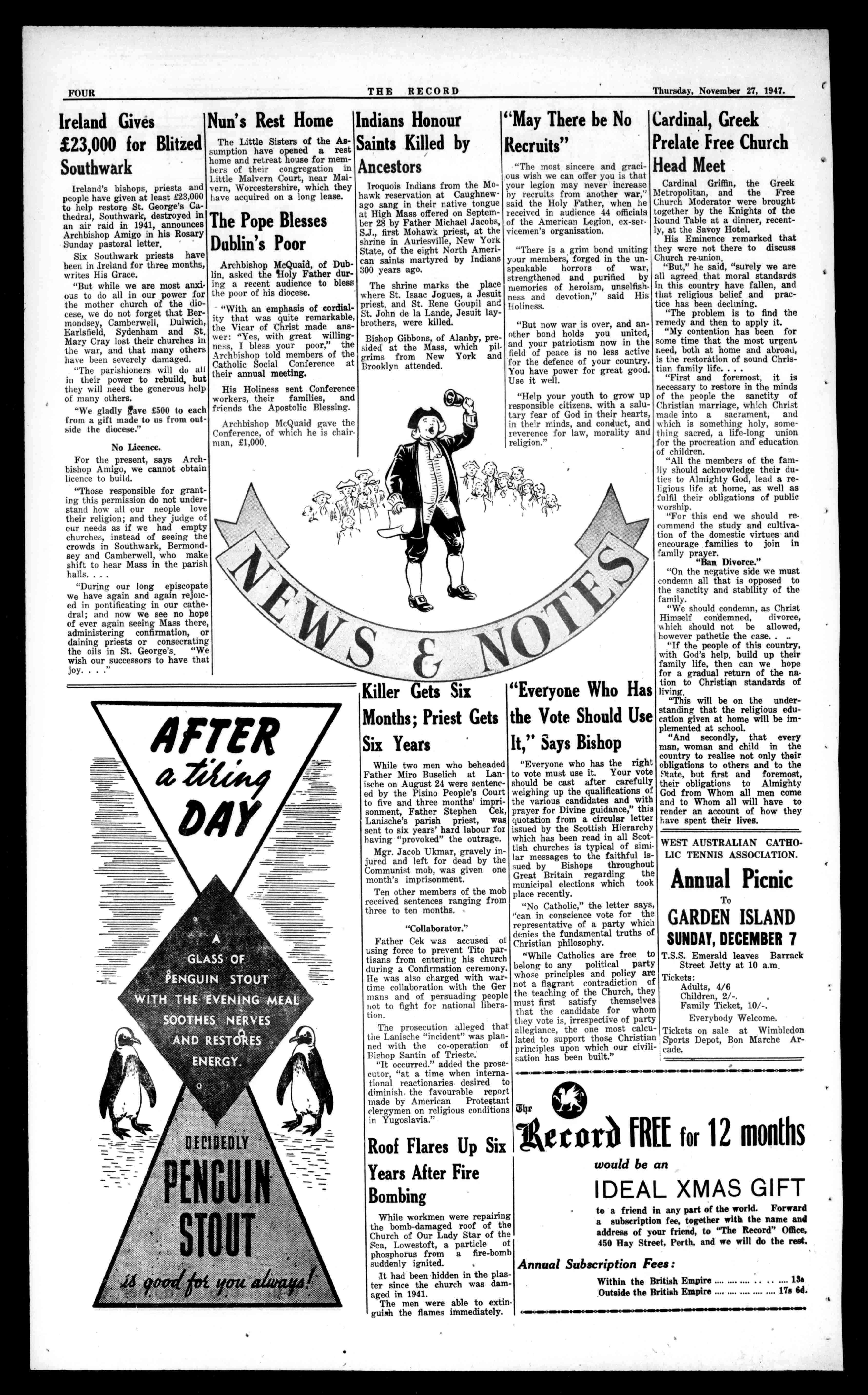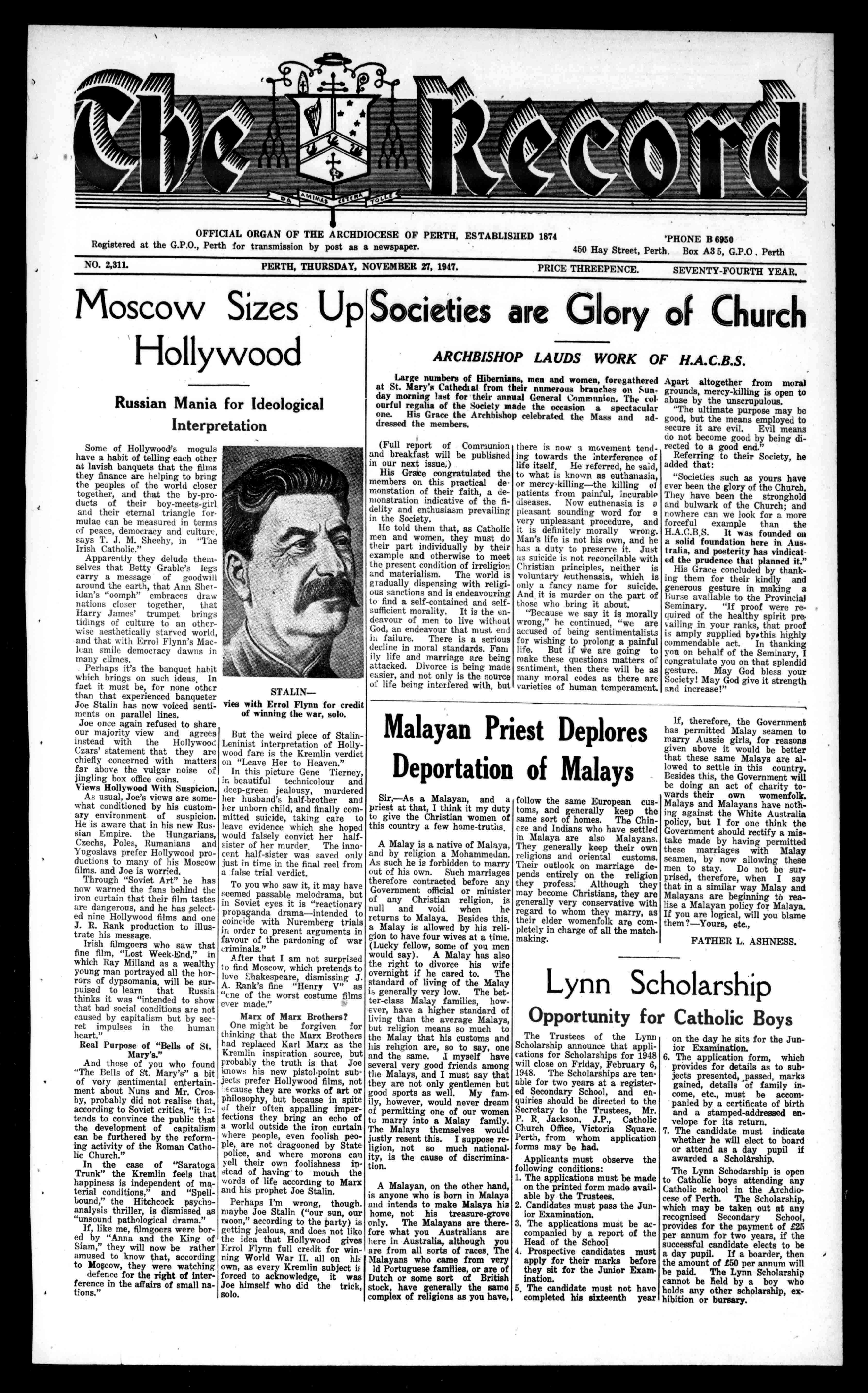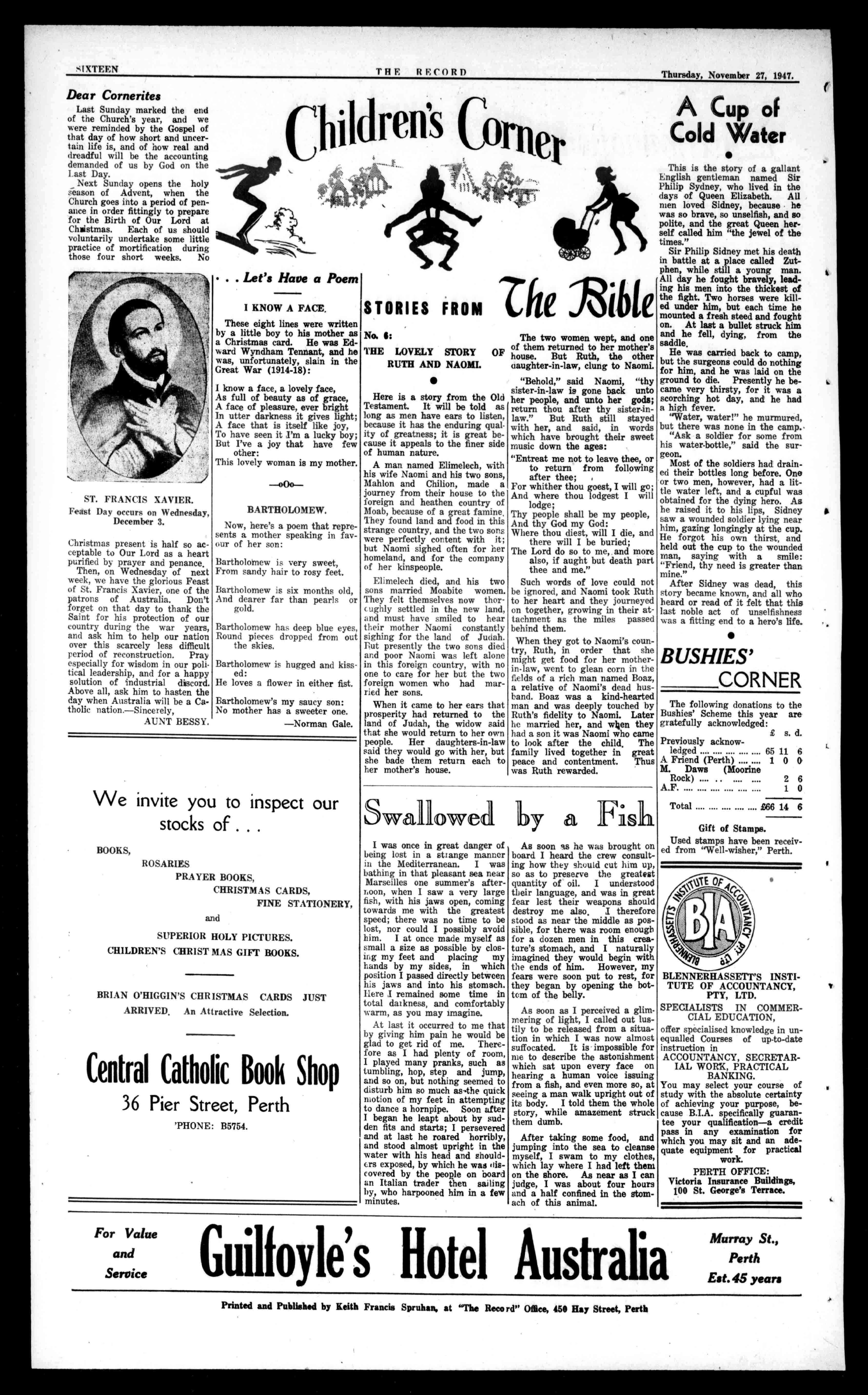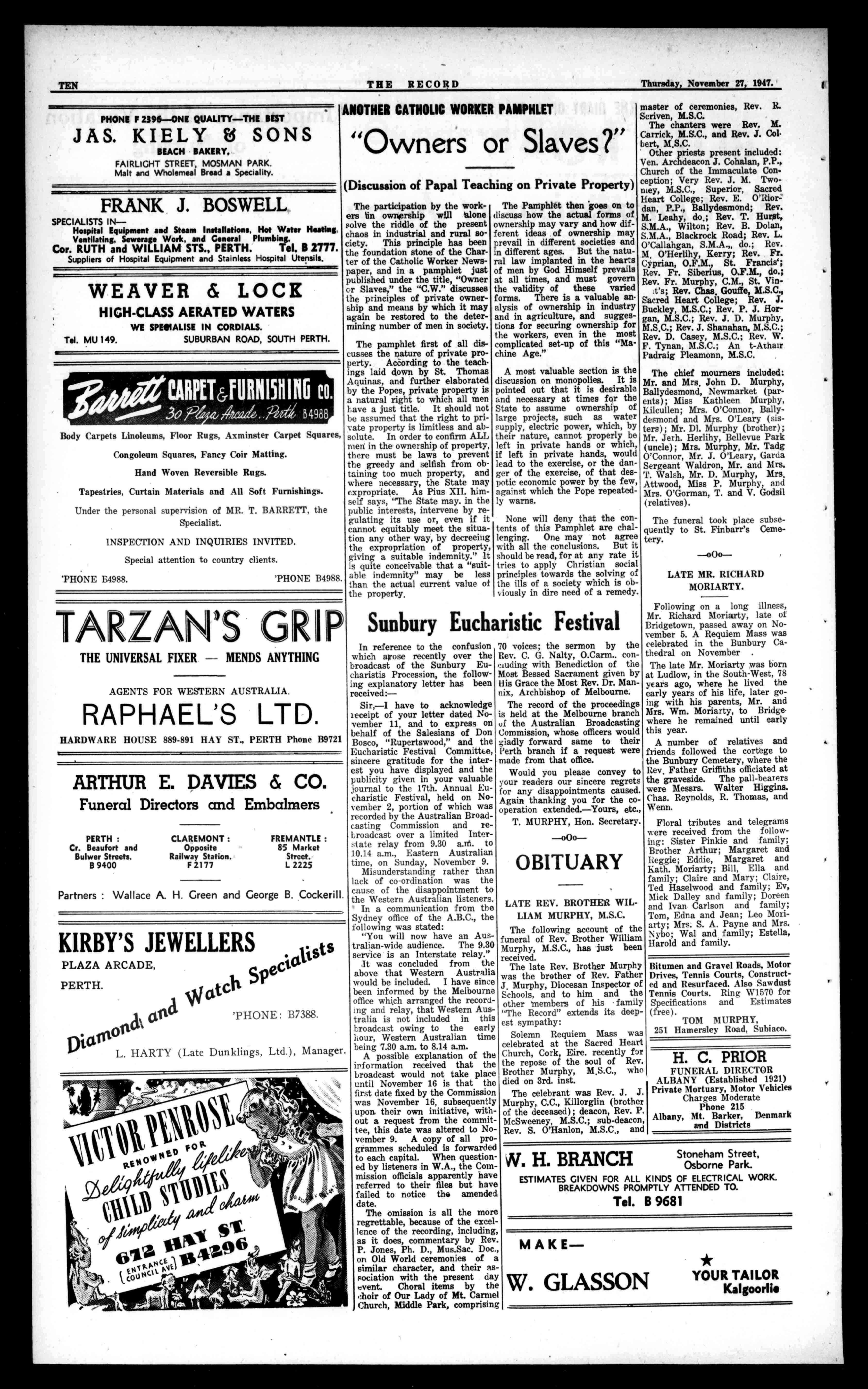 OFFICIALORGANOFTHEARCHDIOCESEOFPERTH,ESTABLISHED1874 RegisteredattheG.P.O.,Perthfortransmissionbypostasanewspaper. 'PHONEB6950 450HayStreet,Perth.BoxA35,G.P.OPerth NO.2,311. PERTH,THURSDAY,NOVEMBER27,1947. PRICETHREEPENCE. SEVENTY-FOURTHYEAR,.