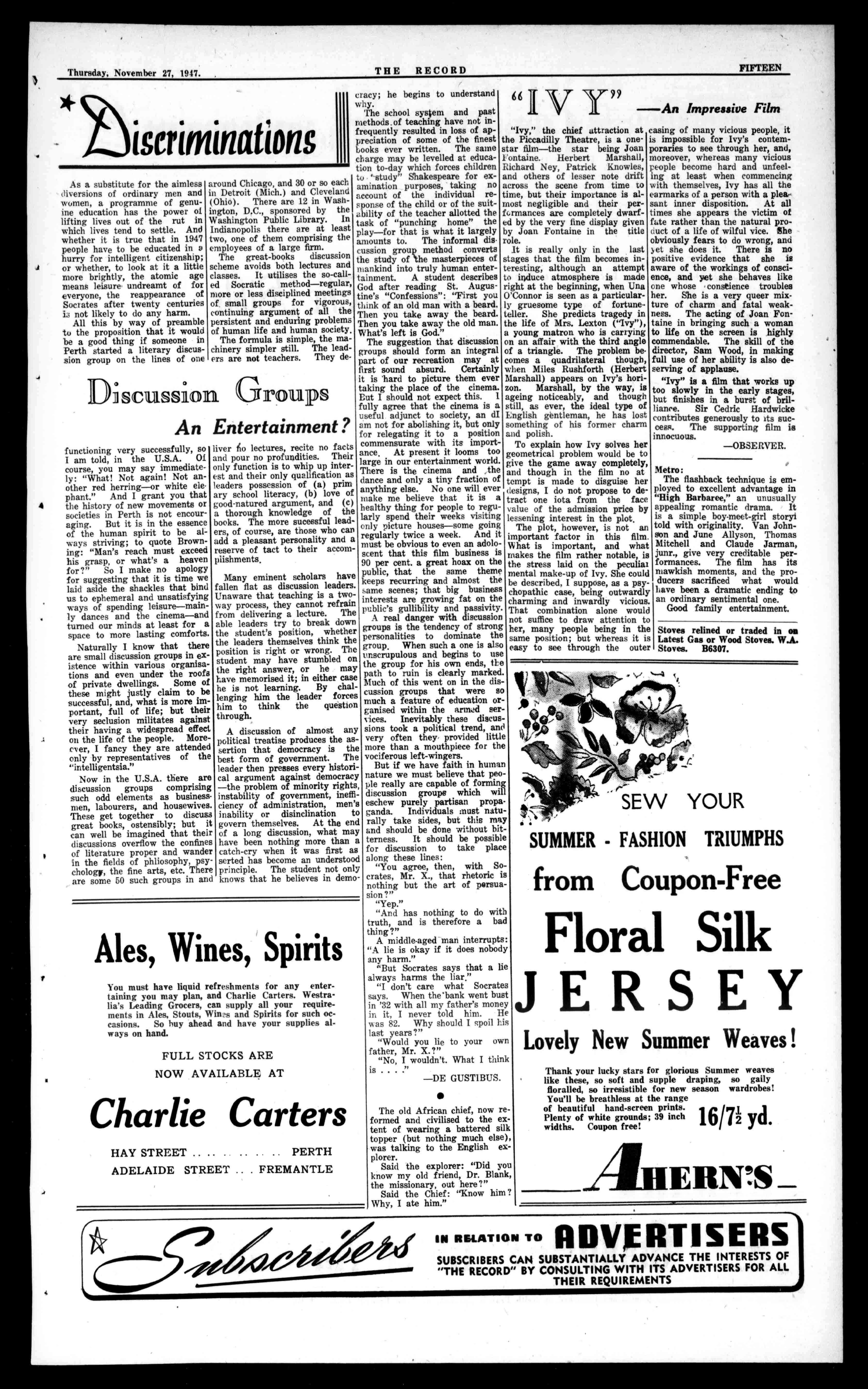 Thesuggestionthatdiscussion groupsshouldformanintegral partofourrecreationmayat firstsoundabsurd.Certainly itis'hardtopicturethemever takingtheplaceofthecinema. EutIshouldnotexpectthis. 1 fullyagreethatthecinemaisa usefuladjuncttosociety,andI amnotforabolishingit,butonly forrelegatingittoaposition commensuratewithitsimportance.Atpresentitloomstoo largeinourentertainmentworld. Thereisthecinemaandthe Glanceandonlyatinyfractionof anythingelse.Noonewillever makemebelievethatitisa healthythingforpeopletoregularlyspendtheirweeksvisiting onlypicturehouses-somegoing regularlytwiceaweek.Andit mustbeobvioustoevenanadoloscentthatthisfilmbusinessis 90percent.agreathoaxonthe public,thatthesametheme keepsrecurringandalmostthe samescenes;thatbigbusiness interestsaregrowingfatonthe public'sgullibilityandpassivity.