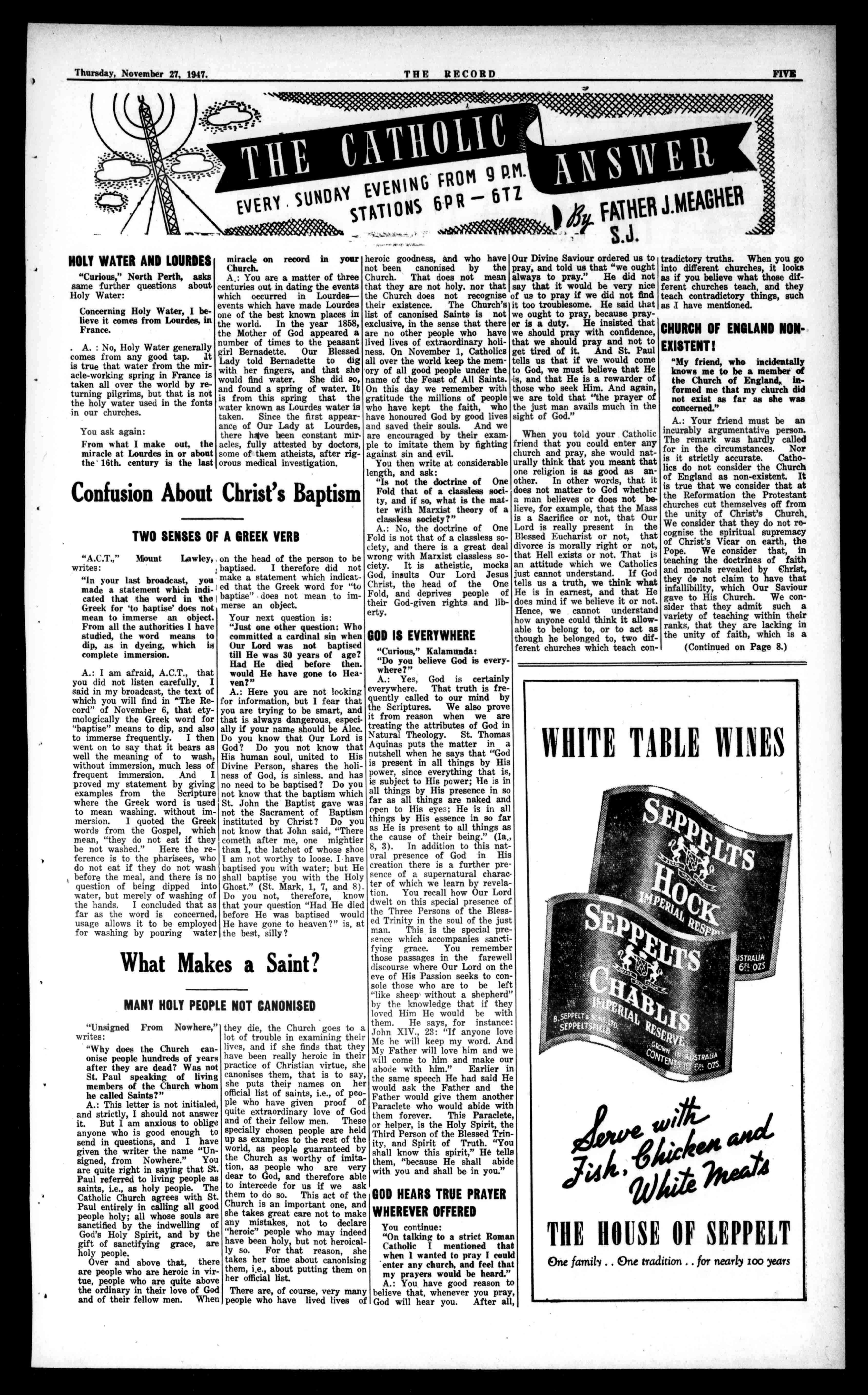 ItmaybewellforDr.Mowll toconsiderthisanglebefore !inkingthenamesofCommunism andCatholicismasfoes,andespeciallyofembroilingthelatter inpoliticalintrigue.Nowitis uselesstocontendthatthe Churchdoesnetengageinpolitics,forthatistoilarmShe doesnotexist.Justasthelife ofamanis,orshouldbe,integratedwiththeactivitiesof life,soaninstitutioncannotlive intheworldinsplendidisolation.FoundedbytheSonof God,protectedbytheHolyGhost, theChurchmustyetliveand workinthisworld.Butthere aresomepointsworthnotingin regardtotheChurch'spolitical activity.Themajorconsiderationisthatitsdiplomacyis basedupontheprinciplesenunciatedintheSermononthe Mount.Secondly,thepurpose ofitsactivityisnotanymere sectarianadvantage(astheAnglicanPrimateseemedunworthilytoinfer),buttheprotection ofthelegitimaterightsofthe Churchandtheattempttocreateorpromoteasocialorderin whichmencanliveafullnaturallife-forthatisthebaseupon whichthesuperstructureofsup ernaturalismiserected.