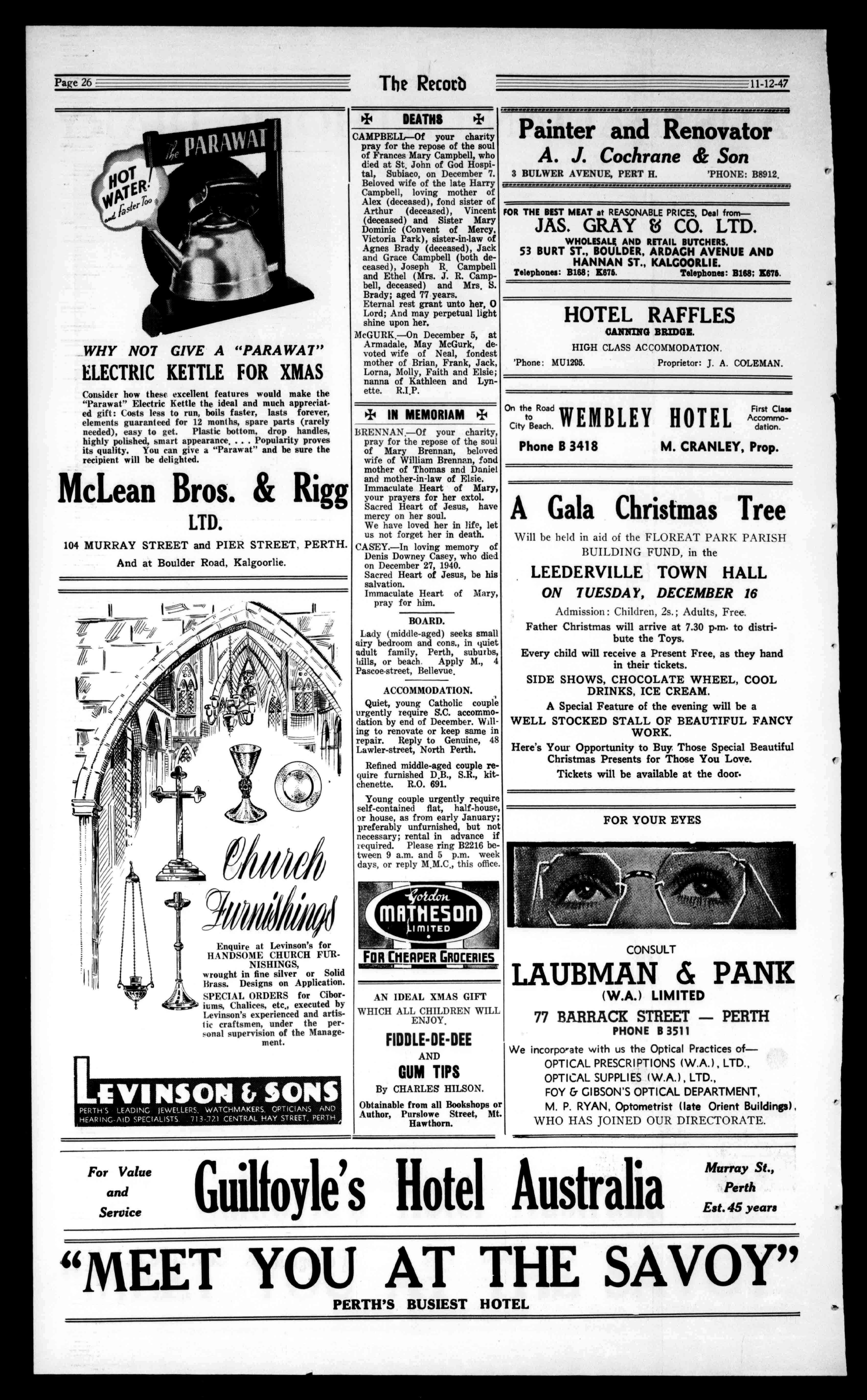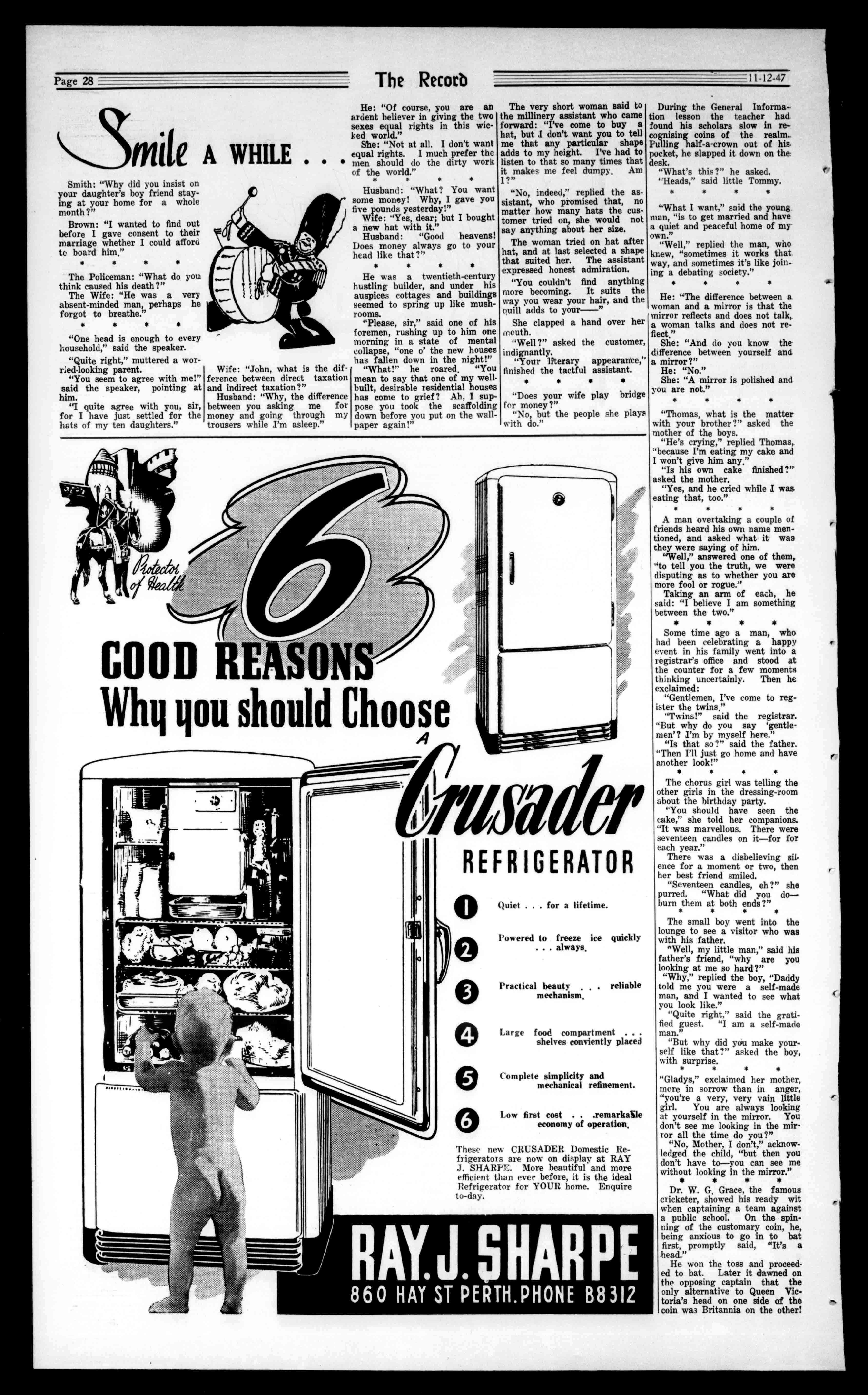 Page4 TheRecord 11-12-47 Seethenewmodelnow it'stheRefrigeratoryou'll beproudof,combining*LASTINGEFFICIENCY *SILENTOPERATION *STREAMLINEDBEAUTY thethreeessentialsfortheperfecthousehold Refrigerator. Economicallyoperatedbykerosene,withasimple,precision-builtfreezingunitthathasnomovingparts,and isguaranteedfor5YEARS. TheRefrigerator alreadyserving over7,000W.A. Countryhomes. PlanAheadBookYourOrder DIST0. 1 BUT0A S 0ALGETYCEl.LTD. DEVOTIONALCHRISTMAS EightSubjectsinSepia'Collings. Serifs11.101:Thispictorialseriesoffersafineselectionofclearlyprinteddesigns,withXmasgreetingsandwell-expressedwishesprintedbeneath. Personalmessagescanbewrittenontheback. Size,41x21ins. 1d.each;6d.dozen. Series11402:SimilartotheabovebutaDouble Cardandthewishisontheinnerpage.Size 41x21ins. ld.each;11d.dozen, Series11403-Another SepiaCarlwhichIS suretobepopularthis year.It'saFrenchfoldwithPictureand Greetingsonthefront, andtheWishoncentre page. AVeryNiceCard. 3d.each;2/9dozen. Series11417:Neatlydesignedandbeautifully coloured,withwishesoncoverandinsidepage. TheillustrationsarereproductionsoftheOld Masters.Printedonheavyartpaper:6d.each;5/6dozen Series11420-Amost attractive Double French-fold Card, printedinadelicate night-blueshade.The designsandwishes areveryappealing, andthere'squitea variety. 6d.each;5/6dozen.