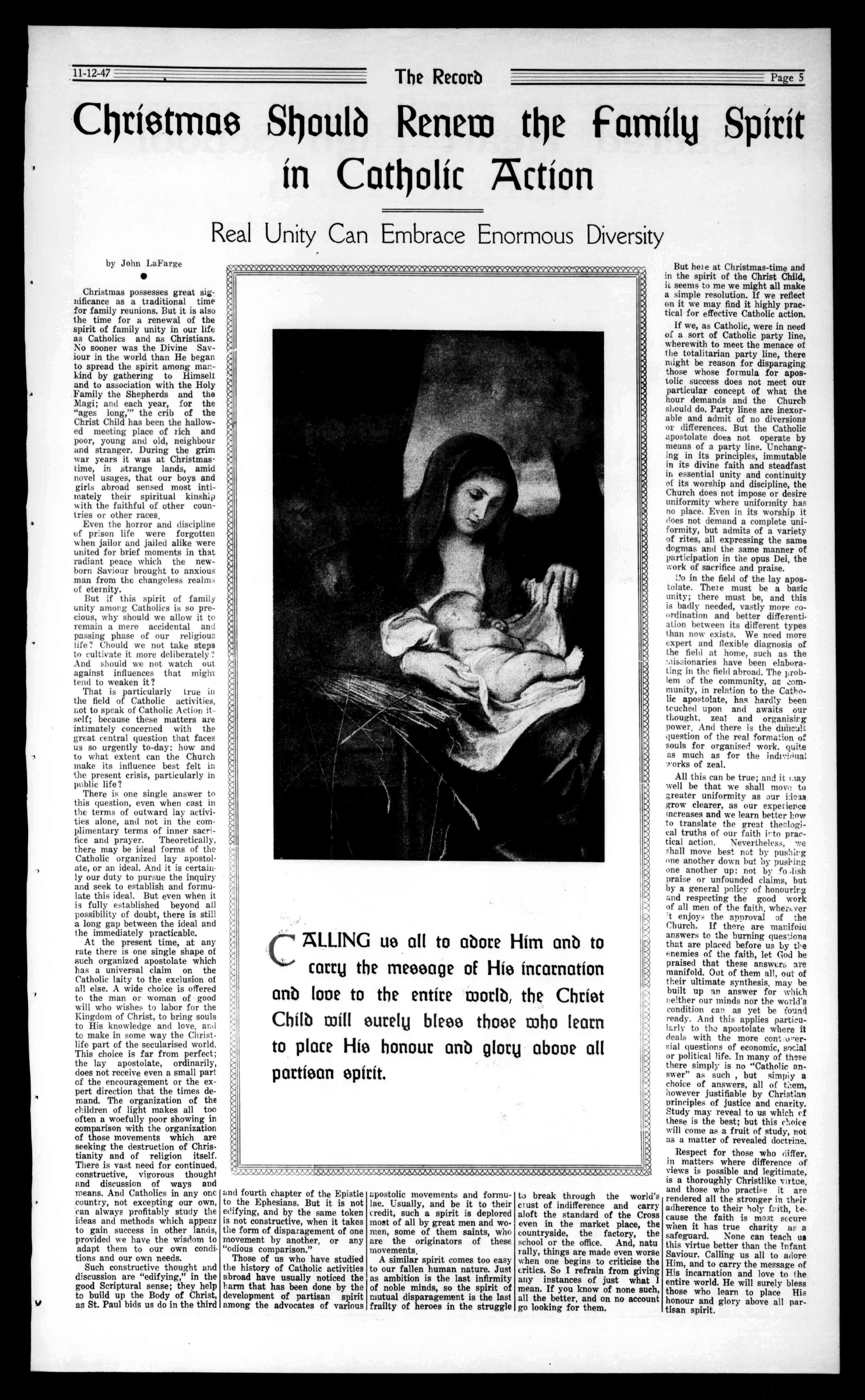 ButheieatChristmas-timeand inthespiritoftheChristChild, isseemstomewemightallmake asimpleresolution.Ifwereflect onitwemayfindithighlyprac- ticalforeffectiveCatholicaction, Ifwe,asCatholic,wereinneed ofasortofCatholicpartyline, wherewithtomeetthemenaceof thetotalitarianpartyline,there mightbereasonfordisparaging thosewhoseformulaforapos- tolicsuccessdoesnotmeetour particularconceptofwhatthe hourdemandsandtheChurch shoulddo.Partylinesareinexorableandadmitofnodiversions ordifferences.ButtheCatholic apostolatedoesnotoperateby meansofapartyline.Unchanginginitsprinciples,immutable initsdivinefaithandsteadfast inessentialunityandcontinuity ofitsworshipanddiscipline,the Churchdoesnotimposeordesire uniformitywhereuniformityhas noplace.Eveninitsworshipit doesnotdemandacompleteuni-formity,butadmitsofavariety ofrites,allexpressingthesame dogmasandthesamemannerof participationintheopusDei,the workofsacrificeandpraise.