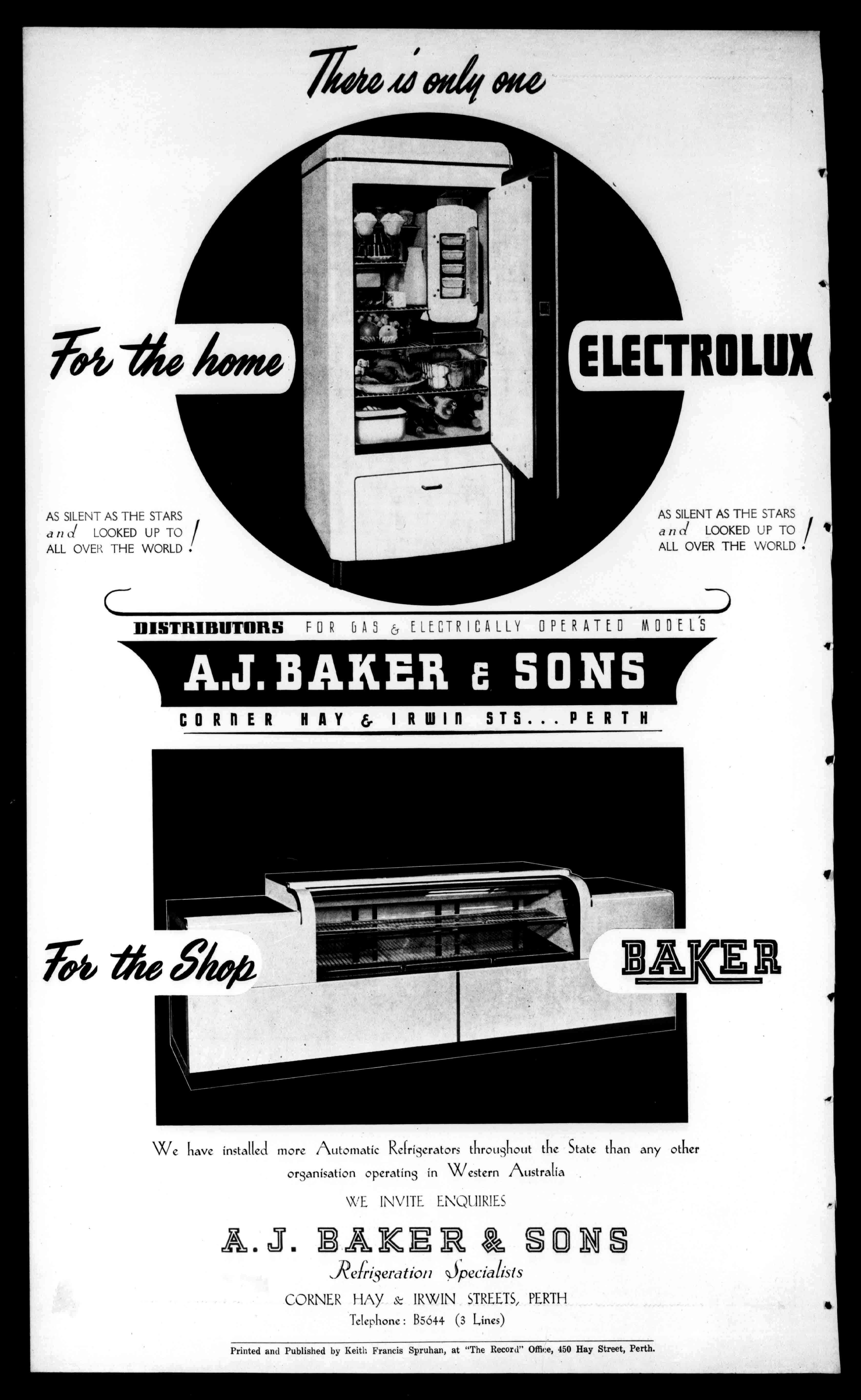 ASSILENTASTHESTARS an(1LOOKEDUPTO/ ALLOVERTHEWORLD ELECTROLUX ASSILENTASTHESTARS andLOOKEDUPTO/ ALLOVERTHEWORLD DISTRIBUTORSFORGASUELECTRICALLYOPERATEDMODEL'S A.J.BAKERaSONS CORRERHAY& RwinSTS...PERTH rt*theSkift WehaveinstalledmoreAutomaticRefrigeratorsthroughouttheStatethananyother organisationoperatinginWesternAustralia WEINVITEENQ[IIRIES A.J.BAKER&SON'S .Reb13erc,tio,oPecialists CORNERHAY IRWINSTREETS,PERTH TelephoneB5644(3Lines) 0 V 4 PrintedandPublishedbyKeithFrancisSpruhan,at"TheRecord"Office,450HayStreet,Perth.