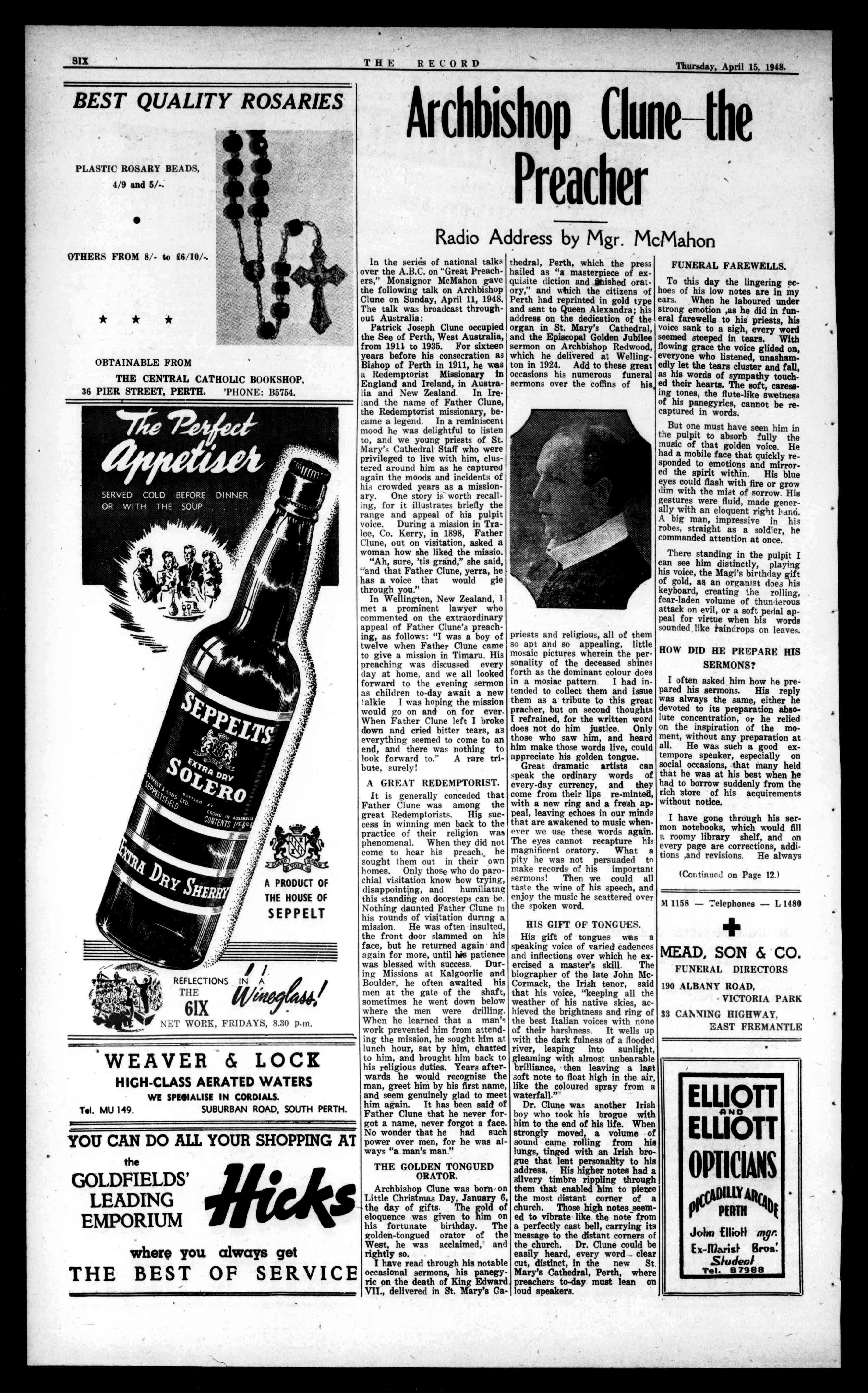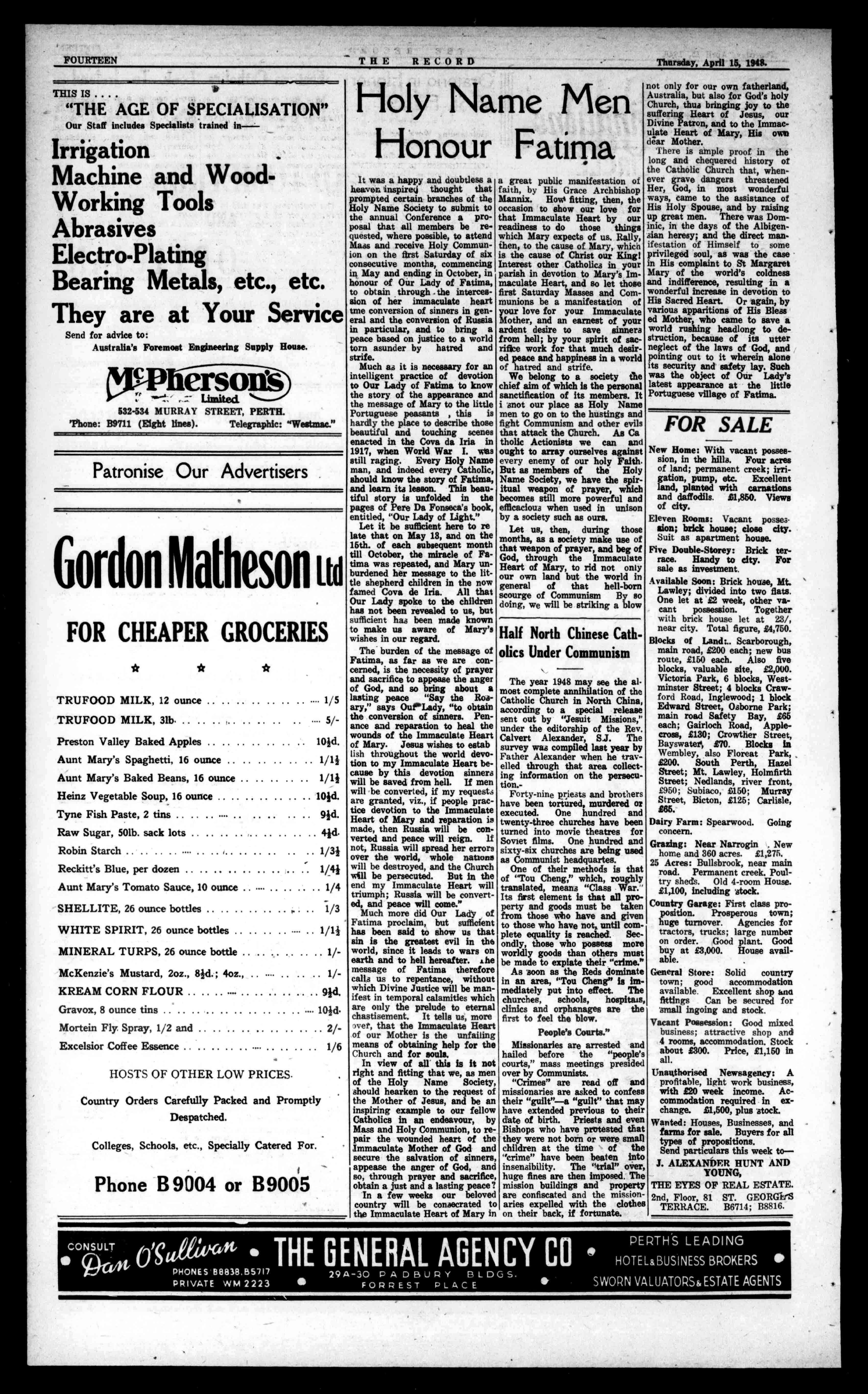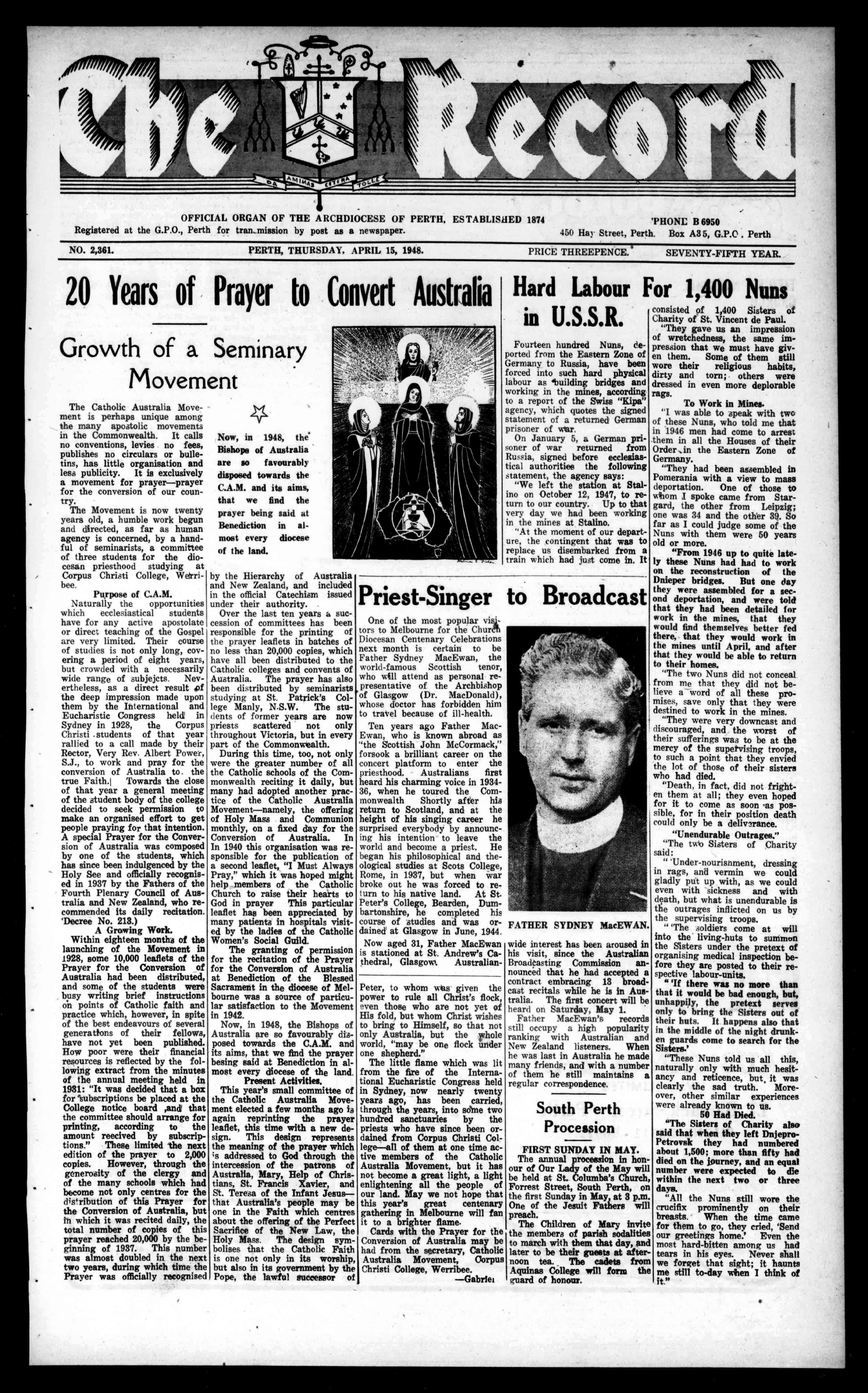 OFFICIALORGANOFTHEARCHDIOCESEOFPERTH.ESTABLISLIED1874 RegisteredattheG.P.O.,Perthfortran,missionbypostasanewspaper. 'PHONEB6950 450HayStreet,Perth.BoxA35,G.P.OPerth NO.2,361. PERTH,THURSDAY,APRIL15,1948. PRICETHREEPENCE.' SEVENTY-FIFTHYEAR.