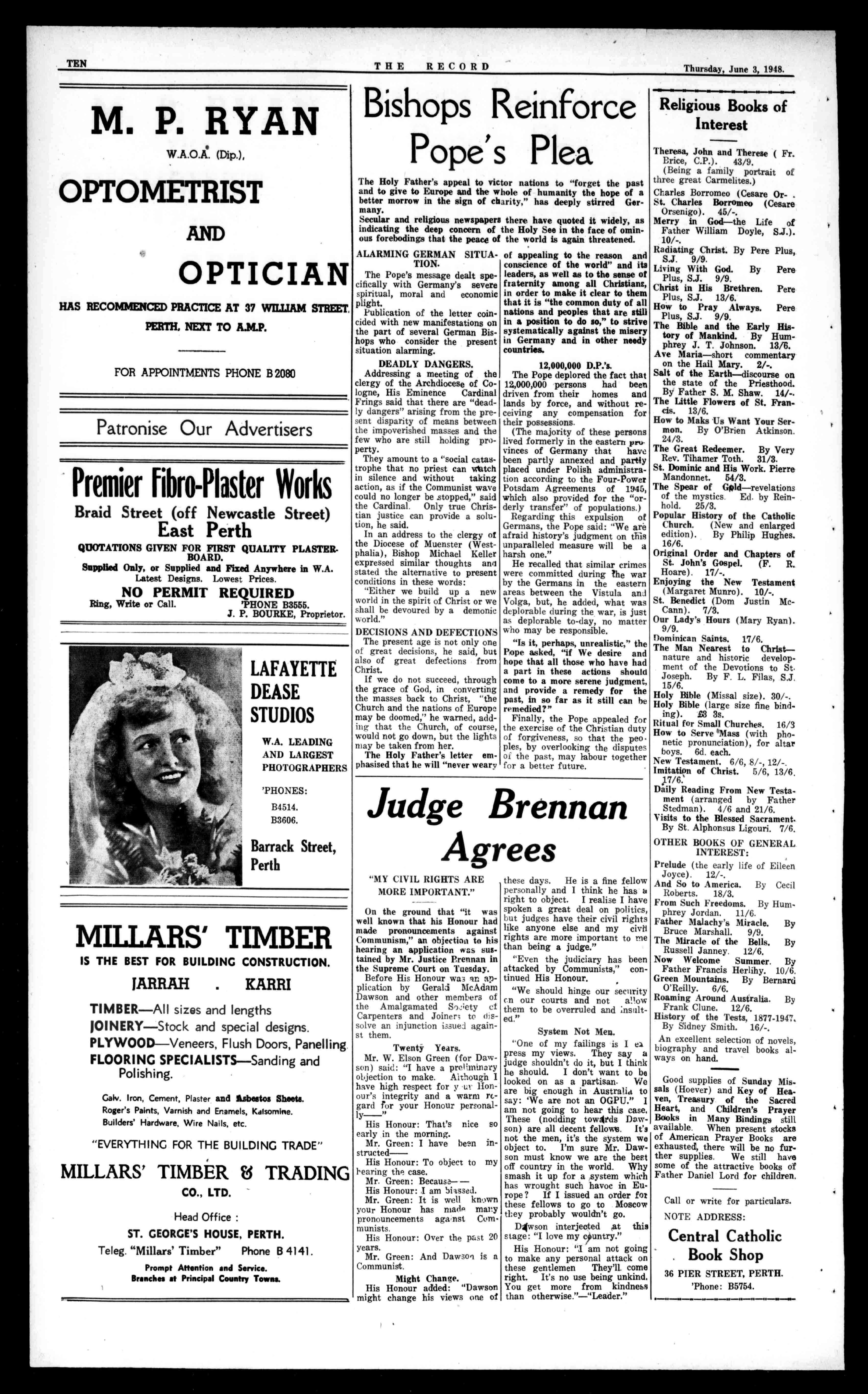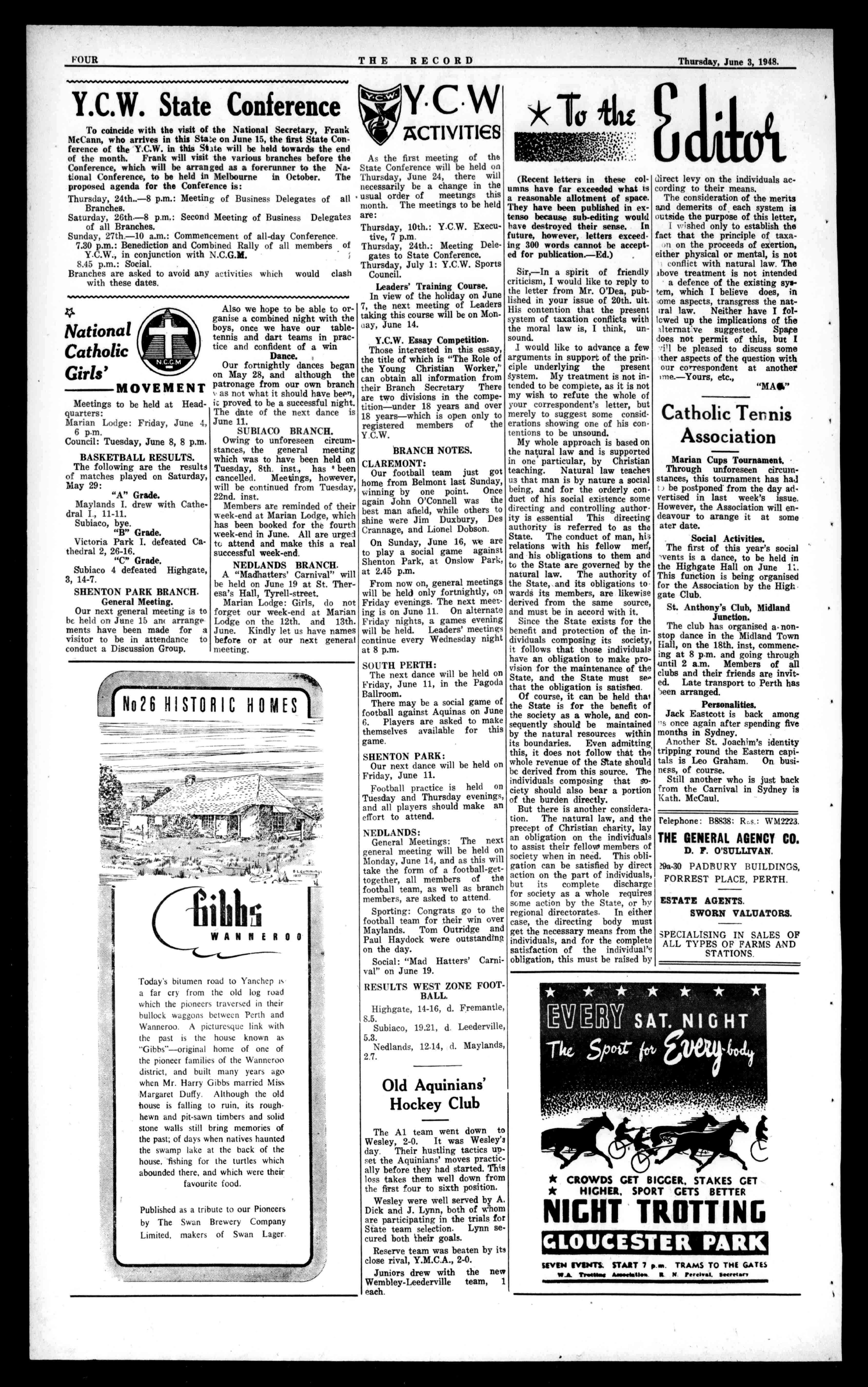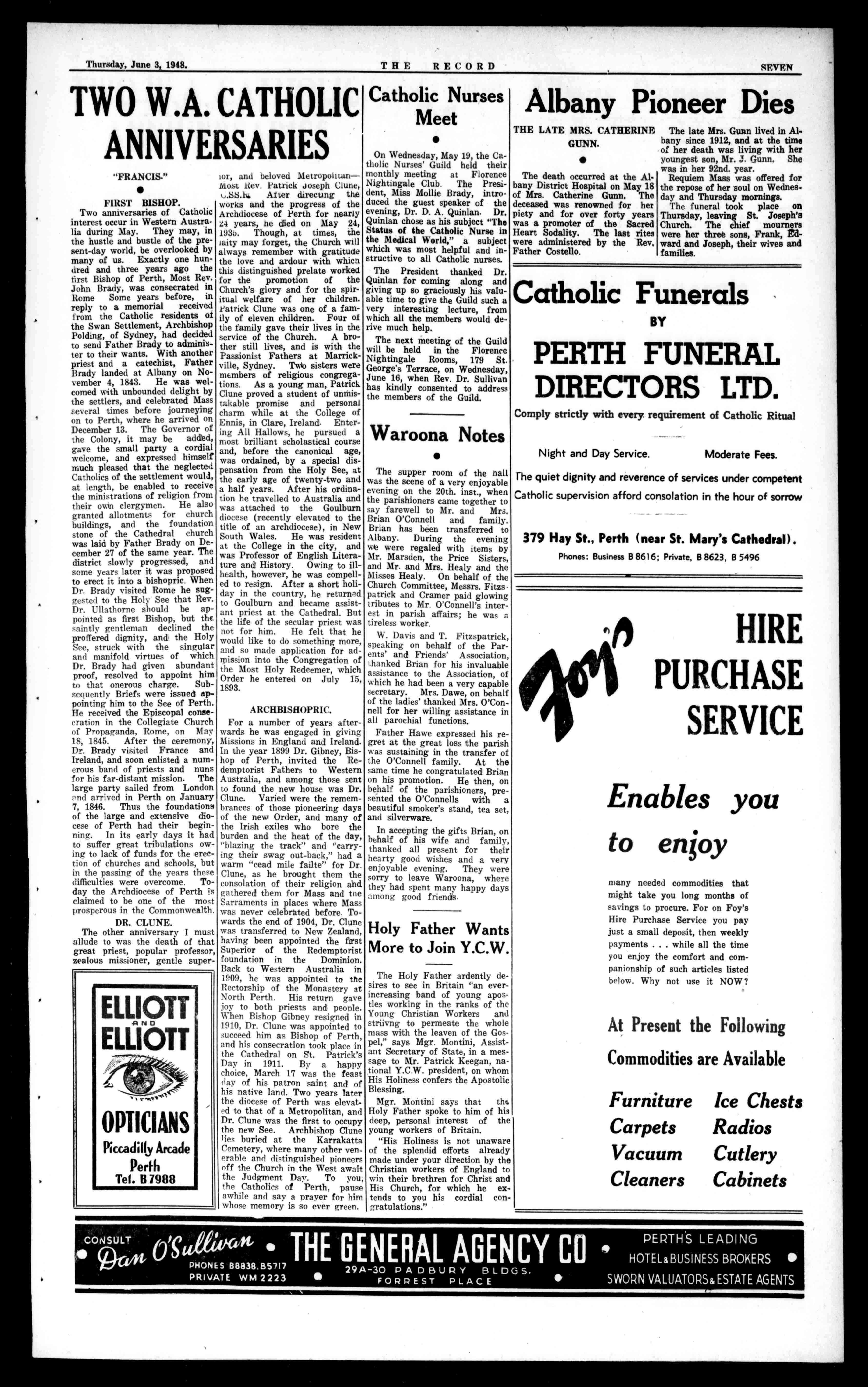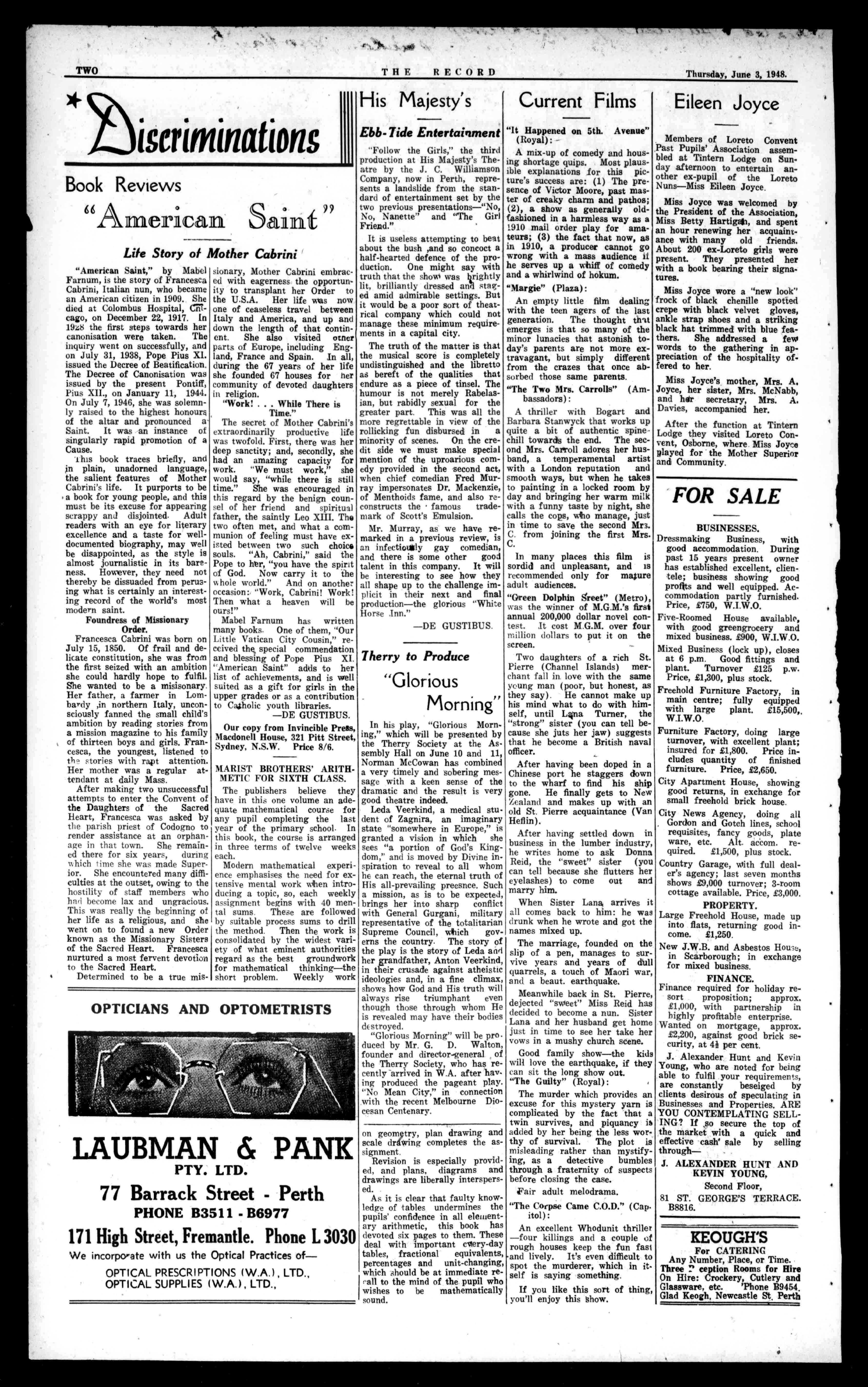 .01,5Jr OFFICIALORGANOFTHEARCHDIOCESEOFPERTH.ESCABLISJED1874 RegisteredattheG.P.O.,Perthfortran..missionbypostasanewspaper. 'PHONEB6950 450Ha,Street,Perth.BoxA35,G.P.(.Perth NO.2,368. PERTH,THURSOAY,JUNE3,1948. PRICETHREEPENCE. SEVENTY-FIFTHYEAR.