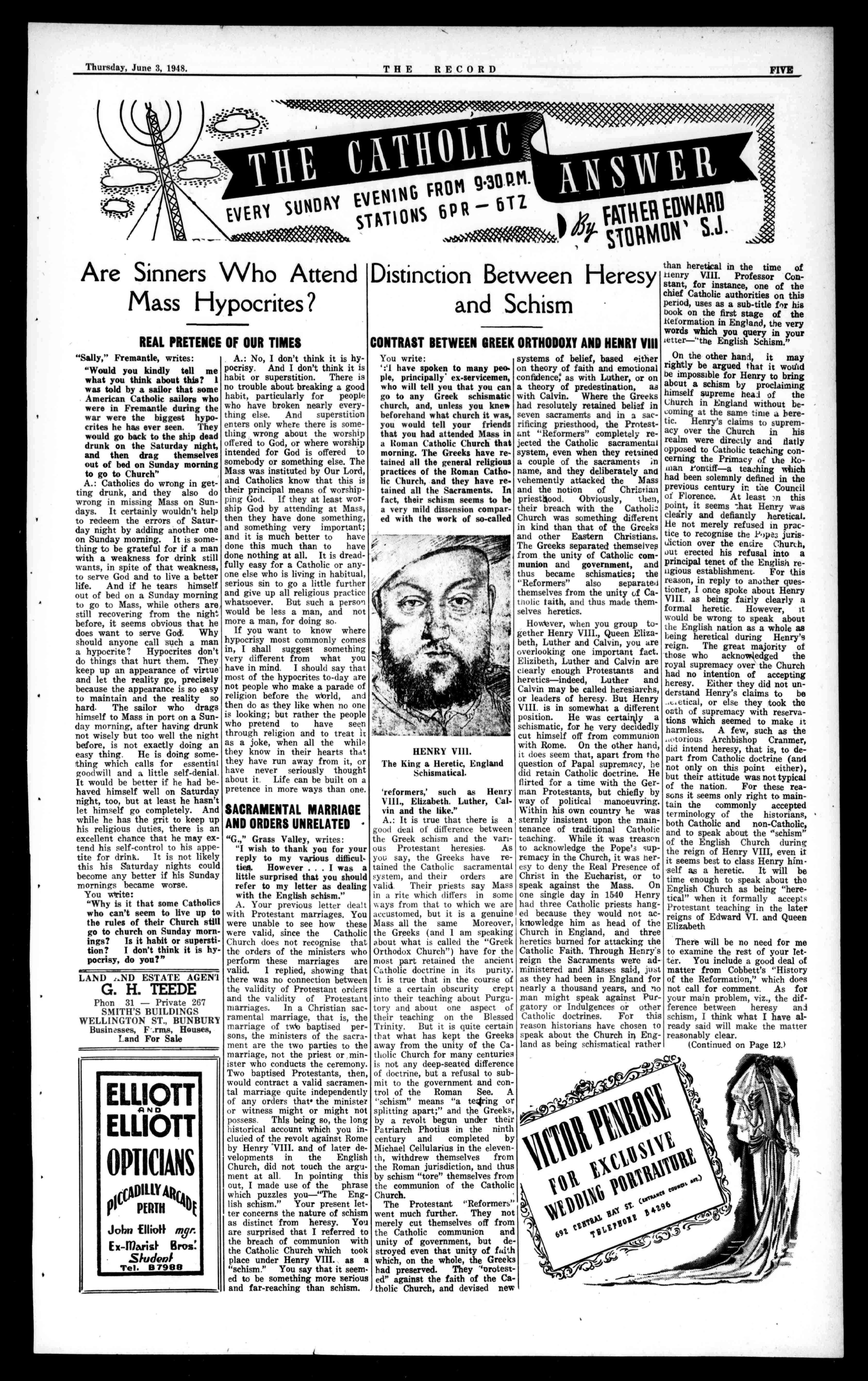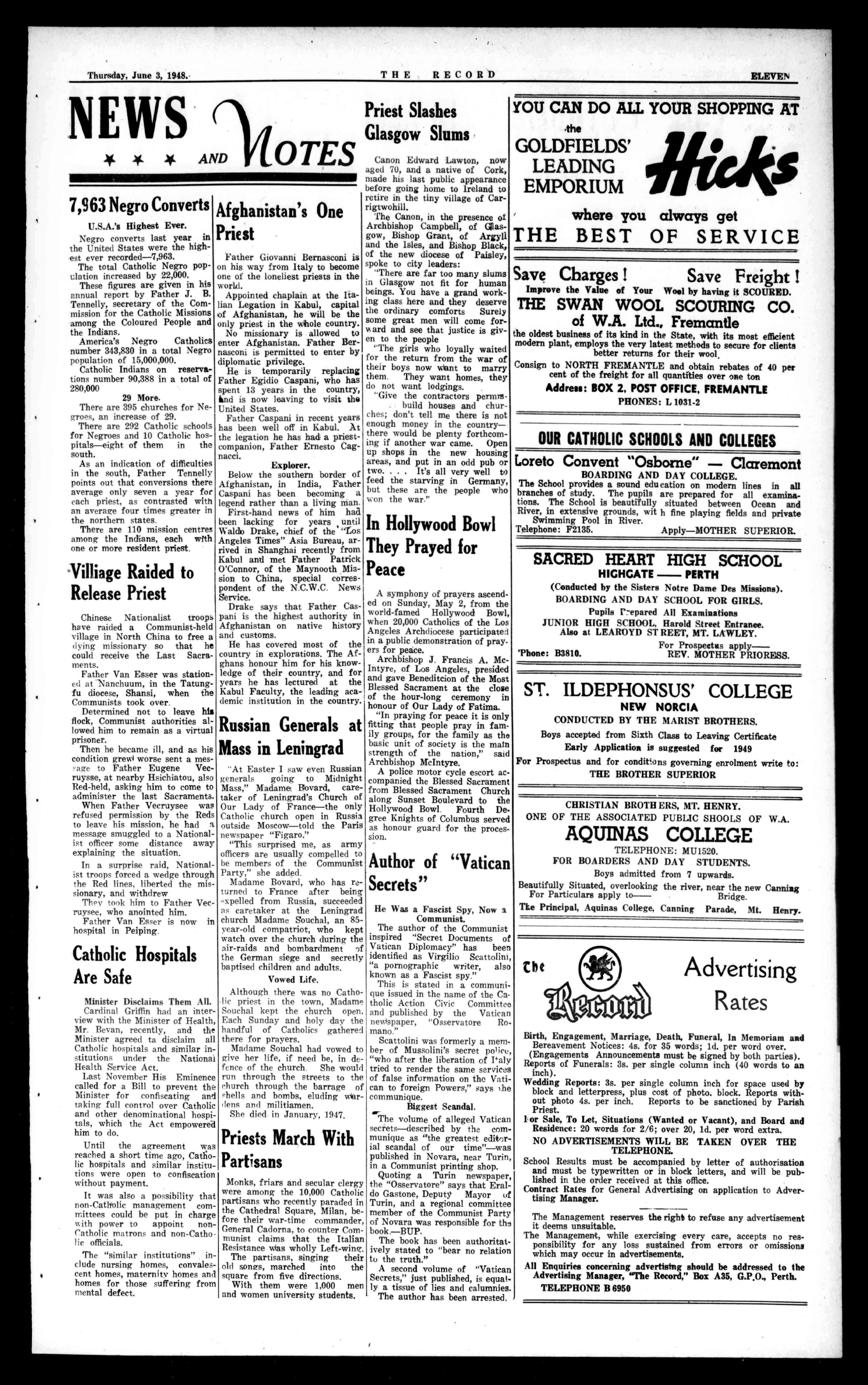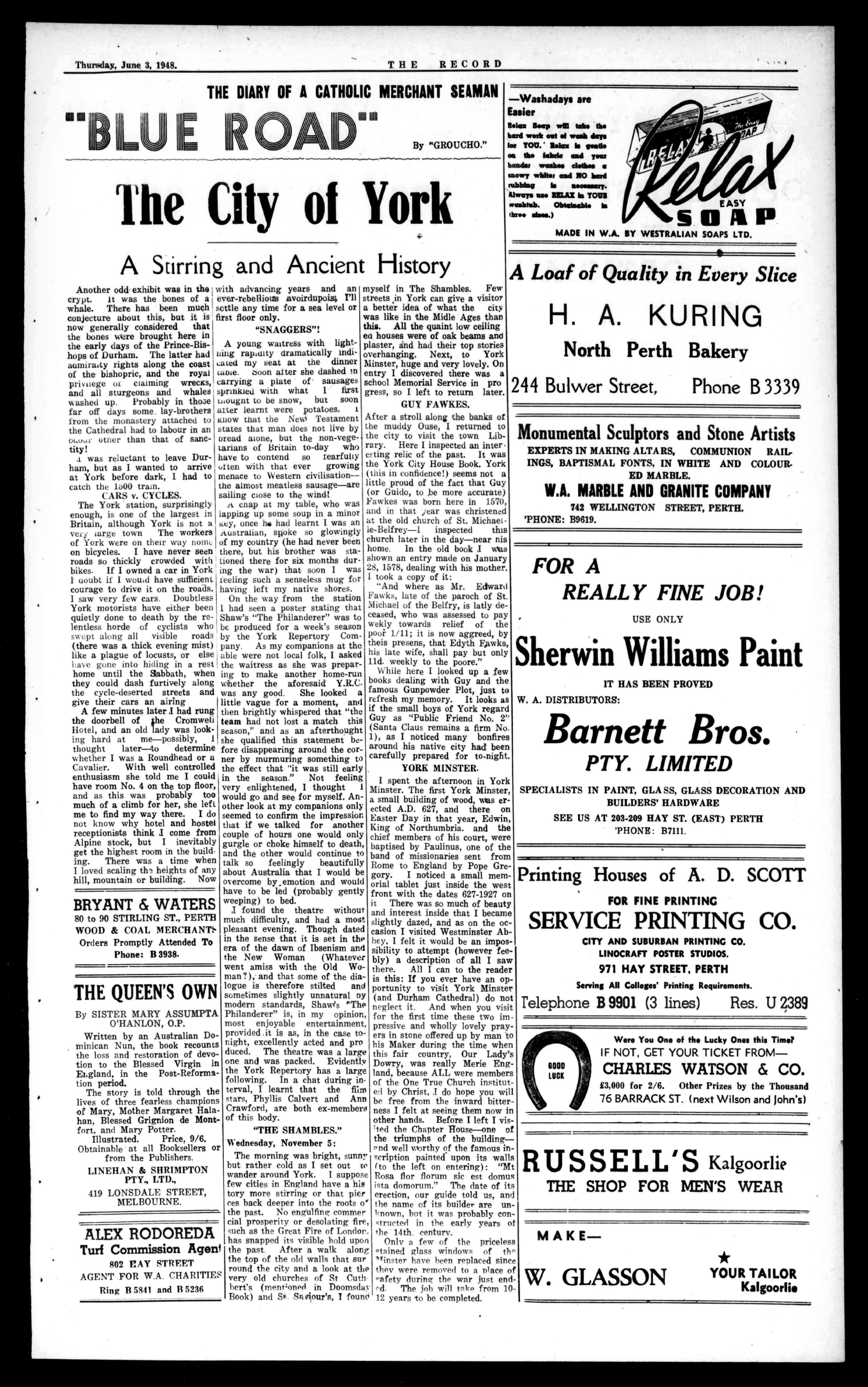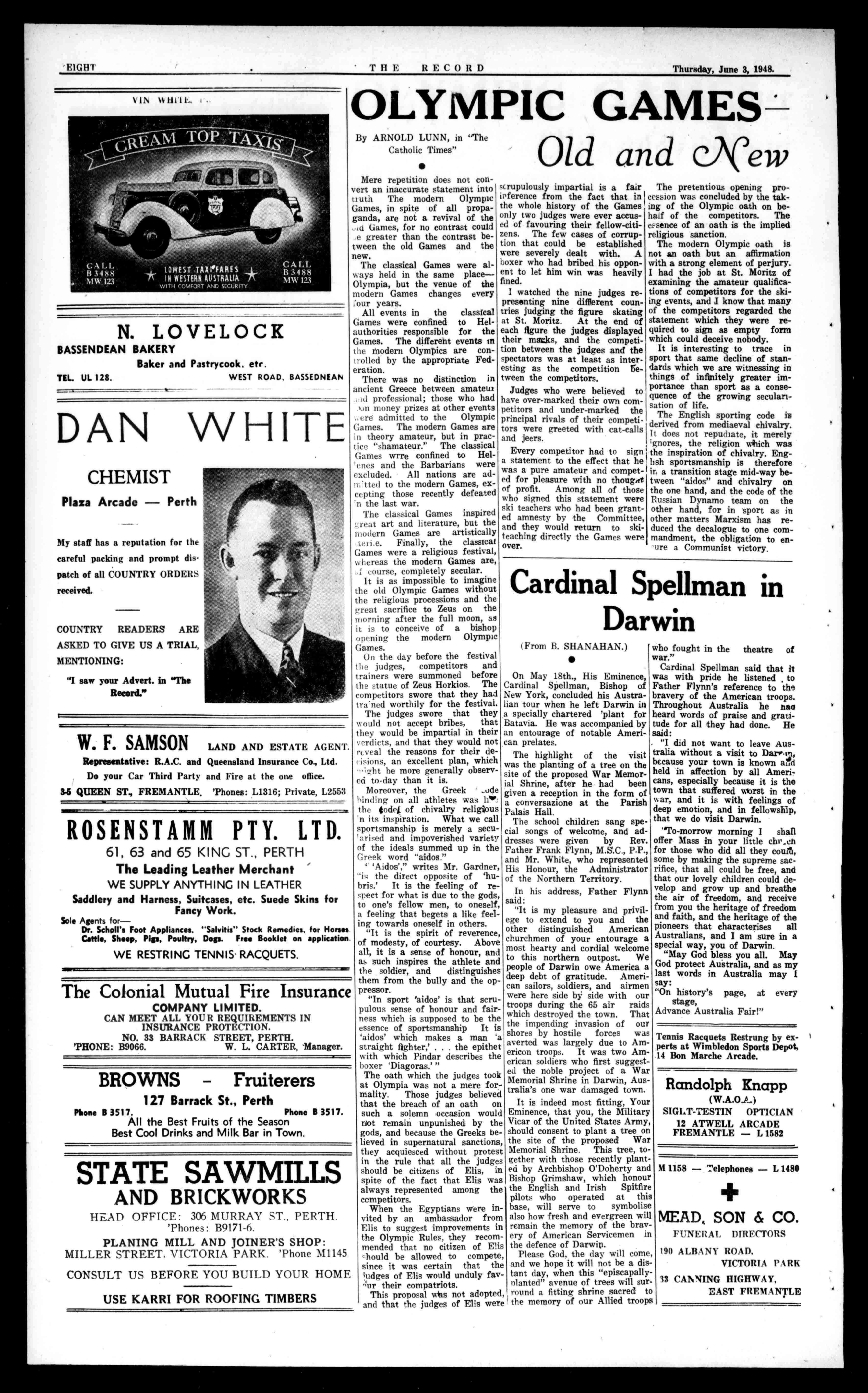 .01,5Jr OFFICIALORGANOFTHEARCHDIOCESEOFPERTH.ESCABLISJED1874 RegisteredattheG.P.O.,Perthfortran..missionbypostasanewspaper. 'PHONEB6950 450Ha,Street,Perth.BoxA35,G.P.(.Perth NO.2,368. PERTH,THURSOAY,JUNE3,1948. PRICETHREEPENCE. SEVENTY-FIFTHYEAR.