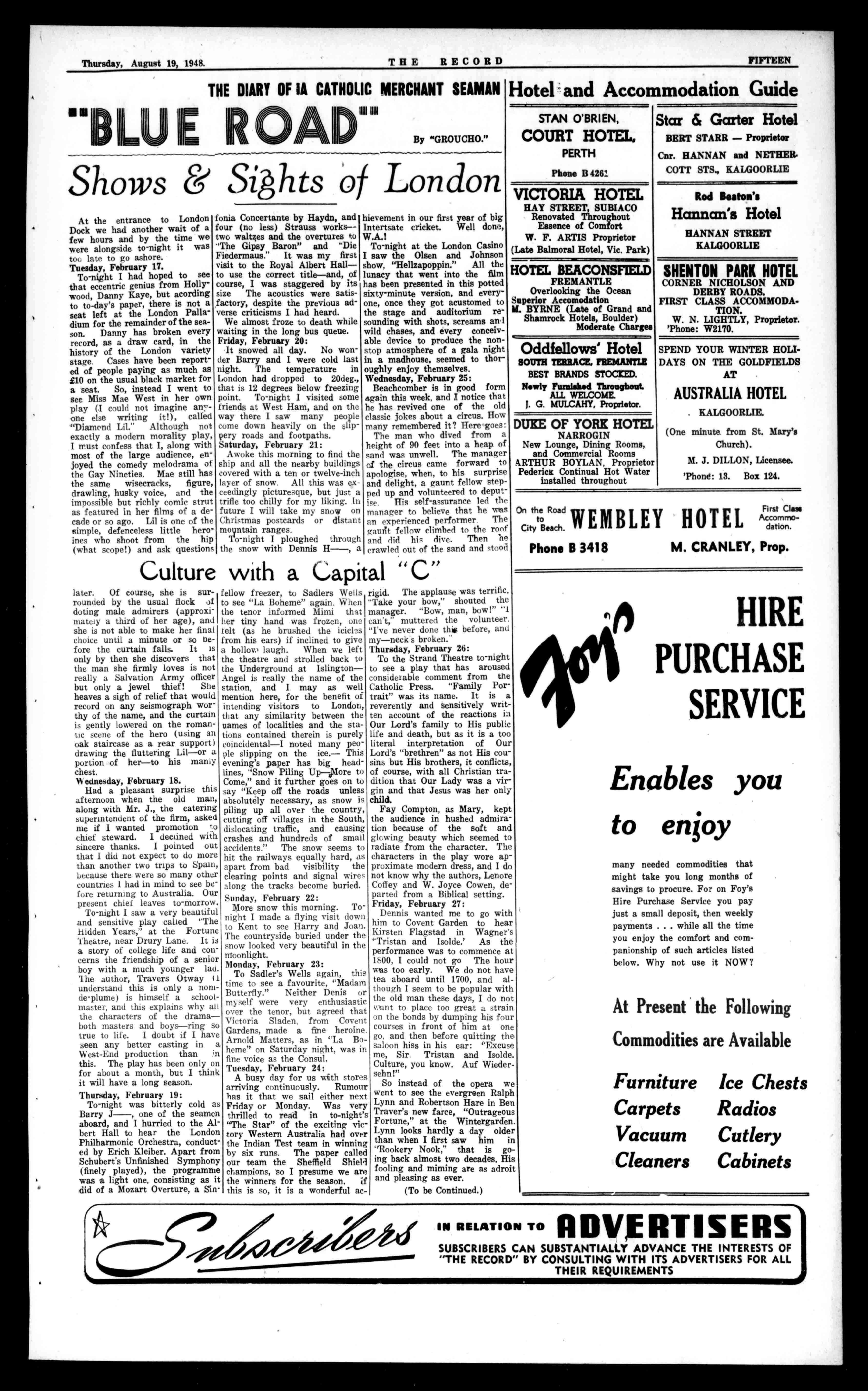 To-nightIhadhopedtosee thateccentricgeniusfromHollywood,DannyKaye,butacording toto-day'spaper,thereisnota seatleftattheLondonPalladiumfortheremainderoftheseason.Dannyhasbrokenevery record,asadrawcard,inthe historyoftheLondonvariety stage.Caseshavebeenreportedofpeoplepayingasmuchas £10ontheusualblackmarketfor aseat.So,insteadIwentto seeMissMaeWestinherown play(Icouldnotimagineansoneelsewritingit!),called "DiamondLil."Althoughnot exactlyamodernmoralityplay, ImustconfessthatI,alongwith mostofthelargeaudience,enjoyedthecomedymelodramaof theGayNineties.Maestillhas thesamewisecracks,figure, drawling,huskyvoice,andthe impossiblebutrichlycomicstrut asfeaturedinherfilmsofadecadeorsoago.Lilisoneofthe simple,defencelesslittleheroineswhoshootfromthehip (whatscope!)andaskquestions