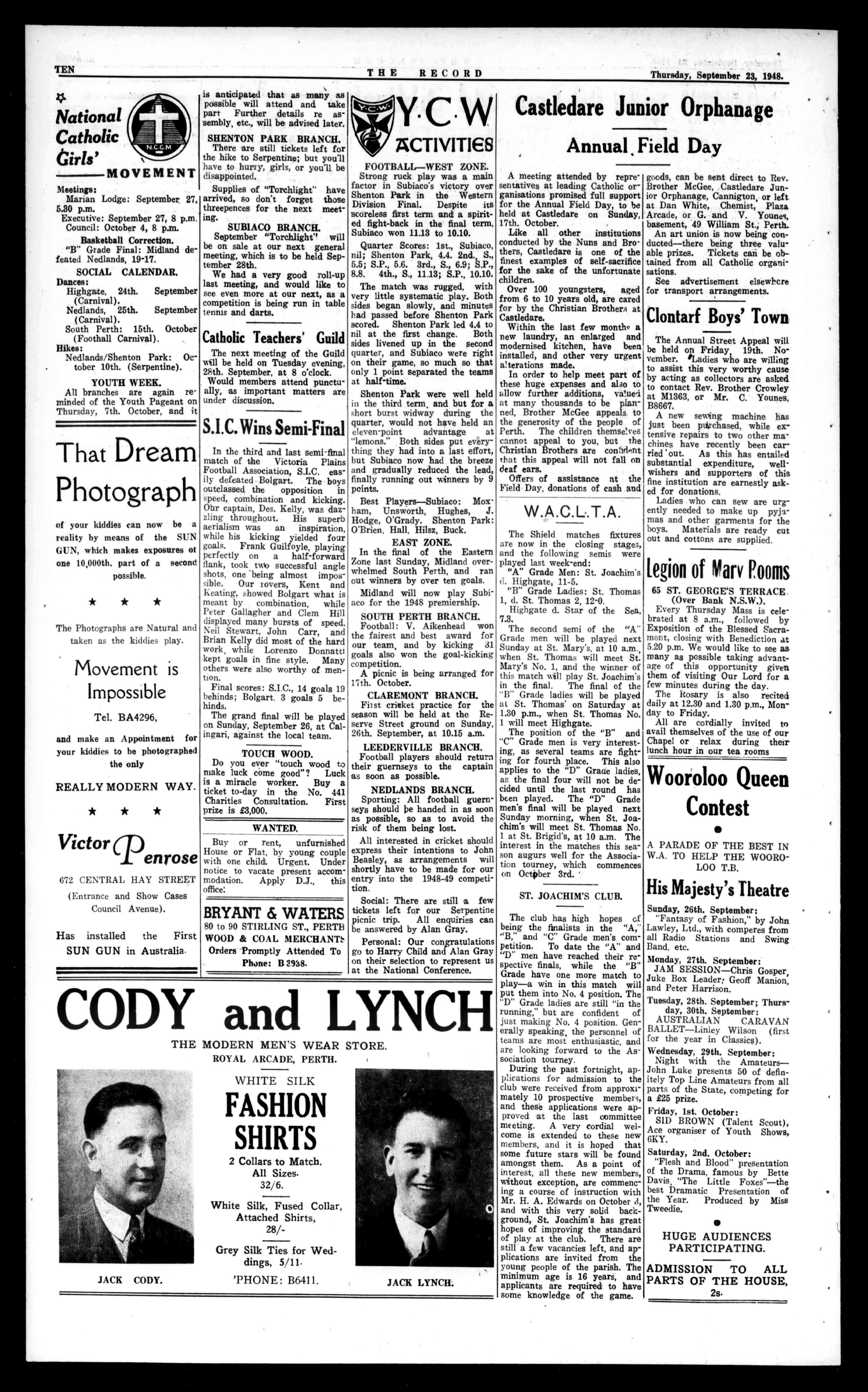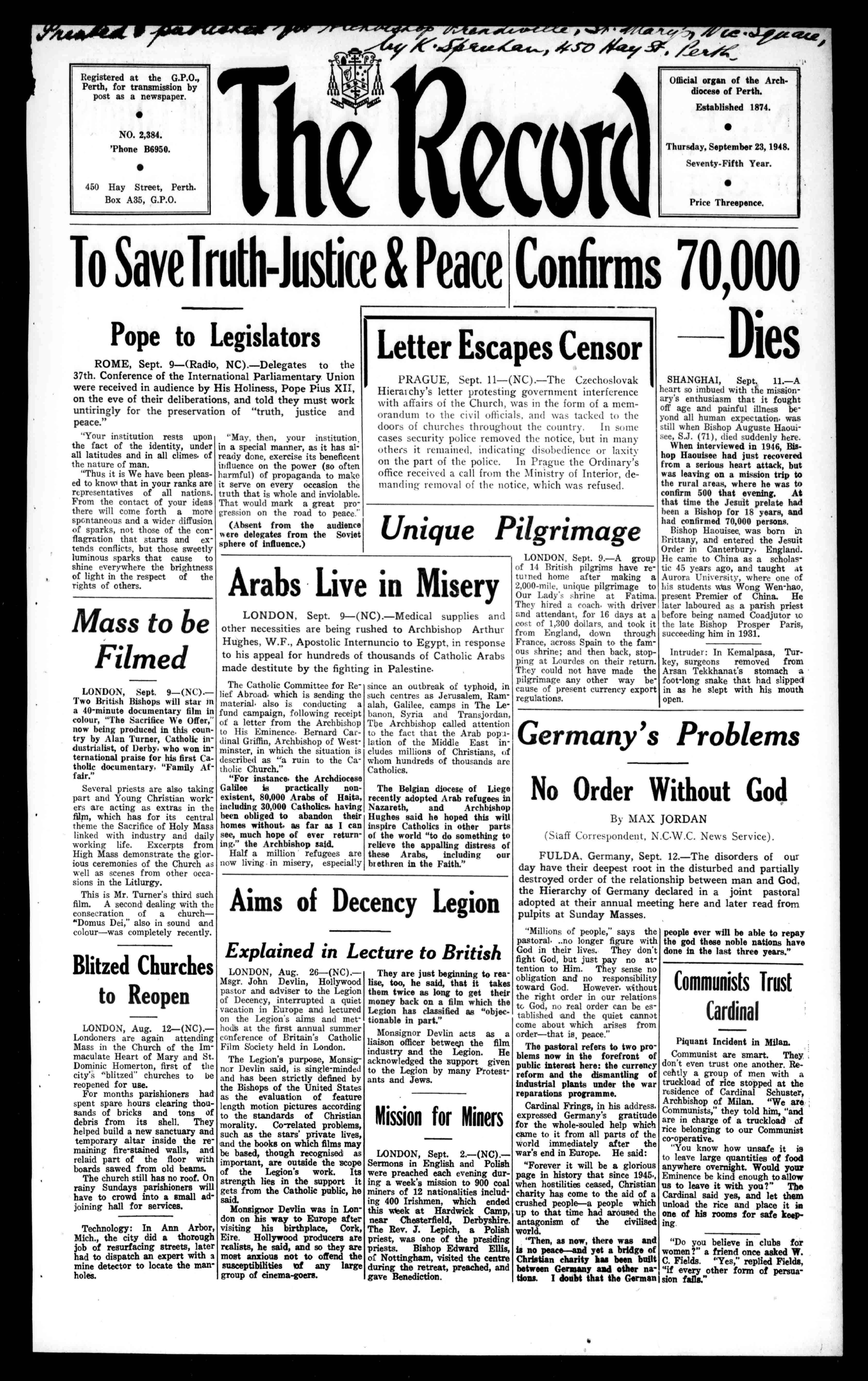 .7-IFOW'fir dece RegisteredattheG.P.O., Perth,fortransmissionby postasanewspaper. NO.2,384. 'PhoneB6950. 450HayStreet,Perth. BoxA35,G.P.O. Recol Act ) ,C.der -53e;Z--t--/4s: OfficialorganoftheArchdioceseofPerth. Established1874. Thursday,September23,1948. Seventy-FifthYear. PriceThreepence.
