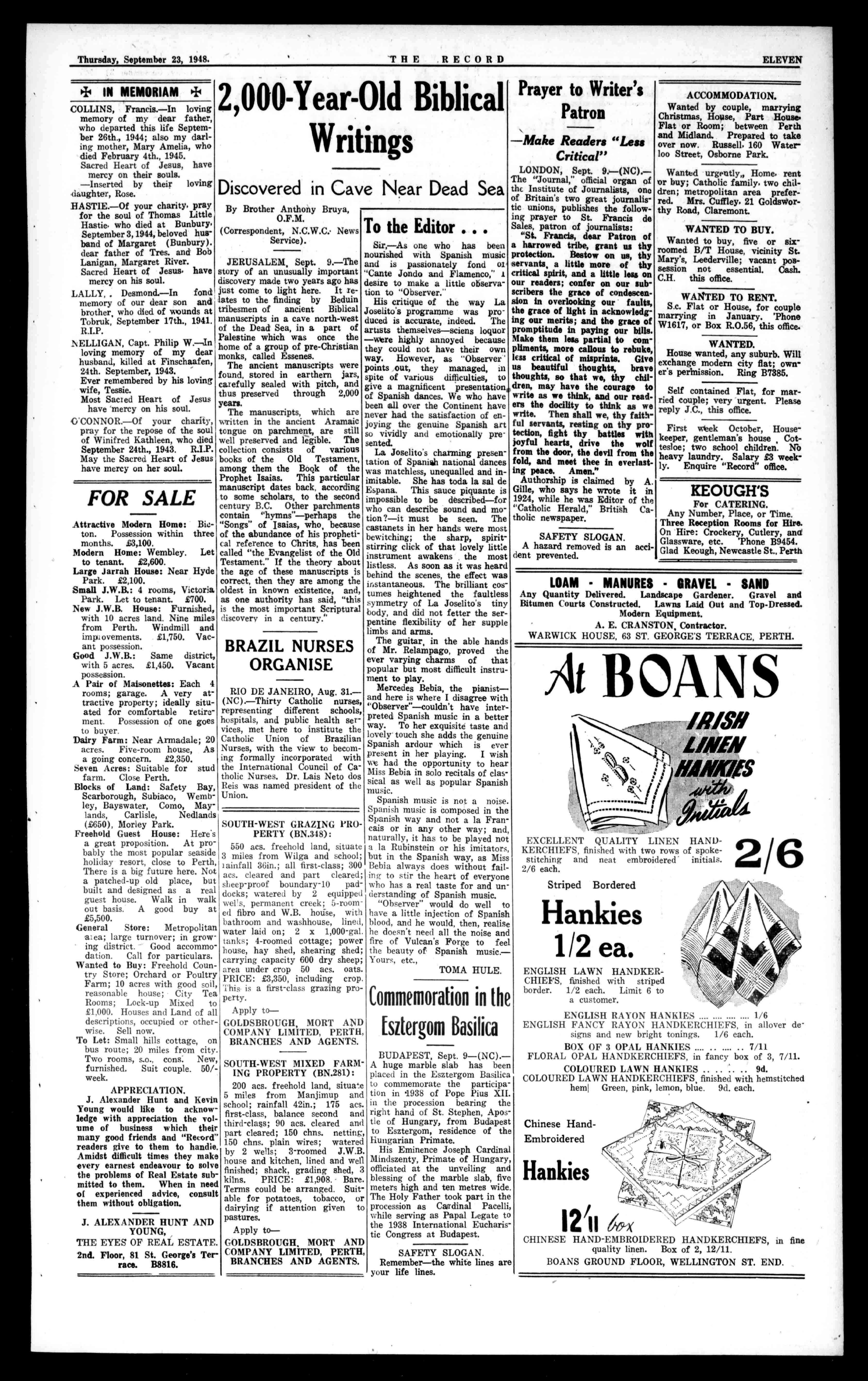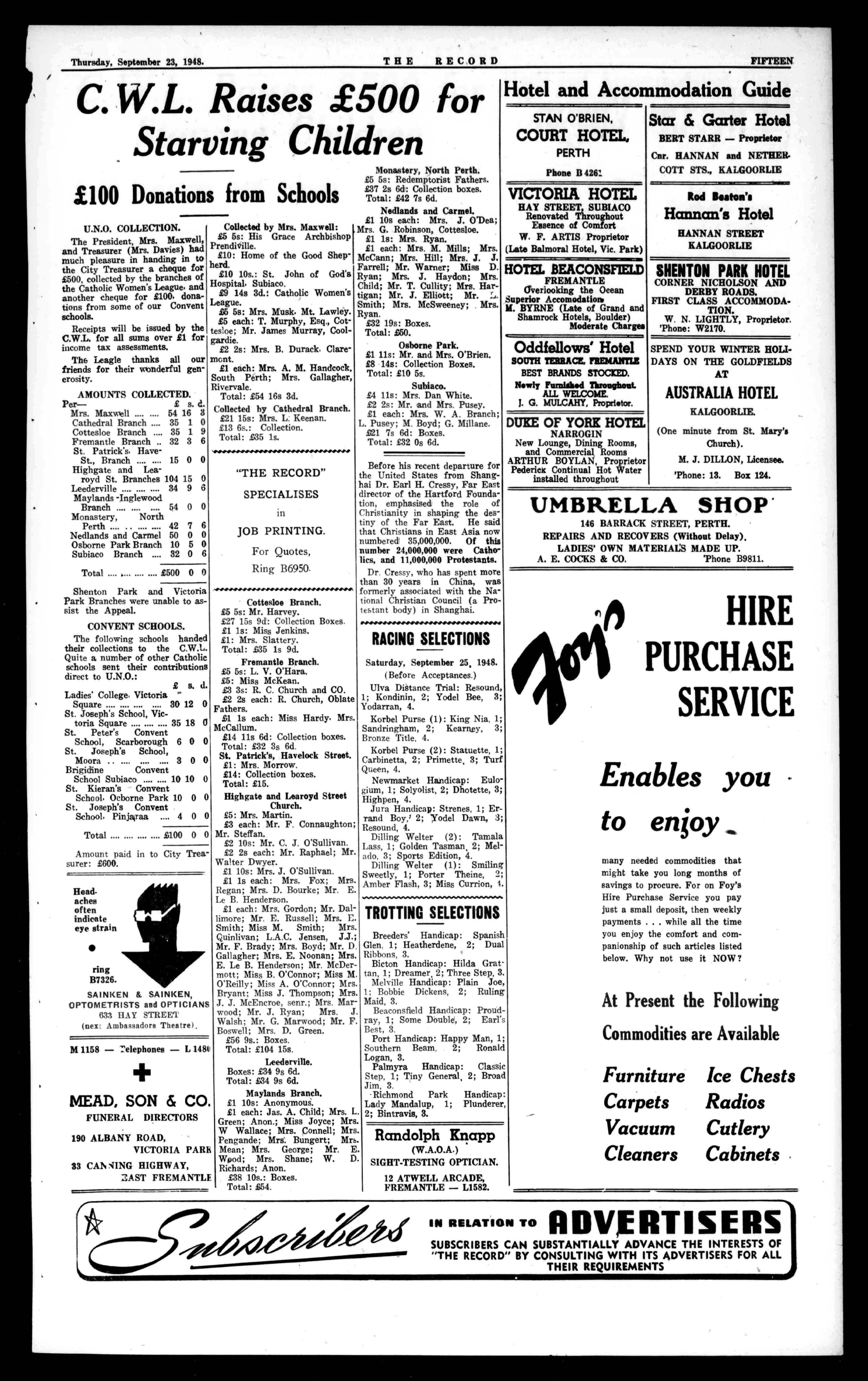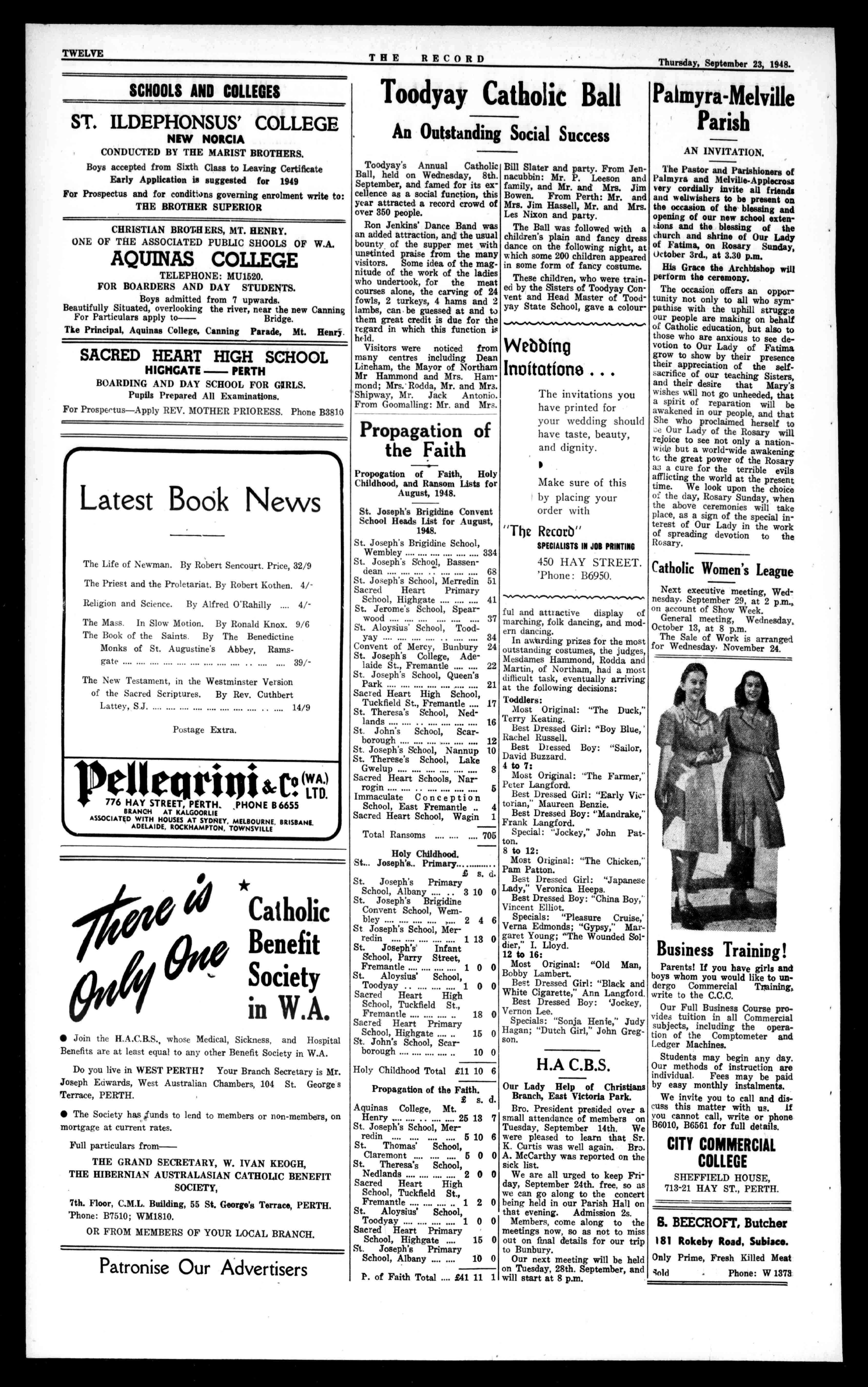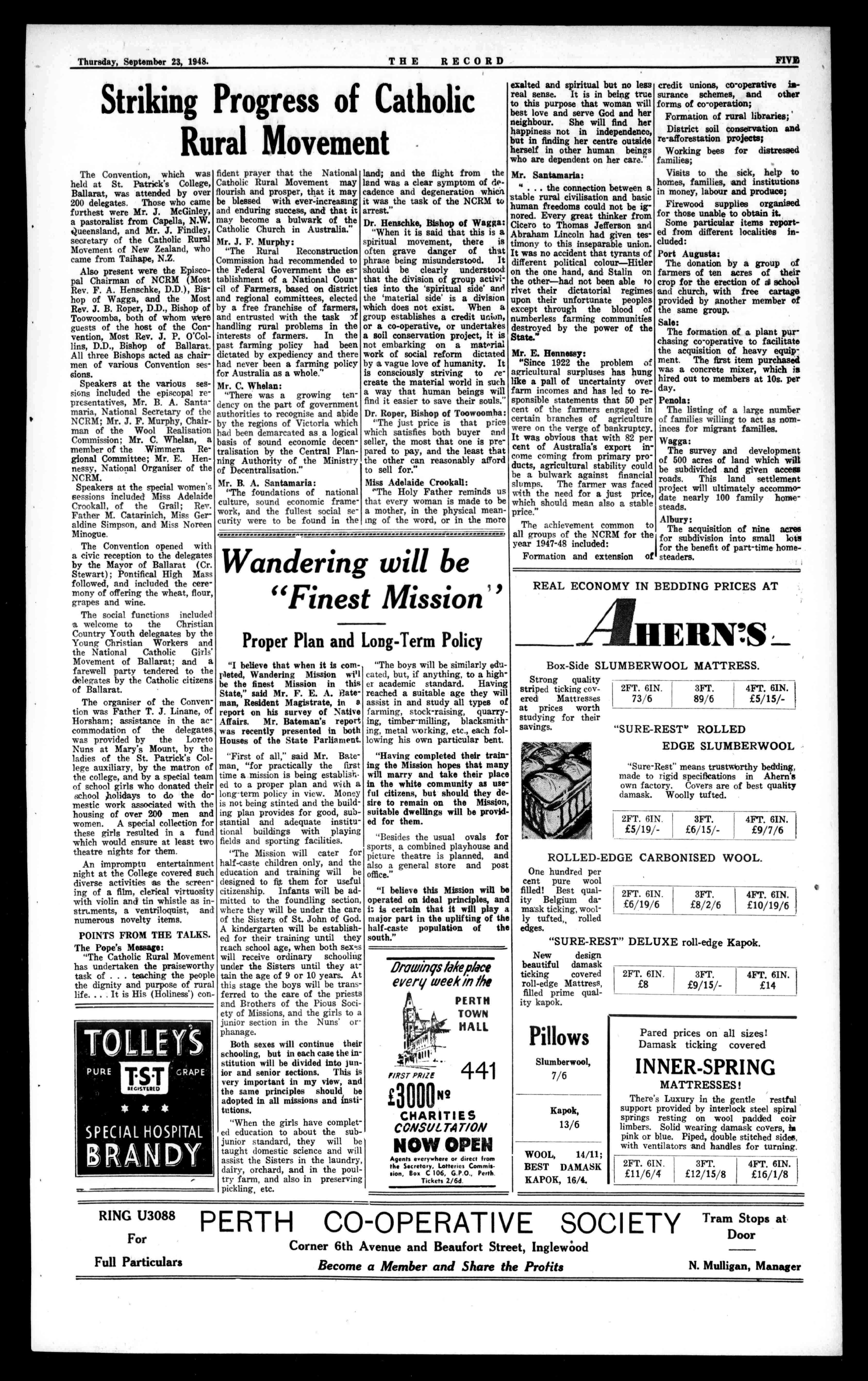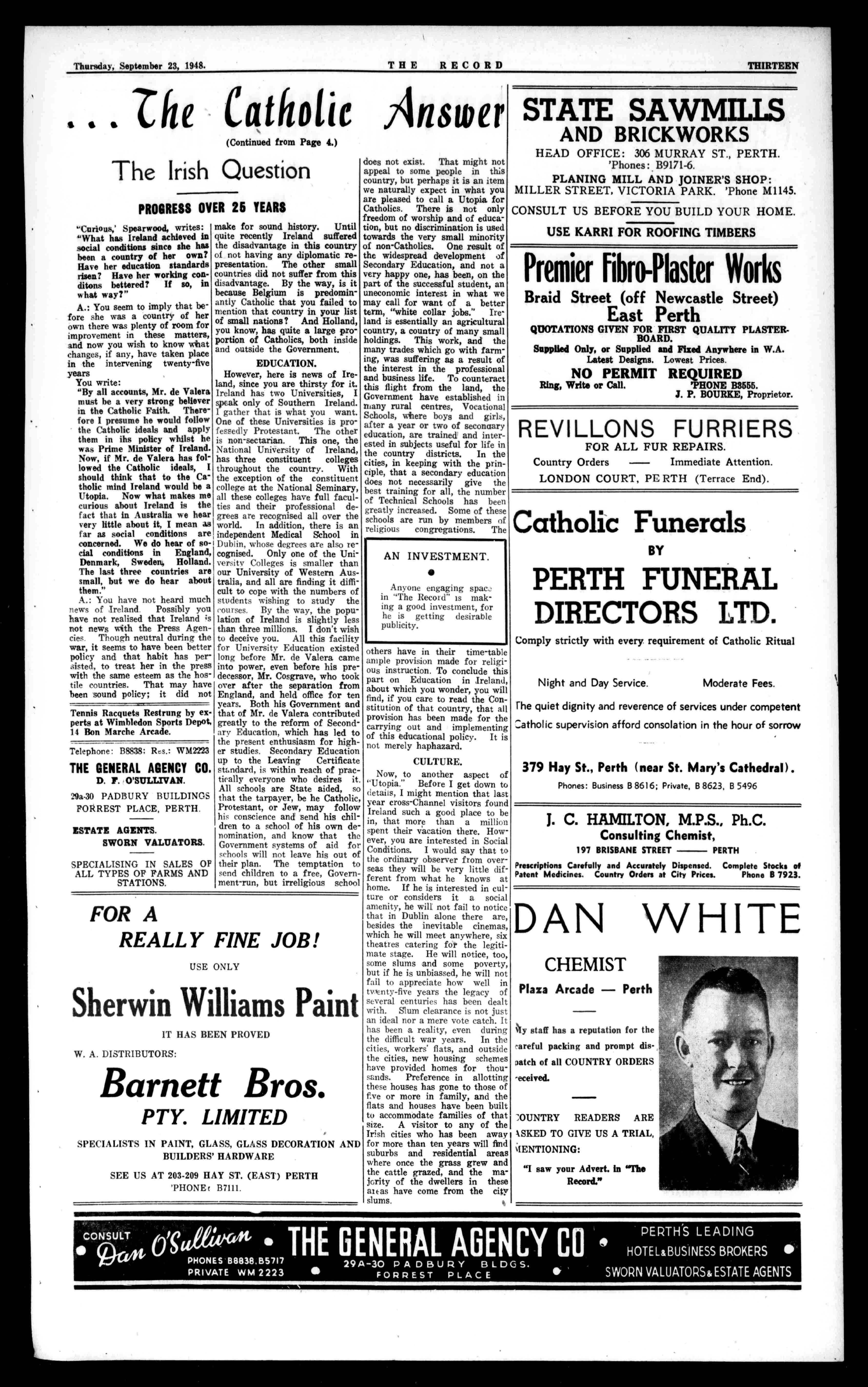 CALL B3488 MW123 LOWESTTAXIFARES INWESTERNAUSTRALIA7N WITHCOMFOP.TANDSECURITY CALL B3488 \1\\'123 MonumentalSculptorsandStoneArtists EXPERTSINMAKINGALTARS,COMMUNIONRAIL INGS,BAPTISMALFONTS,INWHITEANDCOLOUREDMARBLE. W.A.MARBLEANDGRANITECOMPANY 742WELLINGTONSTREET,PERTH. 'PHONE:B9619. BROWNS-Fruiterers 127BarrackSt.,Perth PhoneB3517. PhoneB3517. AlltheBestFruitsoftheSeason BestCoo!DrinksandMilkBarinTown. PrintingHousesofA.D.SCOTT FORFINEPRINTING SERVICEPRINTINGCO. CITYANDSUBURBANPRINYINCCO. LINOCRAFTPOSTERSTUDIOS. 971HAYSTREET,PERTH ServingAllCollegesPrintingRequirements. TelephoneB9901(3lines) Res.U2389 FORVALUEANDQUALITYE MERCERSANDDRAPERS 219WILLIAMST.,PERTH 'PhoneB5393 Also14SouthTerrace,FREMANTLE PrintedandPublishedbyKeithFrancisSpruhan,at"TheRecord"Office,450HayStreet,Perth.