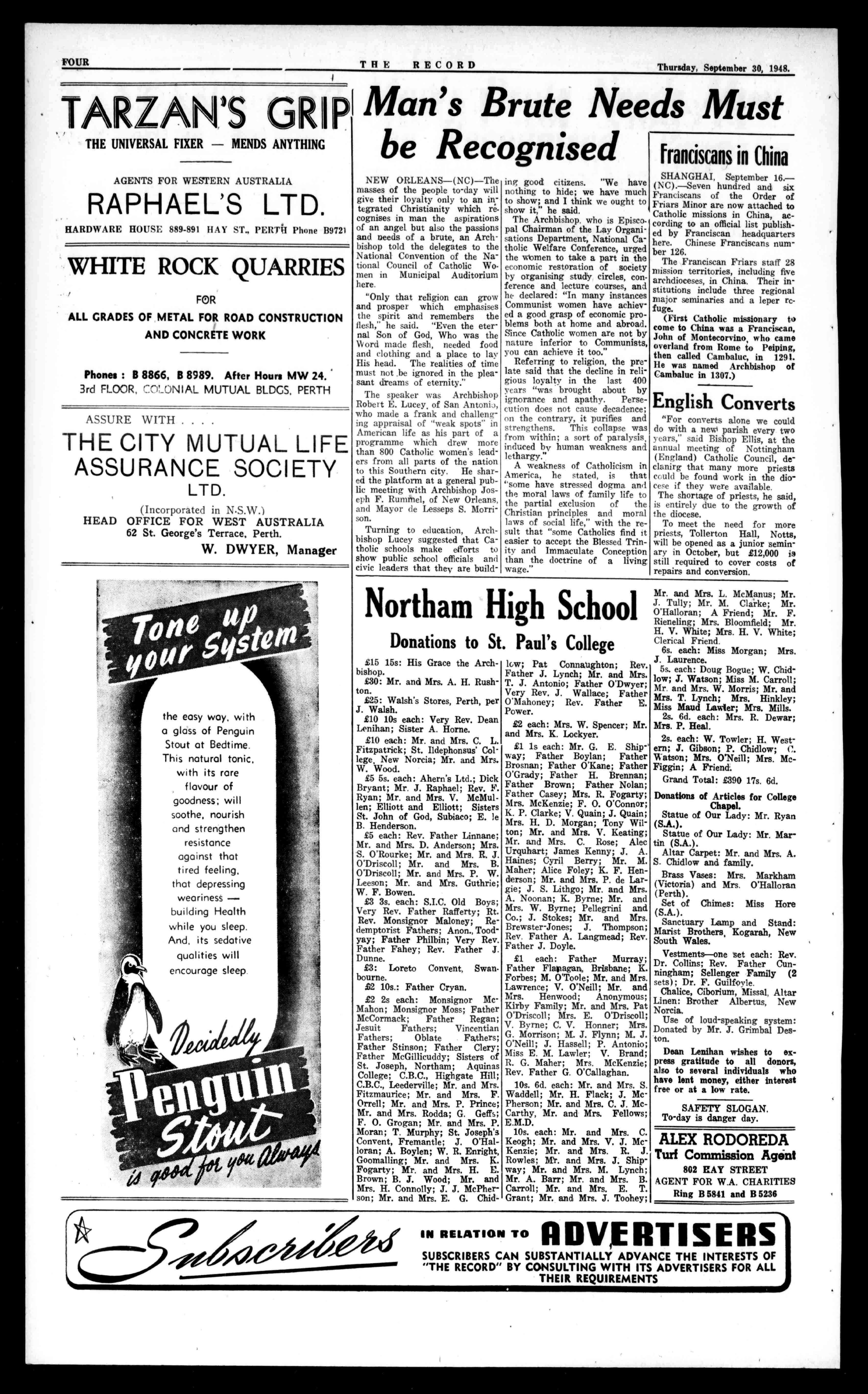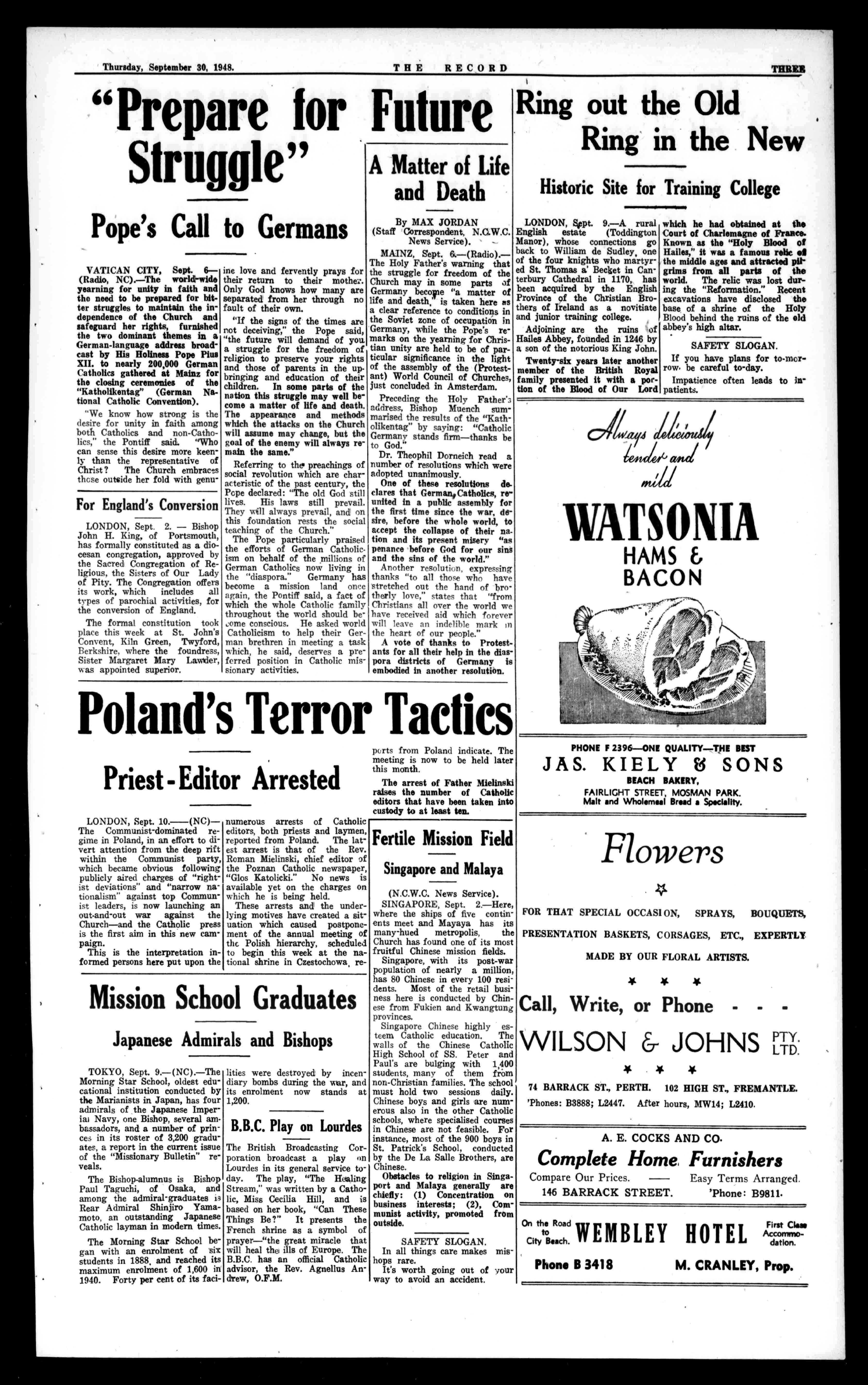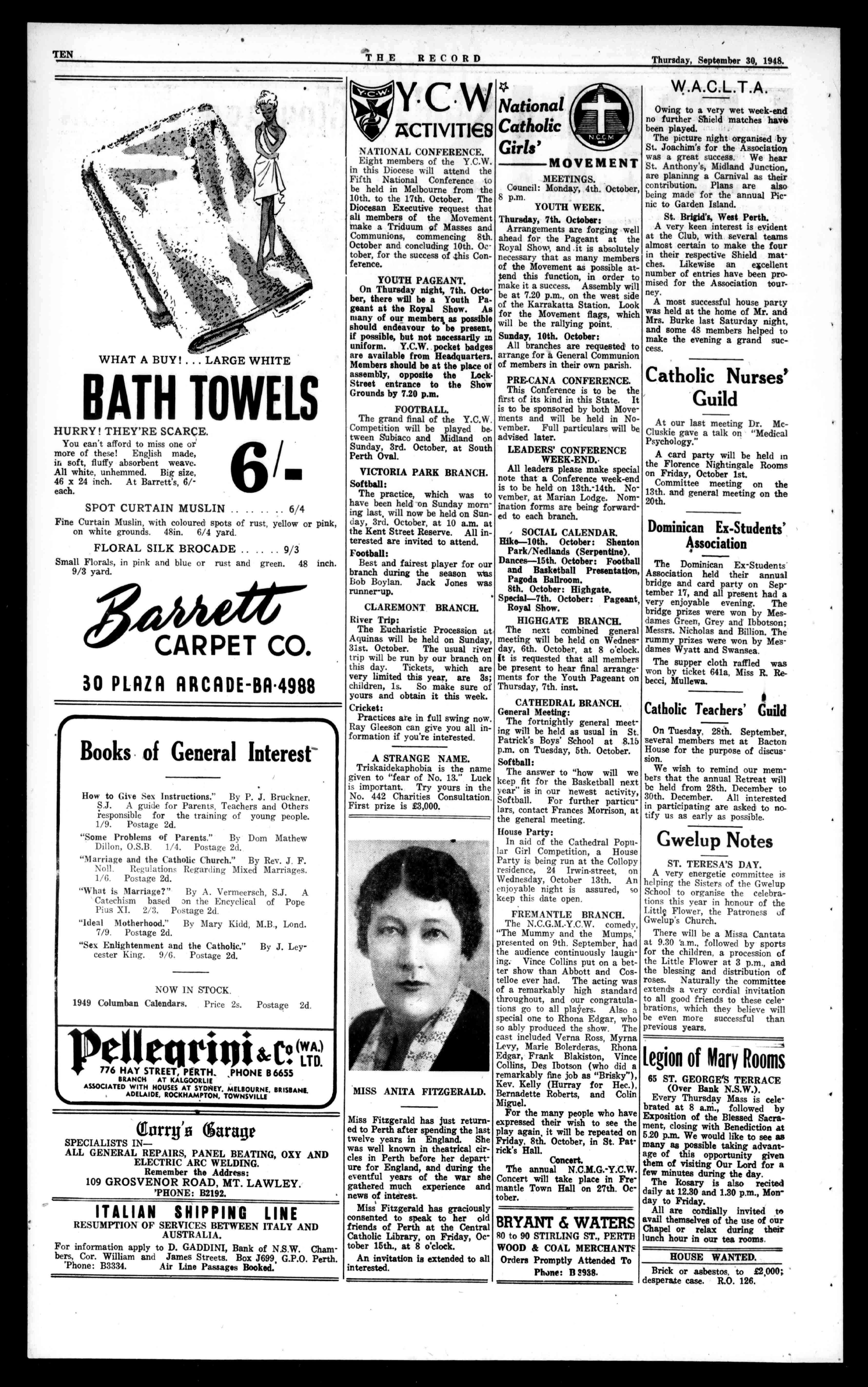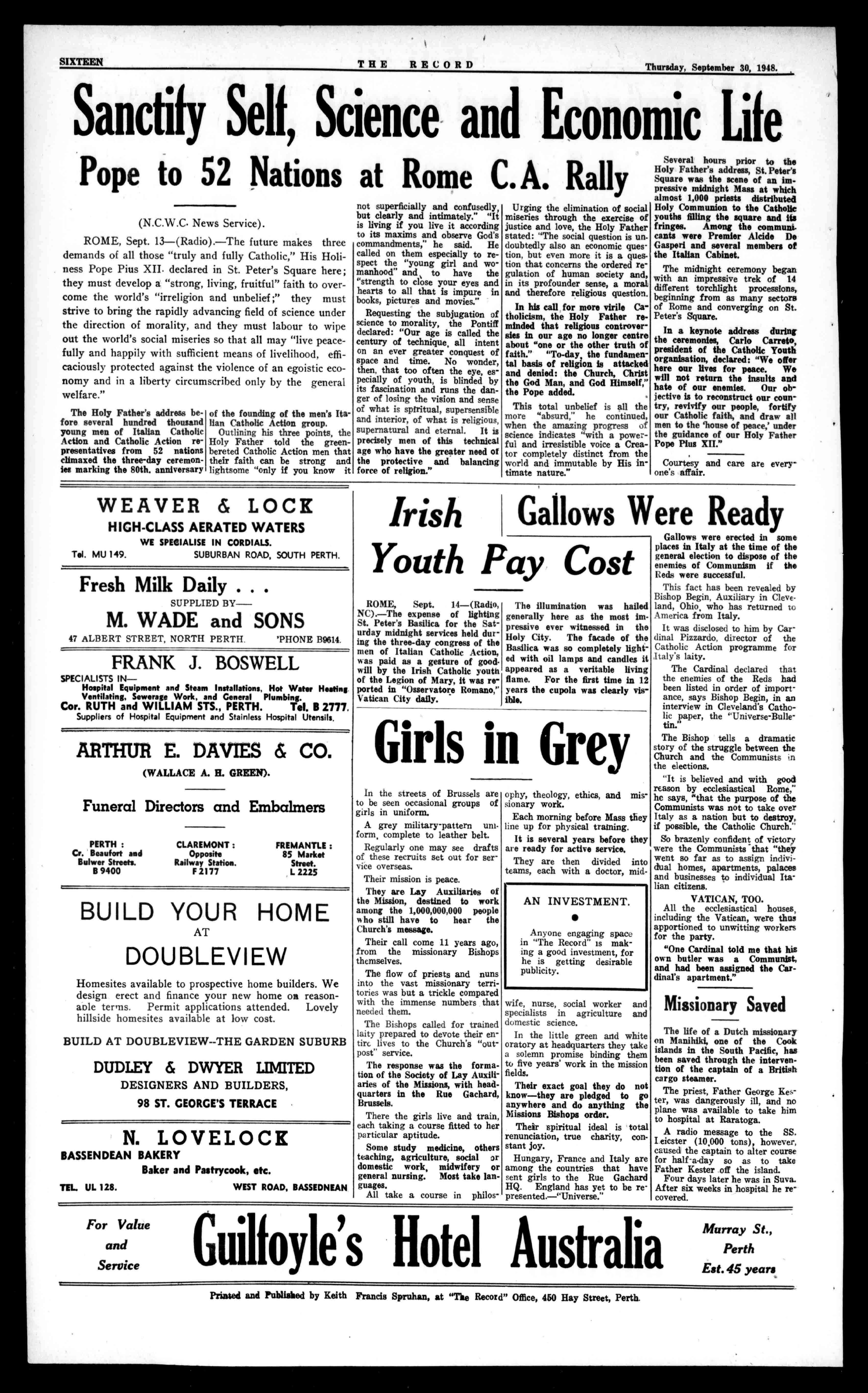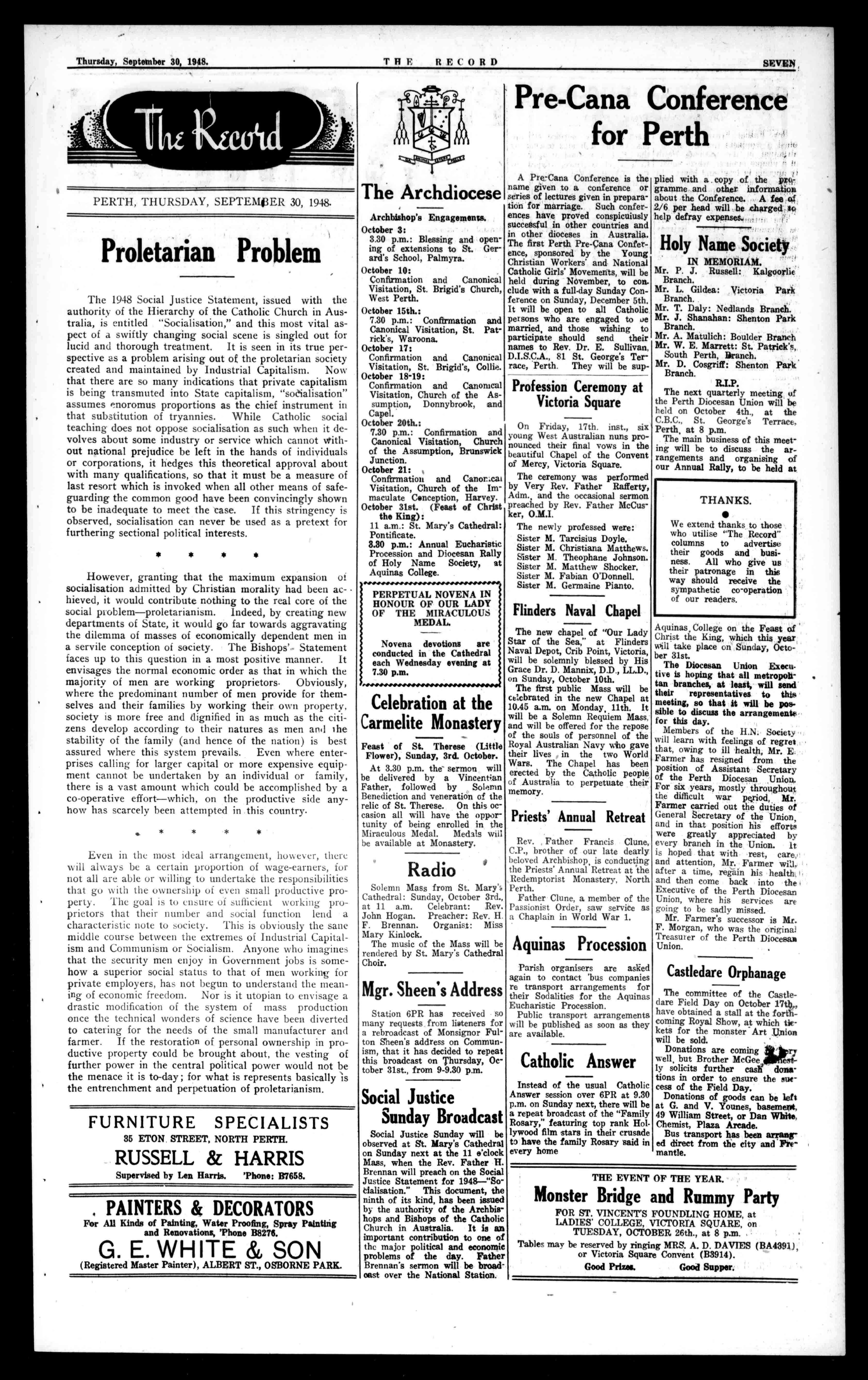RegisteredattheG.P.O., Perth,fortransmissionby postasanewspaper. NO.2,385. 'Phone116950. 450HayStreet,Perth. BoxA35,G.P.O. RCCOT OfficialorganoftheArchdioceseofPerth. Established1874. Thursday,September30.1948. Seventy-FifthYear. PriceThreepence.
