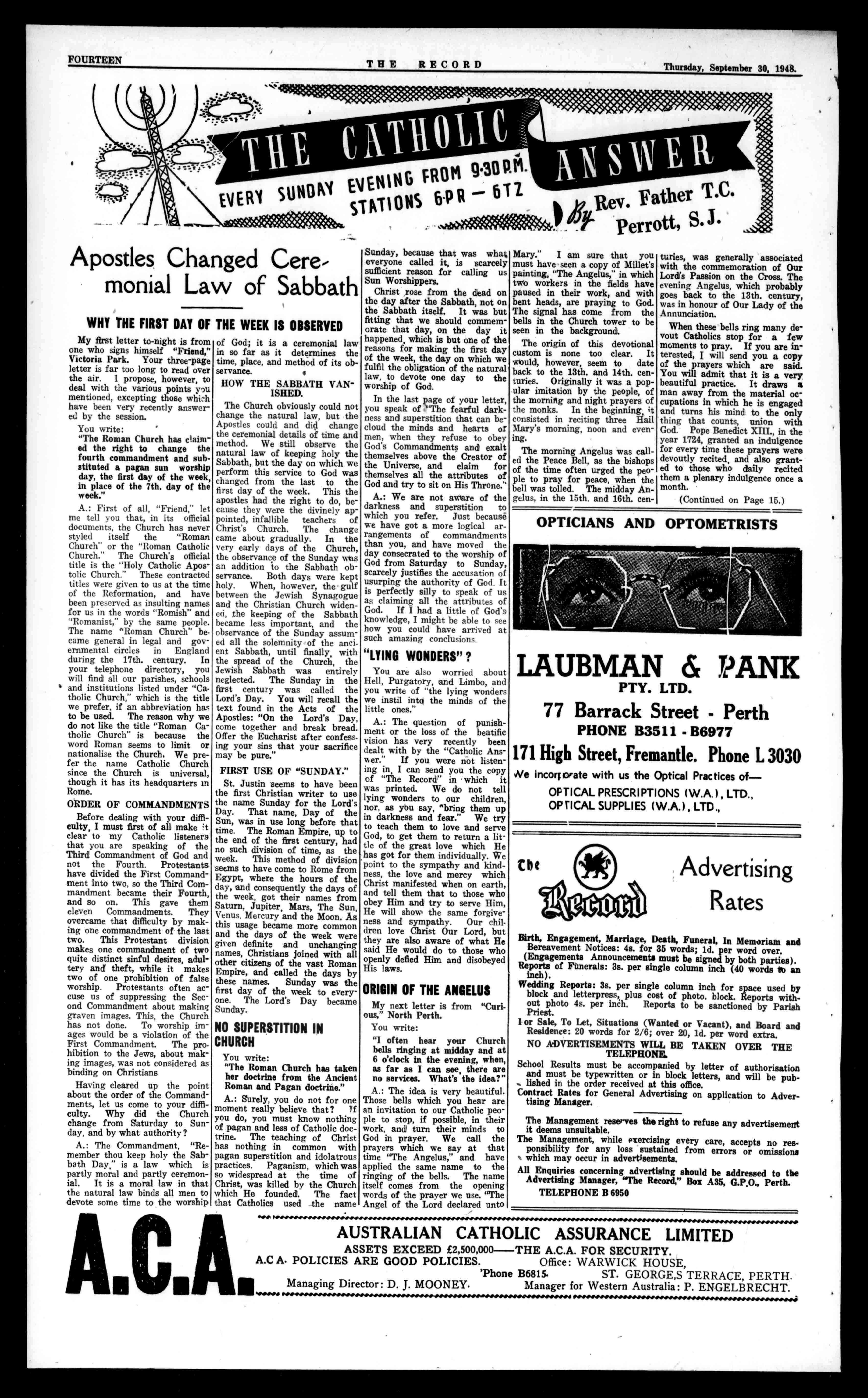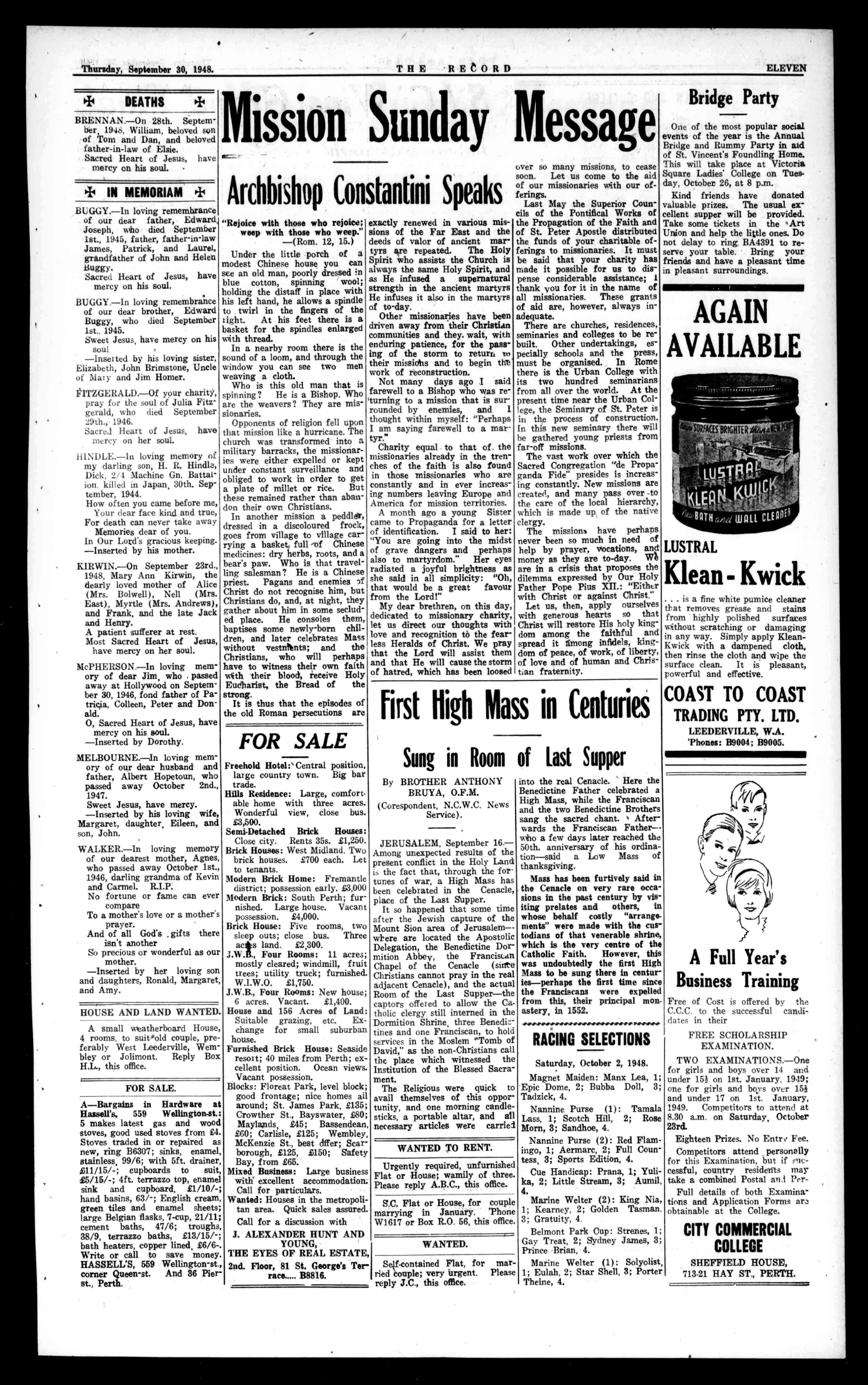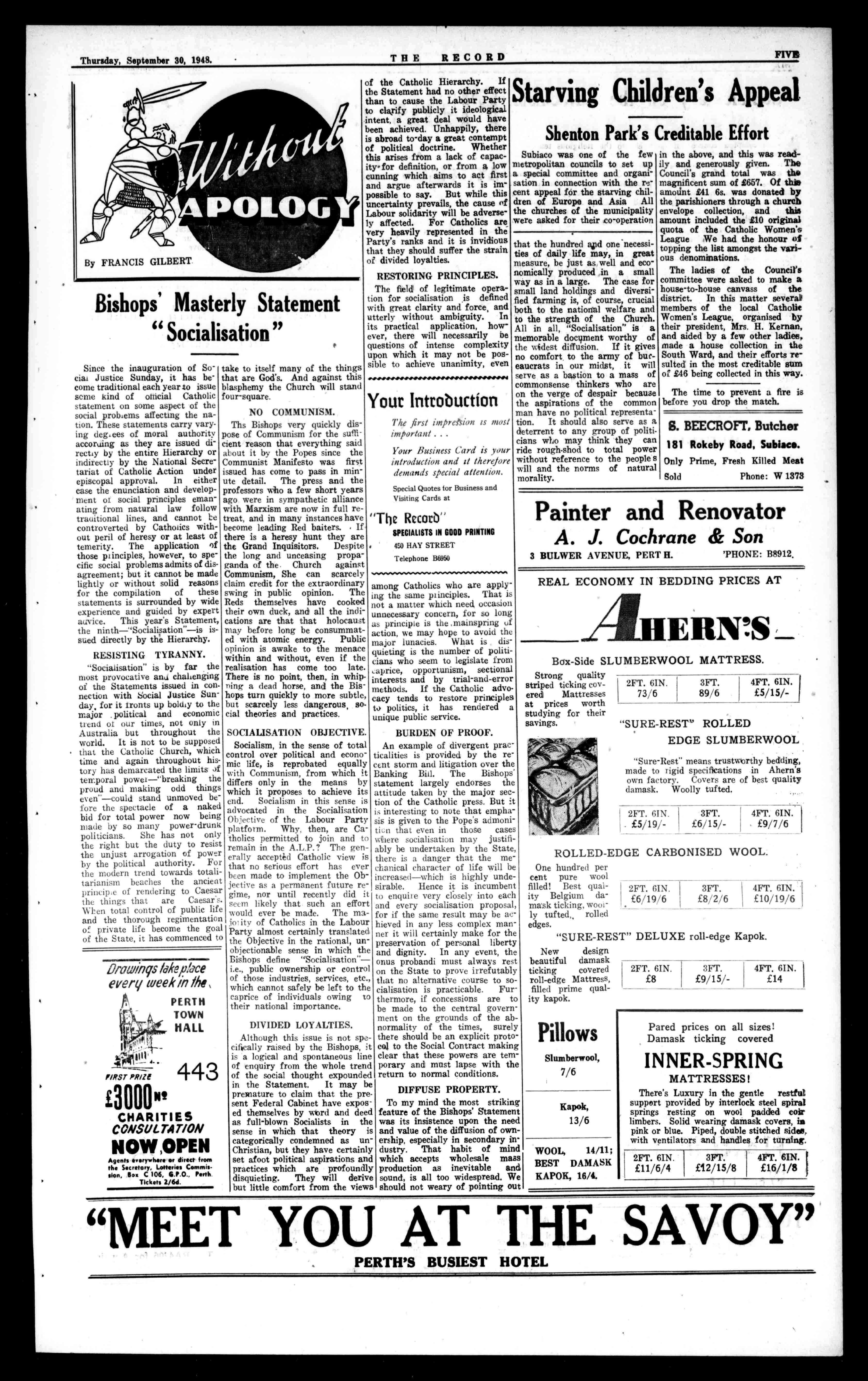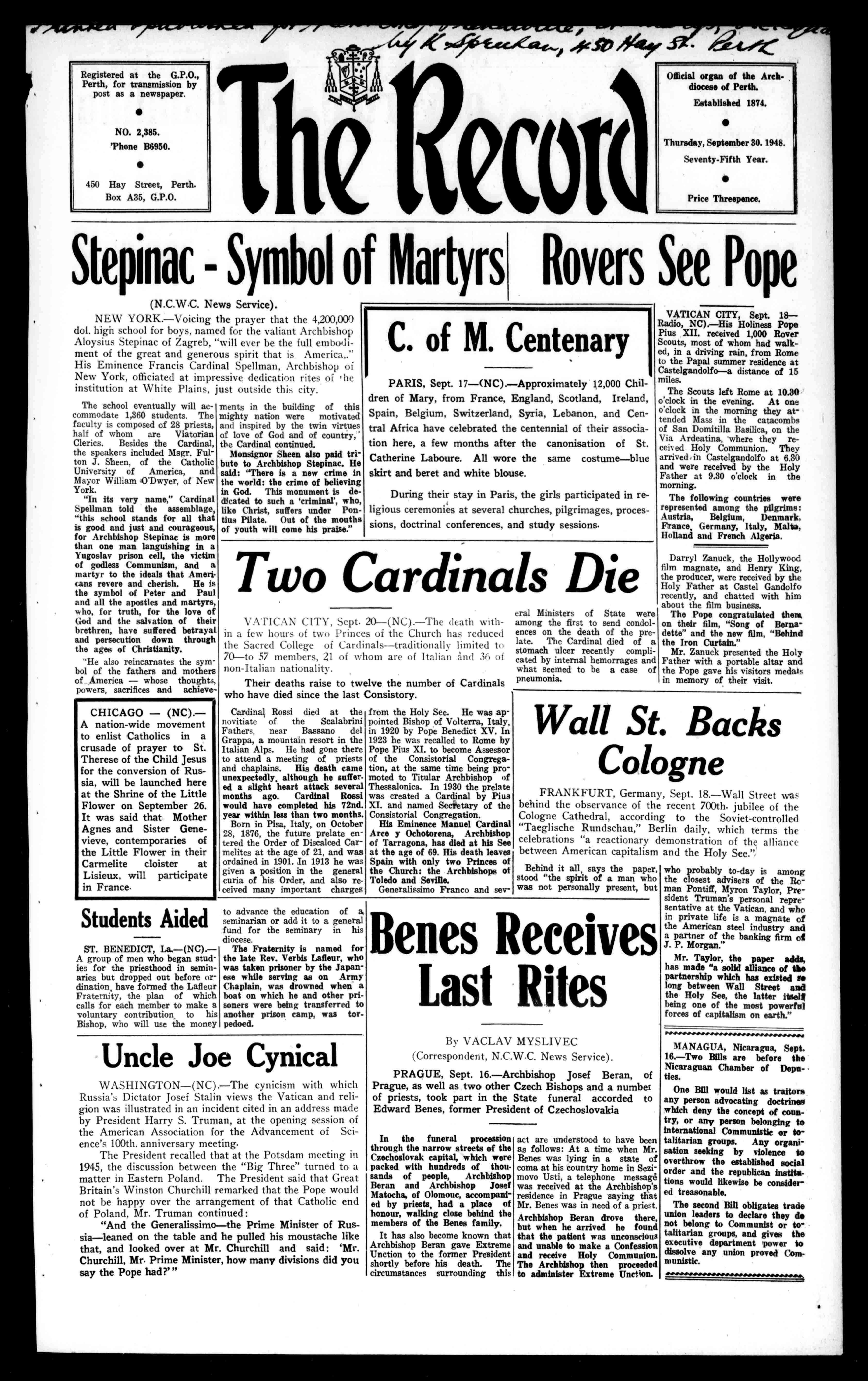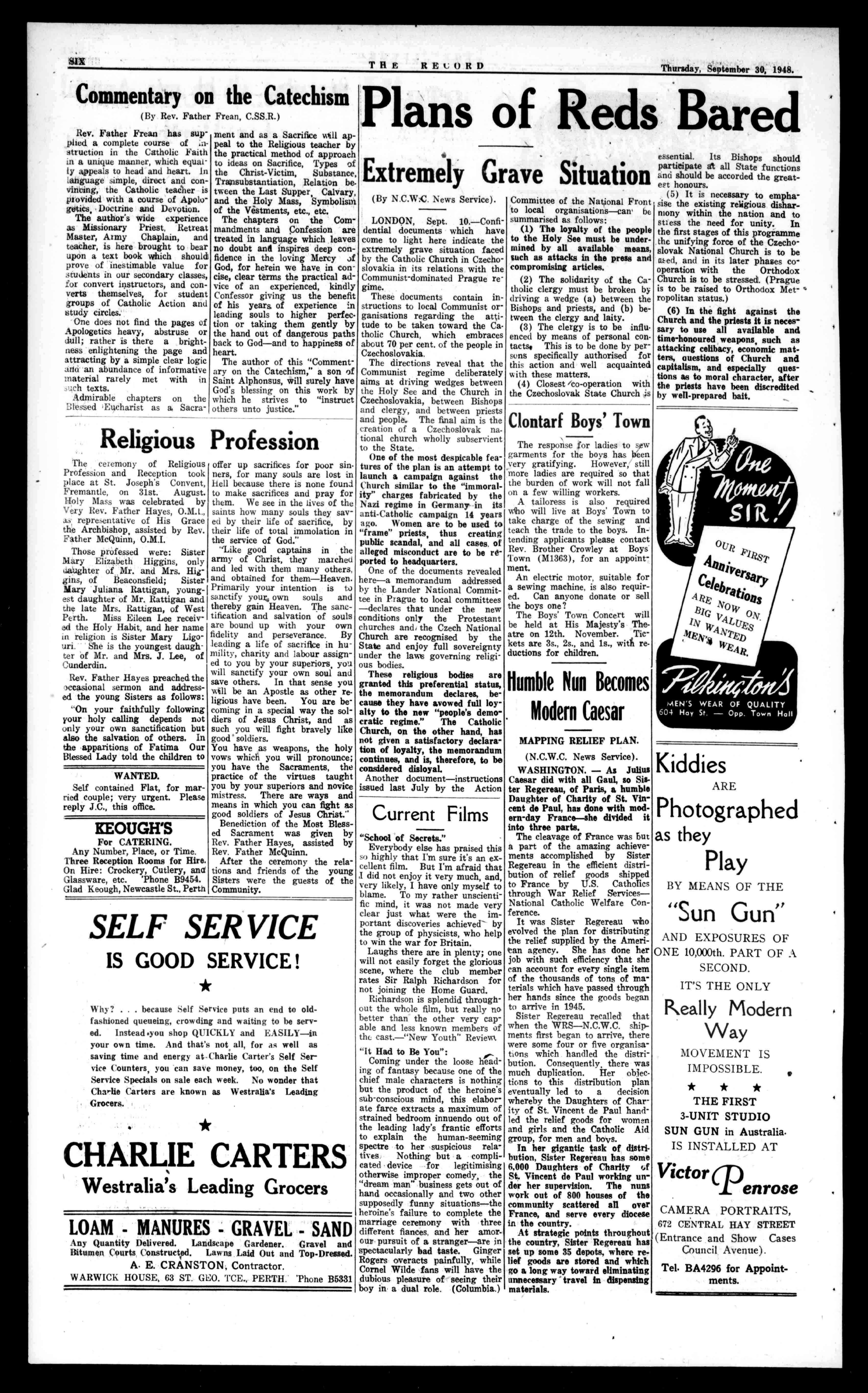 RegisteredattheG.P.O., Perth,fortransmissionby postasanewspaper. NO.2,385. 'Phone116950. 450HayStreet,Perth. BoxA35,G.P.O. RCCOT OfficialorganoftheArchdioceseofPerth. Established1874. Thursday,September30.1948. Seventy-FifthYear. PriceThreepence.