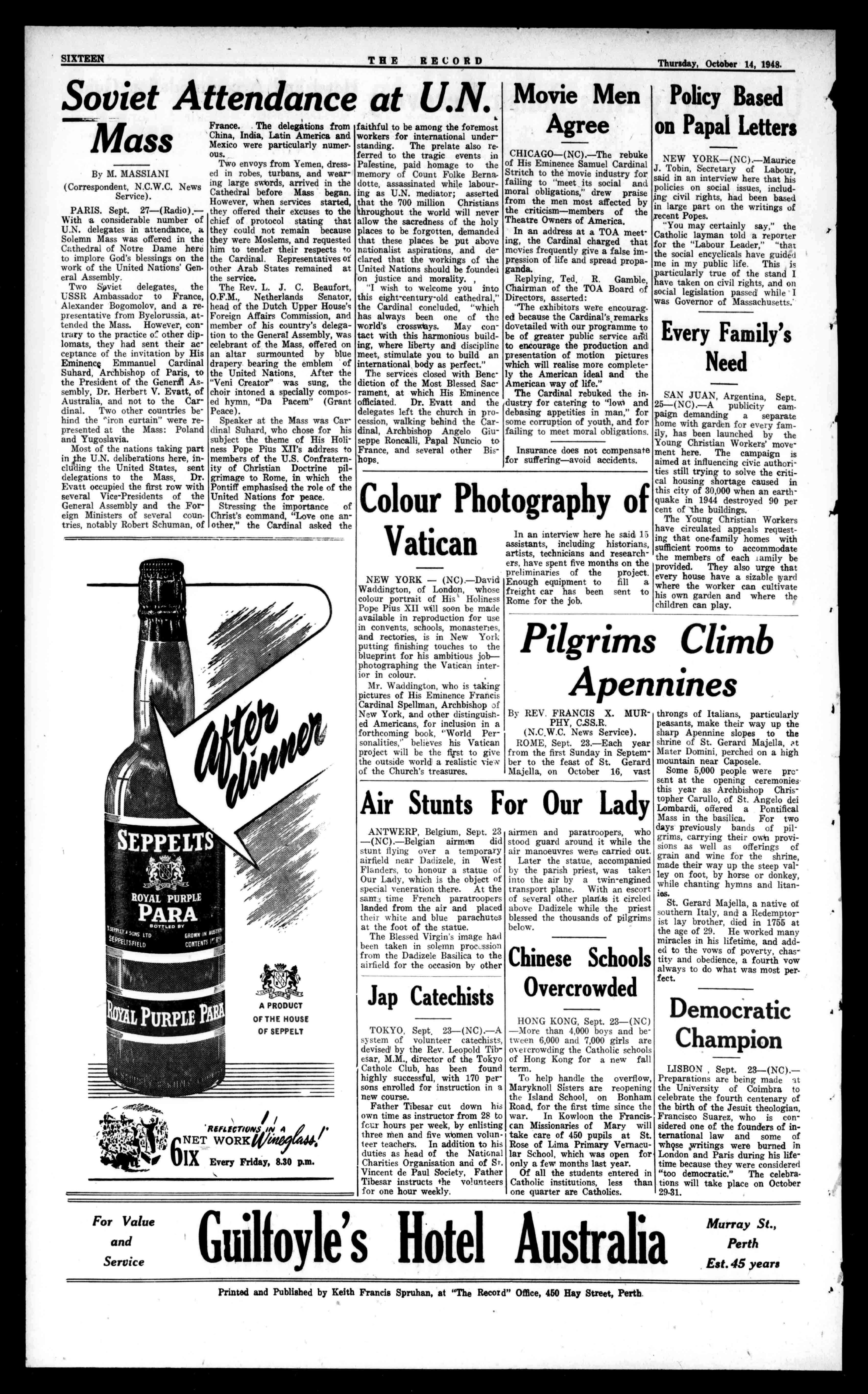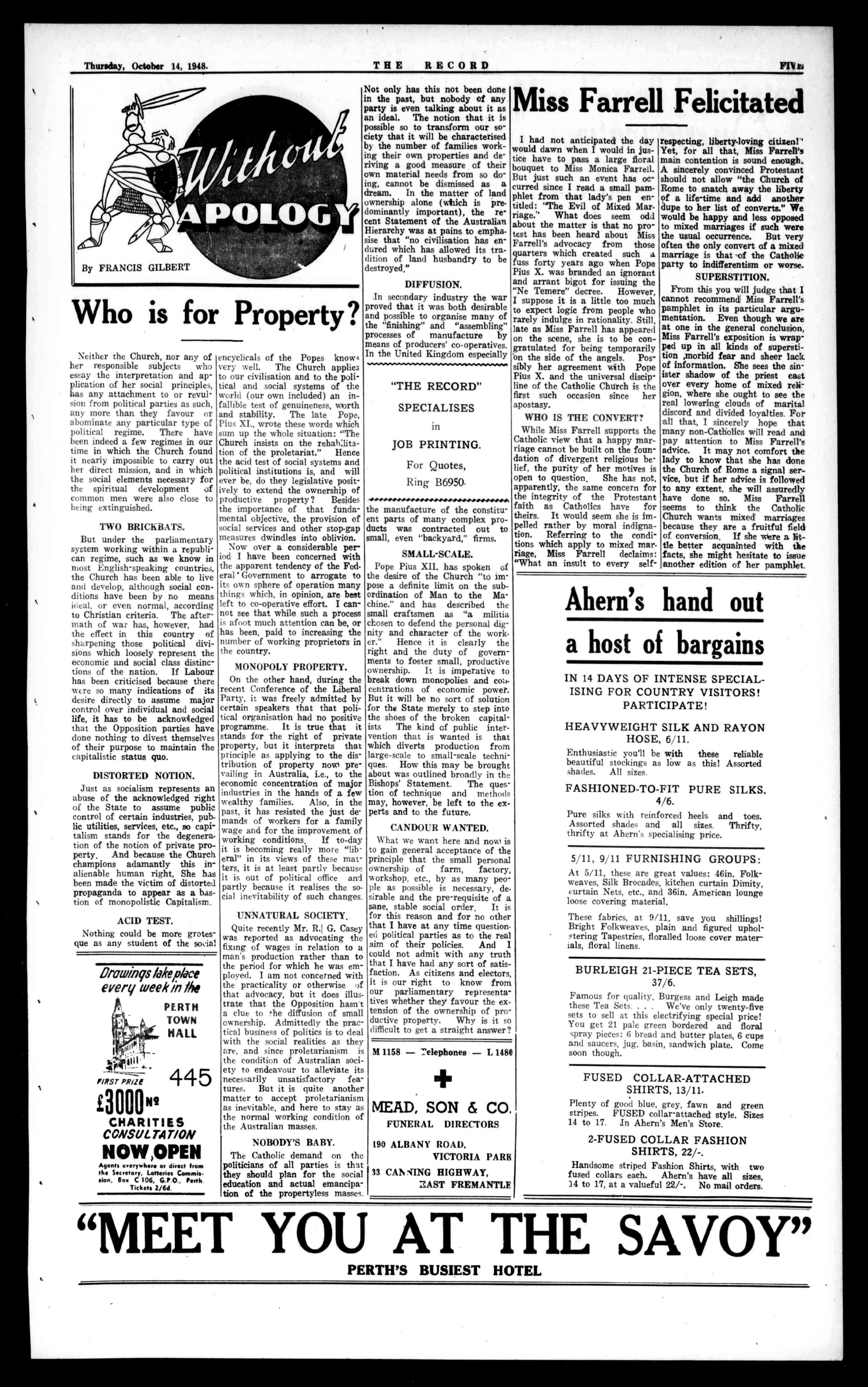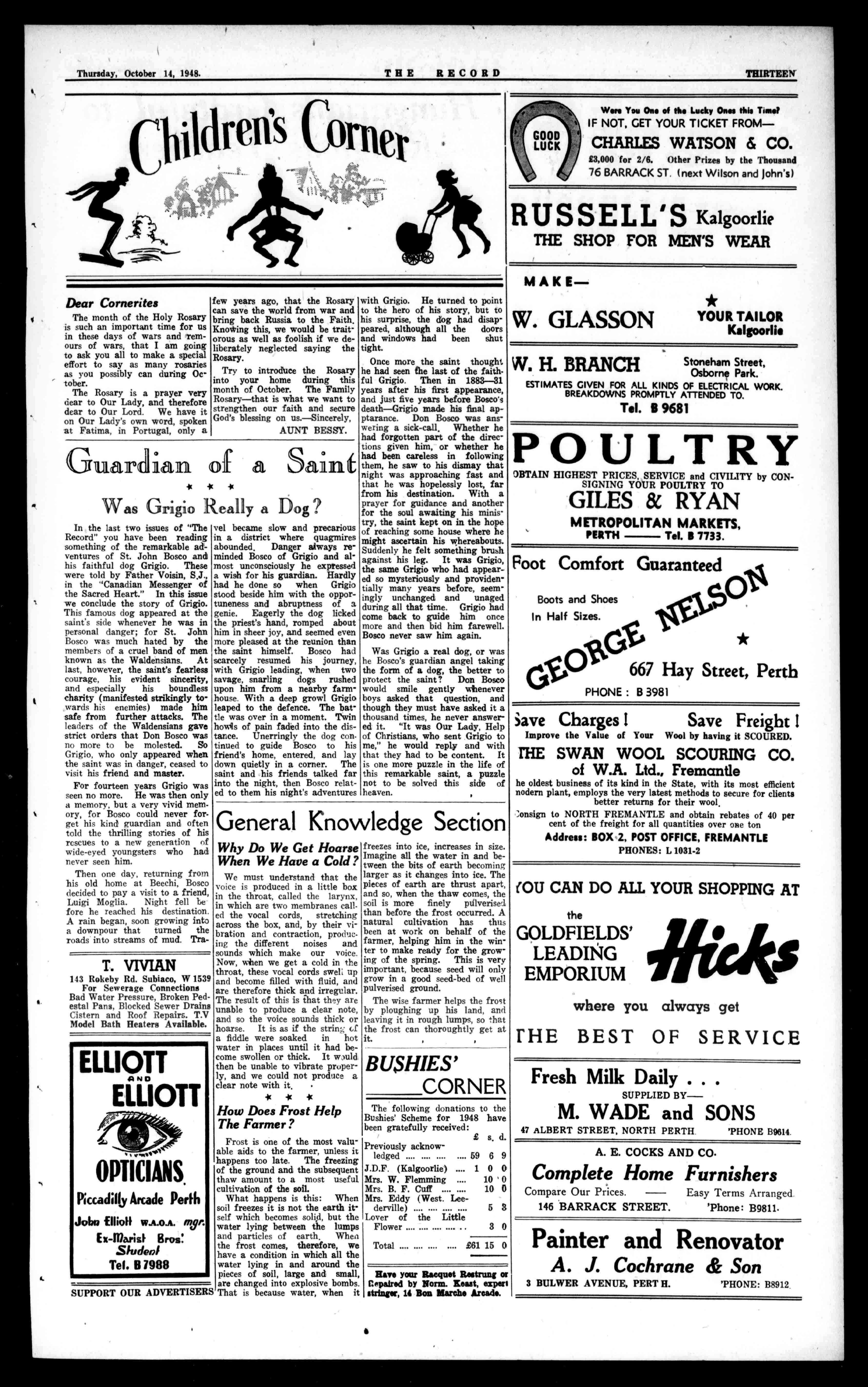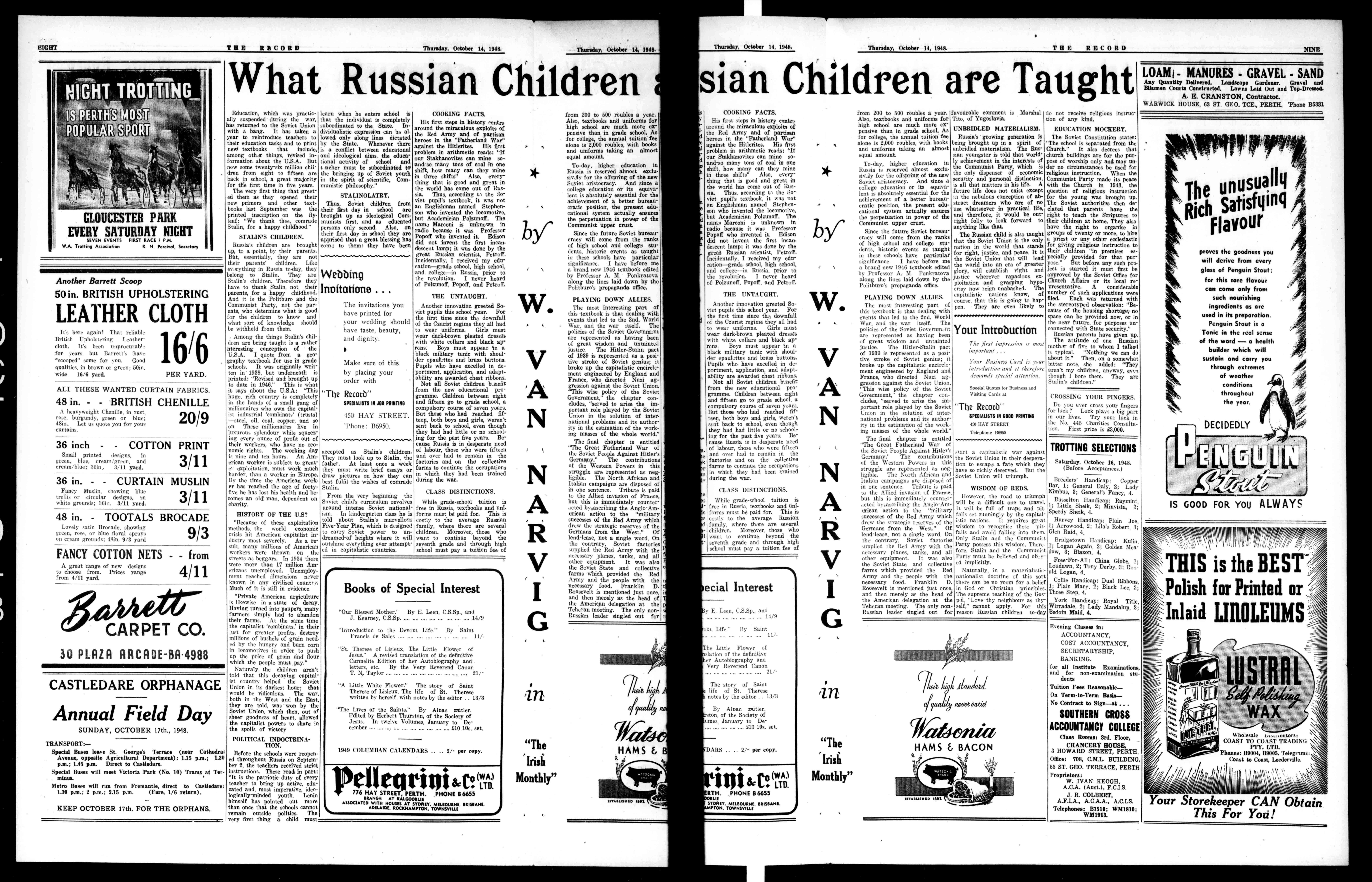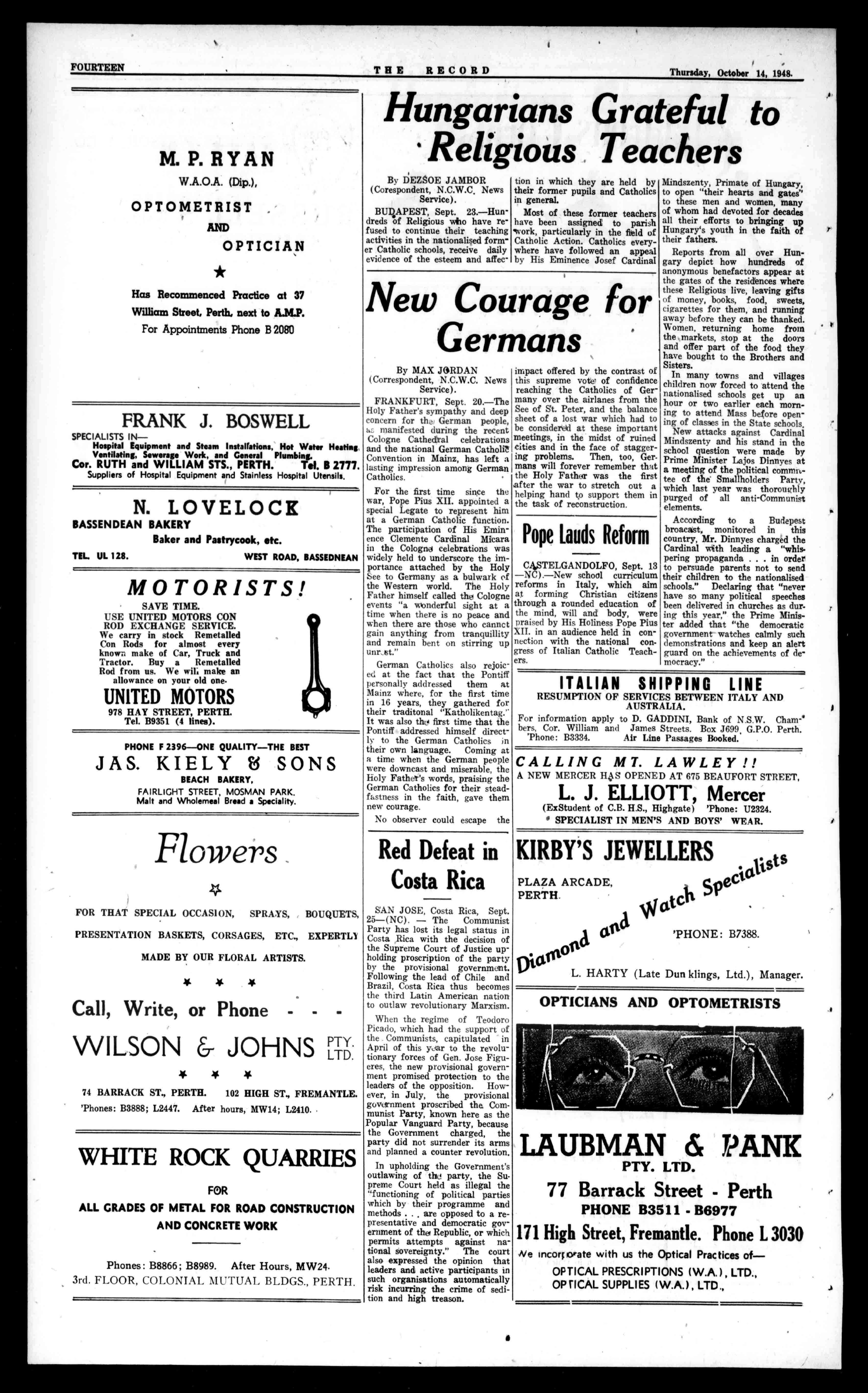 1111.", d MI ...or or Ariifr /40IL totA RegisteredattheG.P.O., Perth,fortransmissionby postasanewspaper. NO.2,387. 'PhoneB6950. 450HayStreet,Perth. BoxA35,G.P.O. 1.11 ecot Ti4 OfficialorganoftheArchdioceseofPerth. Established1874. Thursday,October14,1948. Seventy-FifthYear.PriceThreepence,