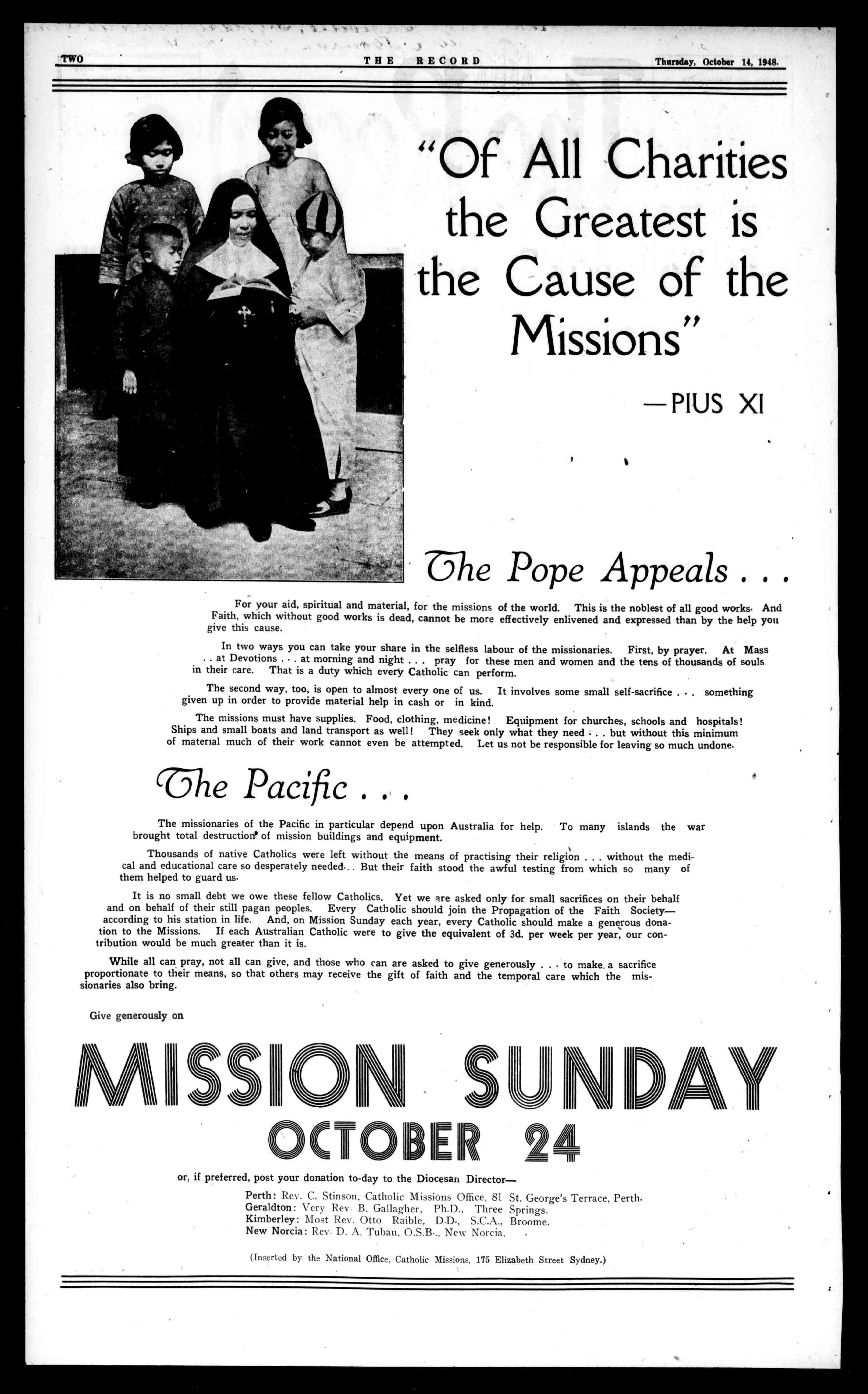 ItisnosmalldebtweowethesefellowCatholics.Yetweareaskedonlyforsmallsacrificesontheirbehalf andonbehalfoftheirstillpaganpeoples.EveryCatholicshouldjointhePropagationoftheFaithSociety- accordingtohisstationinlife.And,onMissionSundayeachyear,everyCatholicshouldmakeagenerousdonationtotheMissions.IfeachAustralianCatholicweretogivetheequivalentof3d.perweekperyear,ourcontributionwouldbemuchgreaterthanitis.