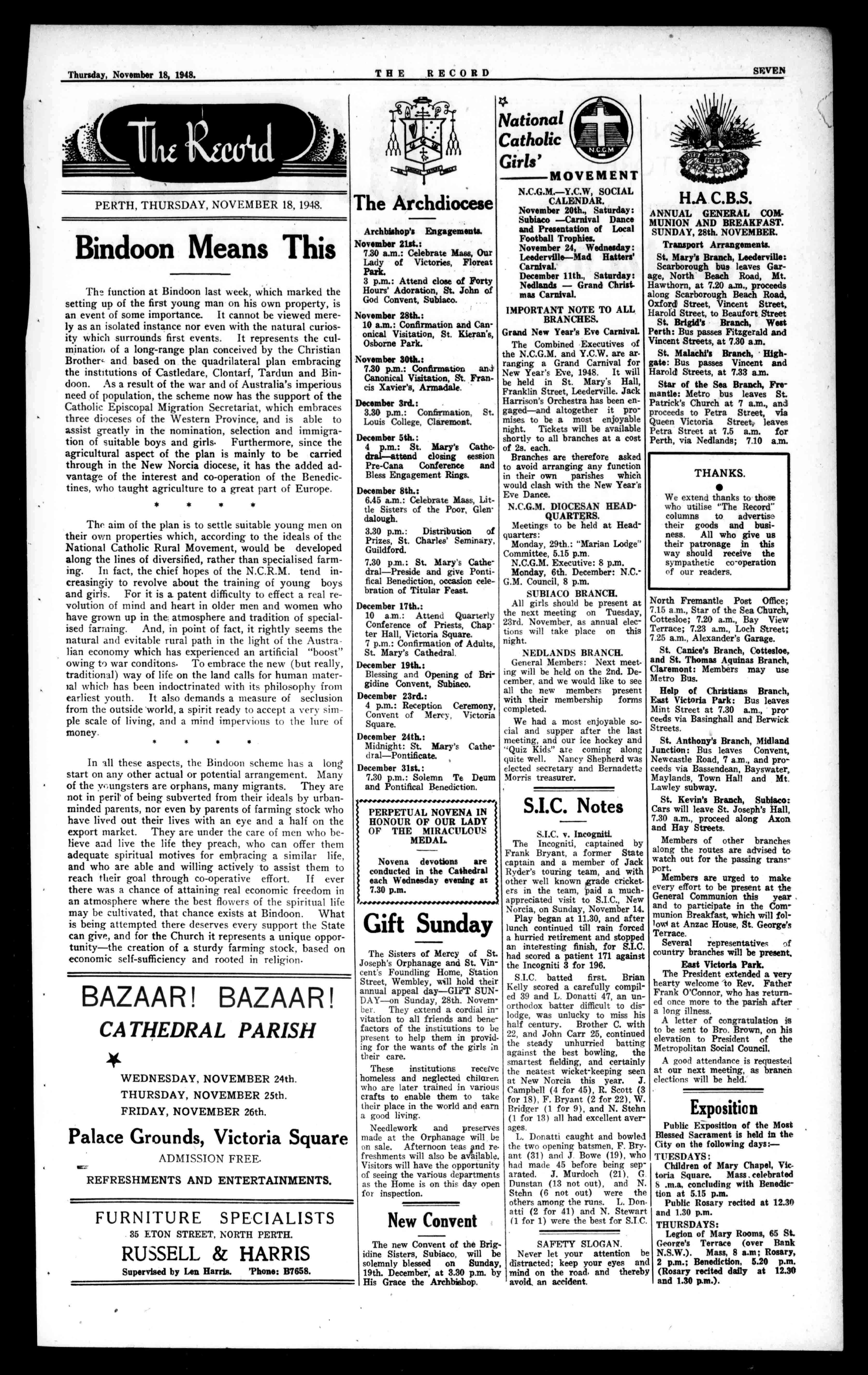 Whenpurchasinggoods thatareadvertisedin "TheRecord,"letthe Al_rchantknow'thatyou readhisannouncement. Itisonlynaturalthatthe advertiserwouldliketo knowwhetherhisadvertisementsareshowingany return organisationforthespiritualand temporalwelfareofseamen.His entiretourwillbeonmerchant ships,andhewillfollowthe usualcustomofsigningonasan honorarymemberoftheship's company. OfseamenwhowerebornCatholics,theArchbishopsaid: "Notewellthatiftheoccasion ofthegiftofFaithtothemwas notaKathleentheyhadmetit wasprobablysomeKathleen theirfathershadmet.Insome casesKathleenorsomebodyhad slippedupandtheMasstoher sonsmeantlittleornothing.