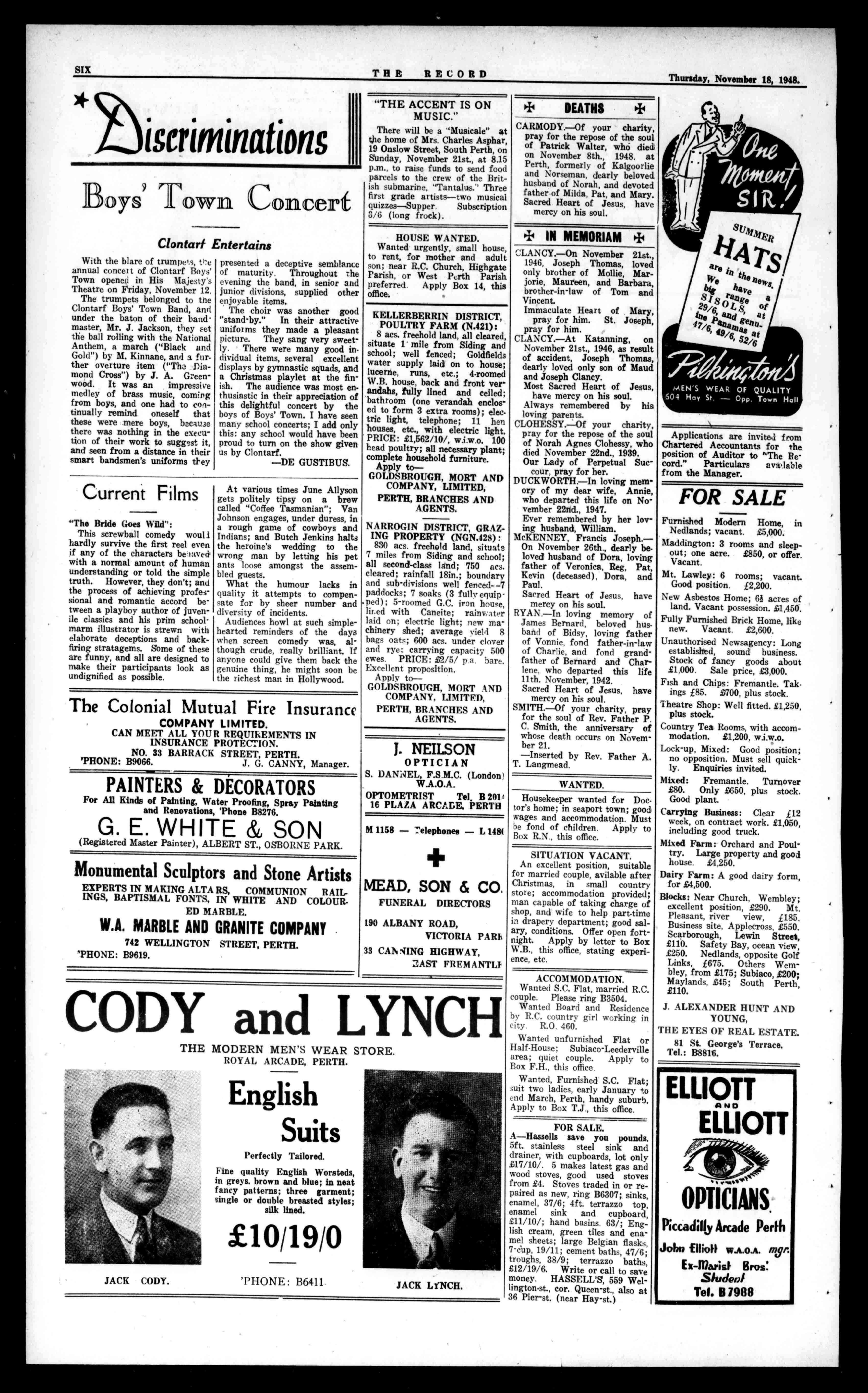 advertisingcopyfortheChristmas NumberwillnotbereceivedlaterthanDecember1. VINWHITE,PROPRIETOR. CALL 83488 \1\V123 wiUmTOPTAXI 10WESTTAXMFAAES 71" INWESifRNAUSTRALIA ,wiTHCOMFORTANDSECURITY CALL R3488 MW123 Premierribro-PlasterWorks BraidStreet(offNewcastleStreet) EastPerth QUOTATIONSGIVENFORFIRSTQUALITYPLASTER, BOARD. SuppliedOnly,orSuppliedandFixedAnywhereinW.A. LatestDesigns.LowestPrices. NOPERMITREQUIRED Ring,WriteorCall. 'PHONEB3555. J.P.BOURKE,Proprietor.
