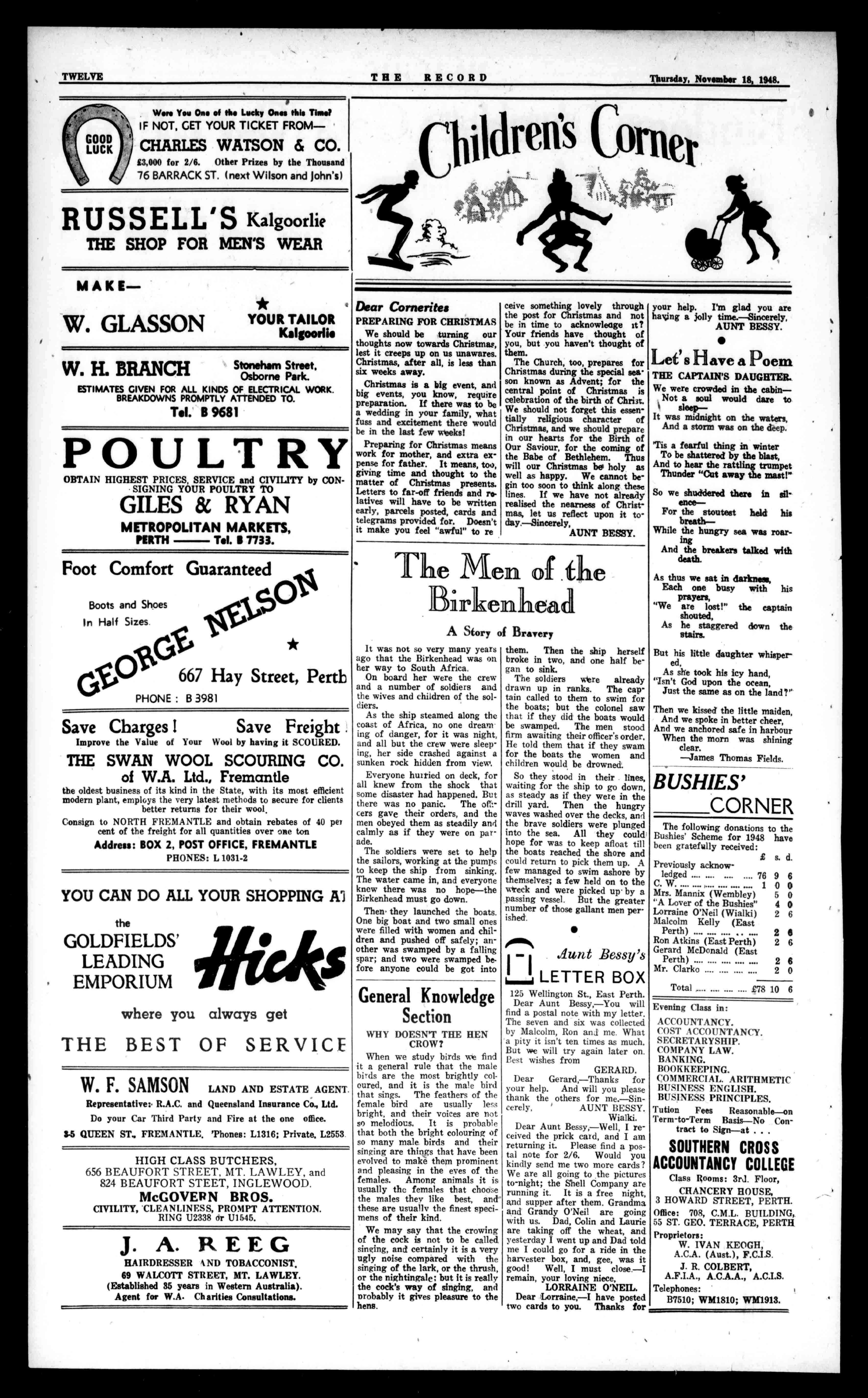J.McHENRY,Proprietor. Star&GarterHotel BERTSTARR-Proprietor Cnr.HANNANandNETHER. CO1TSTS.,KALGOORLIE RodBeaton's Hannah'sHotel HANNANSTREET KALGOORLIE SHENTONPARKHOTEL CORNERNICHOLSONAND DERBYROADS. FIRSTCLASSACCOMMODATION. W.N.LIGHTLY,Proprietor. 'Phone:W2170. SPENDYOURWINTERHOLIDAYSONTHEGOLDFIELDS AT AUSTRALIAHOTEL KALGOORLIE. (OneminutefromSt.Mary's Church). M.J.DILLON,Licensee. 'Phone:13.Box124. SUBIACOHOTEL, SUBIACO. FIRSTCLASSACCOMMODATIONANDSERVICE. 'PHONE:W1028. C.ROPER,Proprietor. 0A HIRE PURCHASE SERVICE Enablesyou toenjoy manyneededcommoditiesthat mighttakeyoulongmonthsof savingstoprocure.ForonFoy's HirePurchaseServiceyoupay justasmalldeposit,thenweekly payments whileallthetime youenjoythecomfortandcompanionshipofsucharticleslisted below.WhynotuseitNOW" AtPresenttheFollowing CommoditiesareAvailable Furniture Carpets Vacuum Cleaners IceChests Radios Cutlery Cabinets 'sue-THEGENERALAGENCYCO PHONESB8838,1155717 29A-30PADBURYBLDGS. PRIVATEWM2223 S FORRESTPLACE SWORNVALUATORS&ESTATEAGENTS PERTH'SLEADING HOTEL&BUSINESSBROKERS