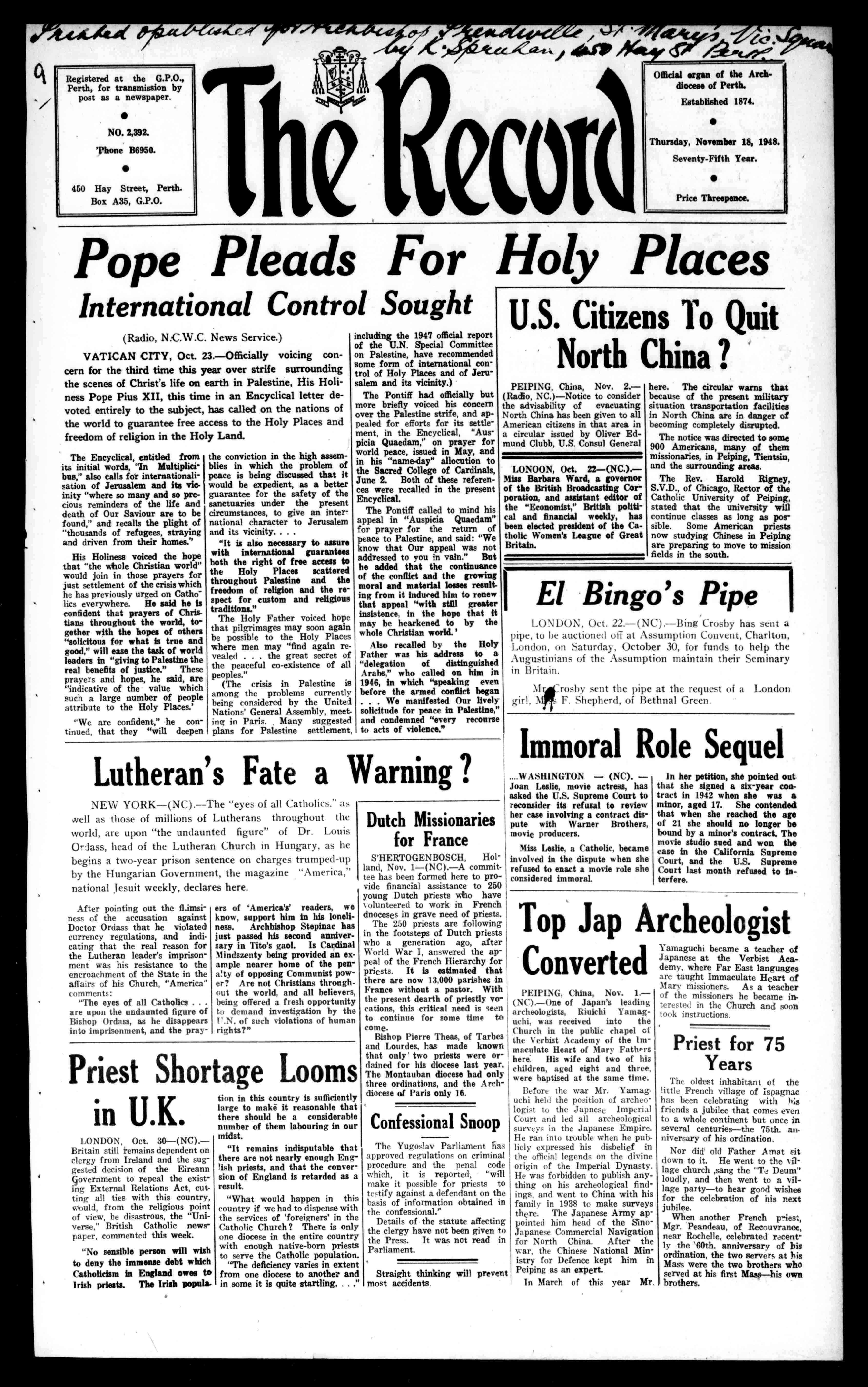 / ./ err.477.71rdeRr RegisteredattheG.P.O., Perth,fortransmissionby postasanewspaper. NO.2,392. 'PhoneB6950. 450HayStreet,Perth. BoxA35,G.P.O. 7 ,P,I-44e 4011PMar7rAtI7' 111. 4Il CCOT OfficialorganoftheArchdioceseofPerth. Established1874. Thursday,November18,1948. Seventy-FifthYear. PriceThreepence.