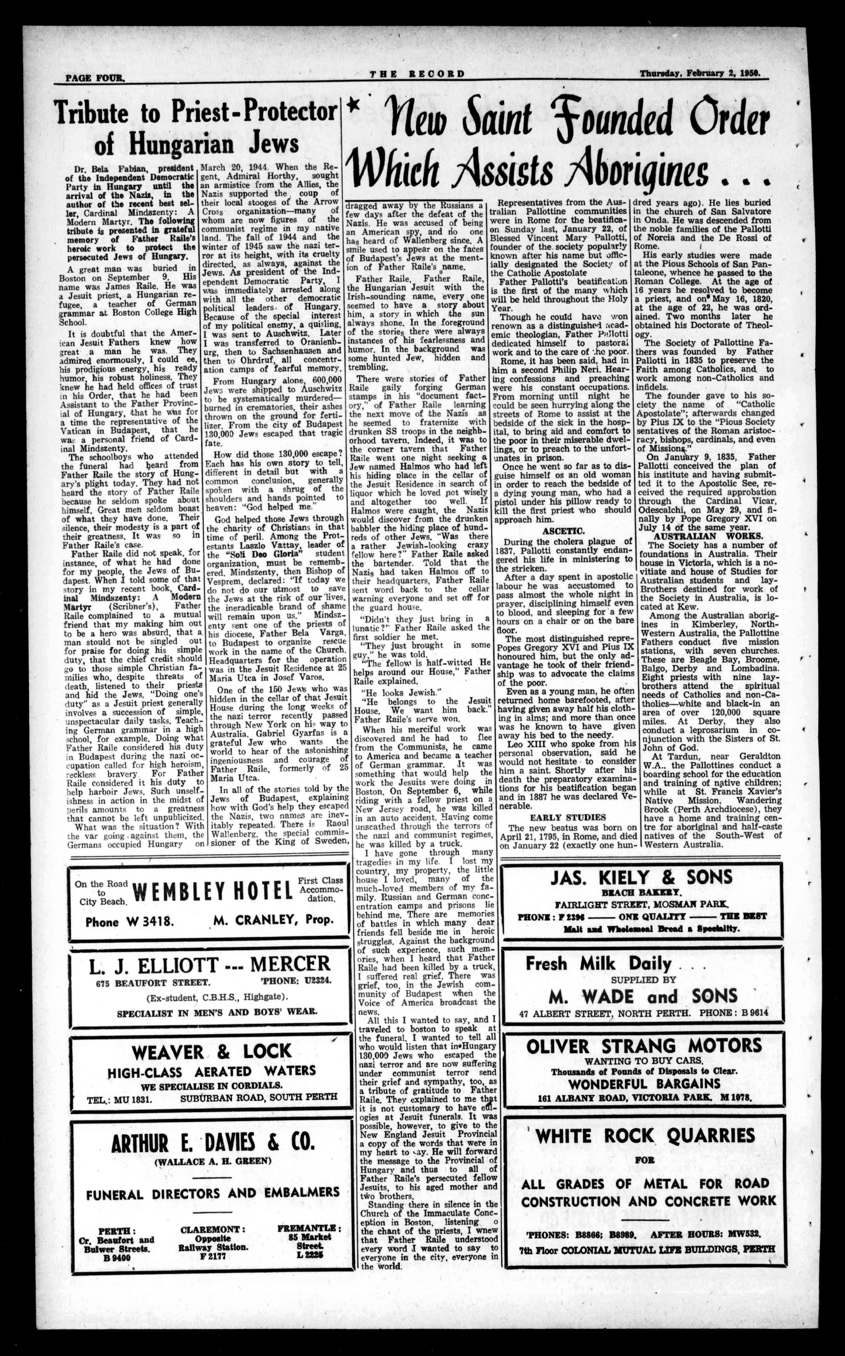 airpe, RegisteredattheG.P.O., Perth,fortransmissionby postasanewspaper. NO.2,452. PHONEBA2837 (2Lines) 450HayStreet,Perth. BoxA35,GPO. dry- 74eed /f<P444e-0,Asa ReCOT D41/4 ir-w-Apr,P10011reiPP. OfficialorganoftheArchdioceseofPerth Established1874. THURSDAY, FEBRUARY2,1950. Seventy-sixthYear. PriceThreepence