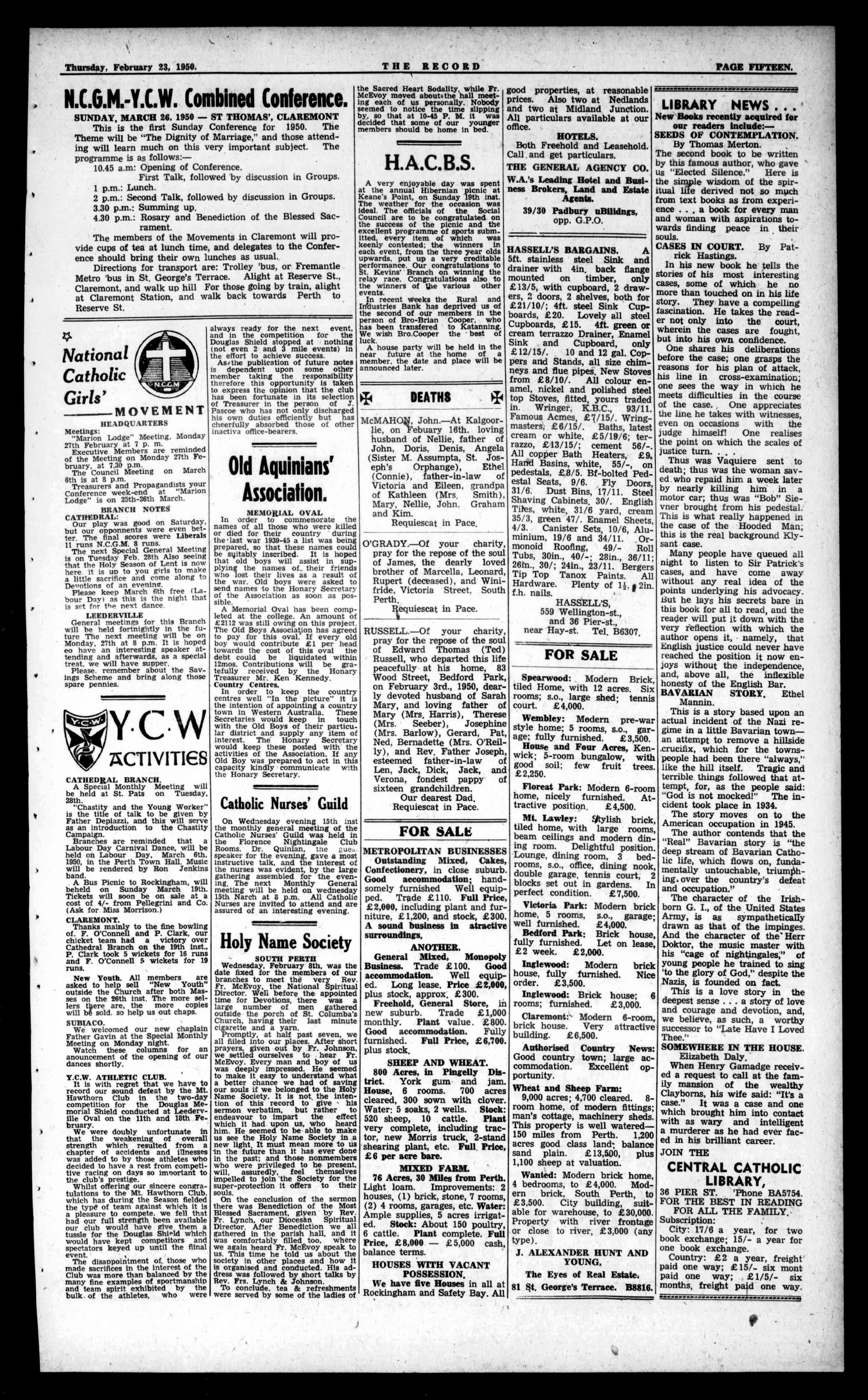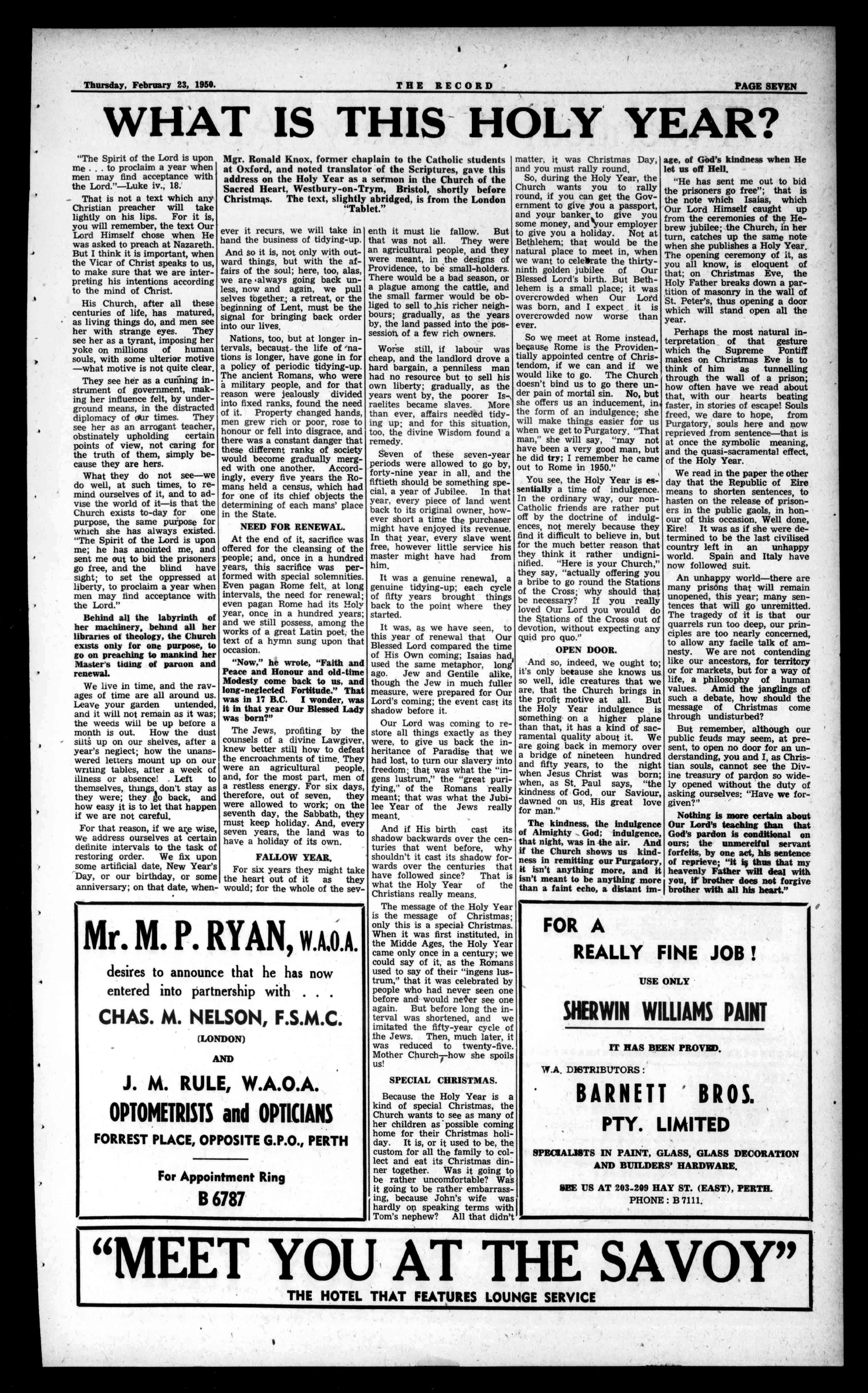 Wednesday,February8th,wasthe datefixedforthemembersofour branchestomeettheveryRev. Fr.McEvoy,theNationalSpiritual Director.WellbeforetheappointedtimeforDevotions,therewasa largenumberofmengathered outsidetheporchofSt.Columba's Church,havingtheirlastminute cigaretteandayarn. Promptly,athalfpastseven,we allfilledintoourplaces.Aftershortprayers,givenoutbyFr.Johnson, wesettledourselvestohearFr. McEvoy.Everymanandboyofus wasdeeplyimpressed.Heseemed tomakeiteasytounderstandwhat abetterchancewehadofsavingoursoulsifwebelongedtotheHoly NameSociety.Itisnottheintentionofthisrecordtogivehis sermonverbatim,butratherto endeavourtoimparttheeffect whichithaduponus,whoheard him.Heseemedtobeabletomake usseetheHolyNameSocietyina newlight,Itmustmeanmoretous inthefuturethanithaseverdone inthepast;andthosenonmemberswhowereprivilegedtobepresent, will,assuredly,feelthemselves impelledtojointheSocietyforthesuper-protectionitofferstotheir souls.