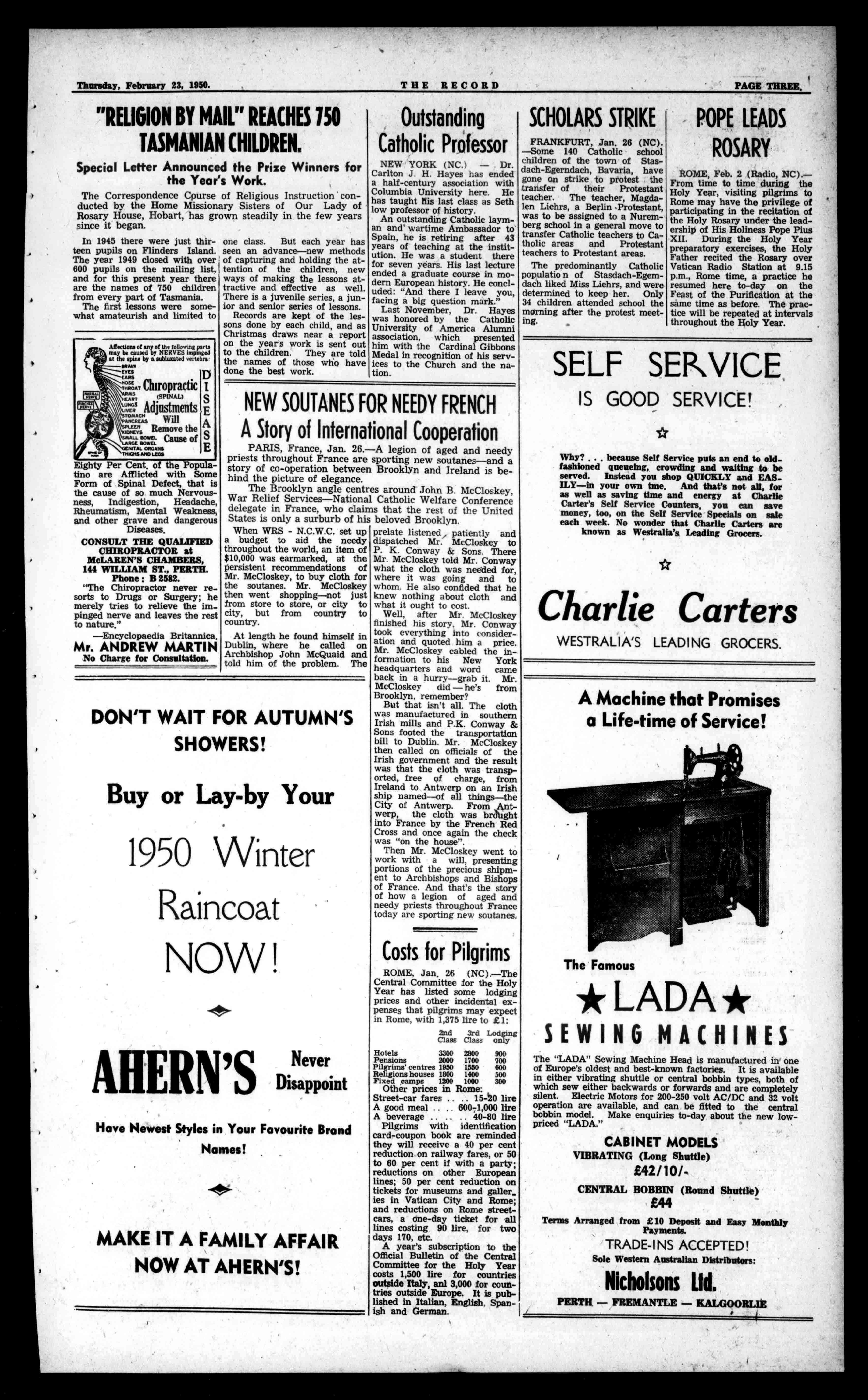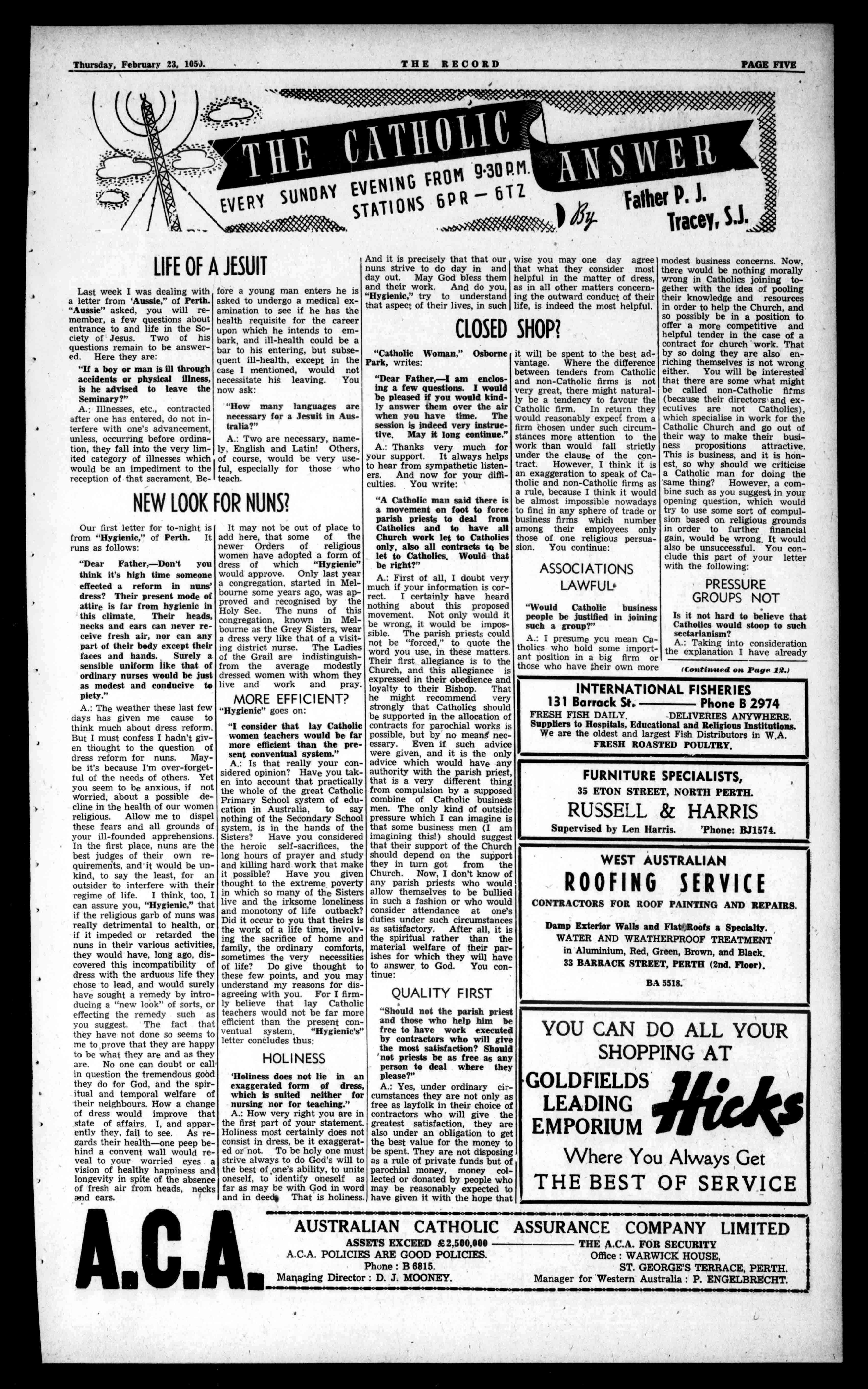 Inthefieldofmissionaryactivitytheirachievementsareno lessspectacular.Thehistory oftheCatholicChurchinAustraliaisaproudrecordofthe apostoliczealofhermissionaries-Priests,NunsandBrothers -whoundertookvoluntaryexile toestablishandextendthe KingdomofChristintheantipodes.ItisclaimedthatIreland'smostvalvalAexport commodityishermissionaties; inthelightofeternity,this claimiscertainlyjustified.Witnessthenumberlessspiritual sonsanddaughtersofSt.Patrickwhohavelefthomeand homelandtocarrythetorchof faithtothefar-flungmembers ofChrist'sflock.ToIreland, therefore,Australiaisindebted foraFaiththatisvigorousand vibrant,foraloveoftheFaith thatisself-sacrificingandmilitant,foraCatholiceducational systemthatissecondtonone. OurgainisAustralia'sgainhenceanationaldebt.