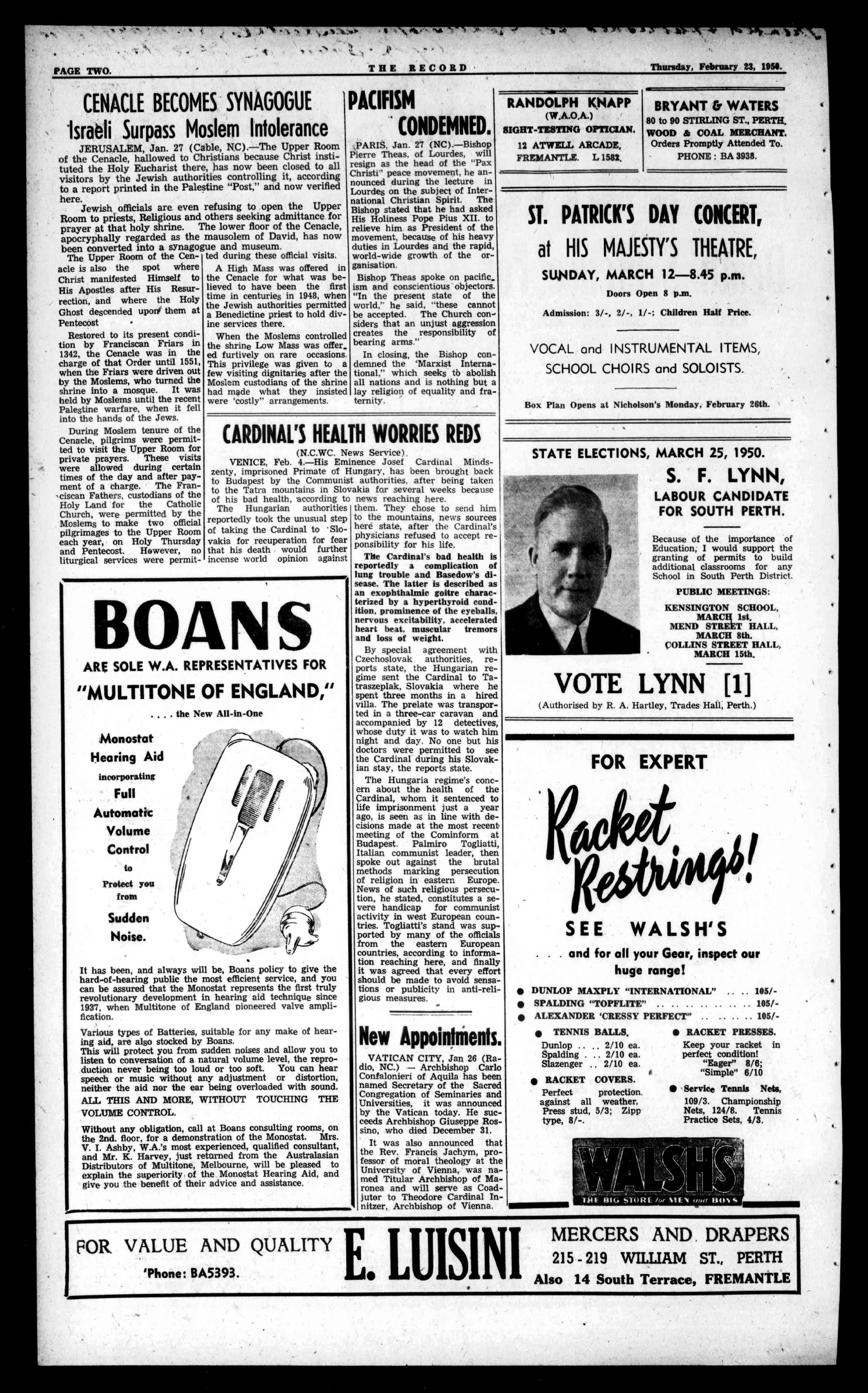 Withoutanyobligation,callatBoansconsultingrooms,on the2nd.floor,forademonstrationoftheMonostat.Mrs. V.I.Ashby,W.A.'smostexperienced,qualifiedconsultant, andMr.K.Harvey,justreturnedfromtheAustralasian DistributorsofMultitone,Melbourne,willbepleasedto explainthesuperiorityoftheMonostatHearingAid,and giveyouthebenefitoftheiradviceandassistance.